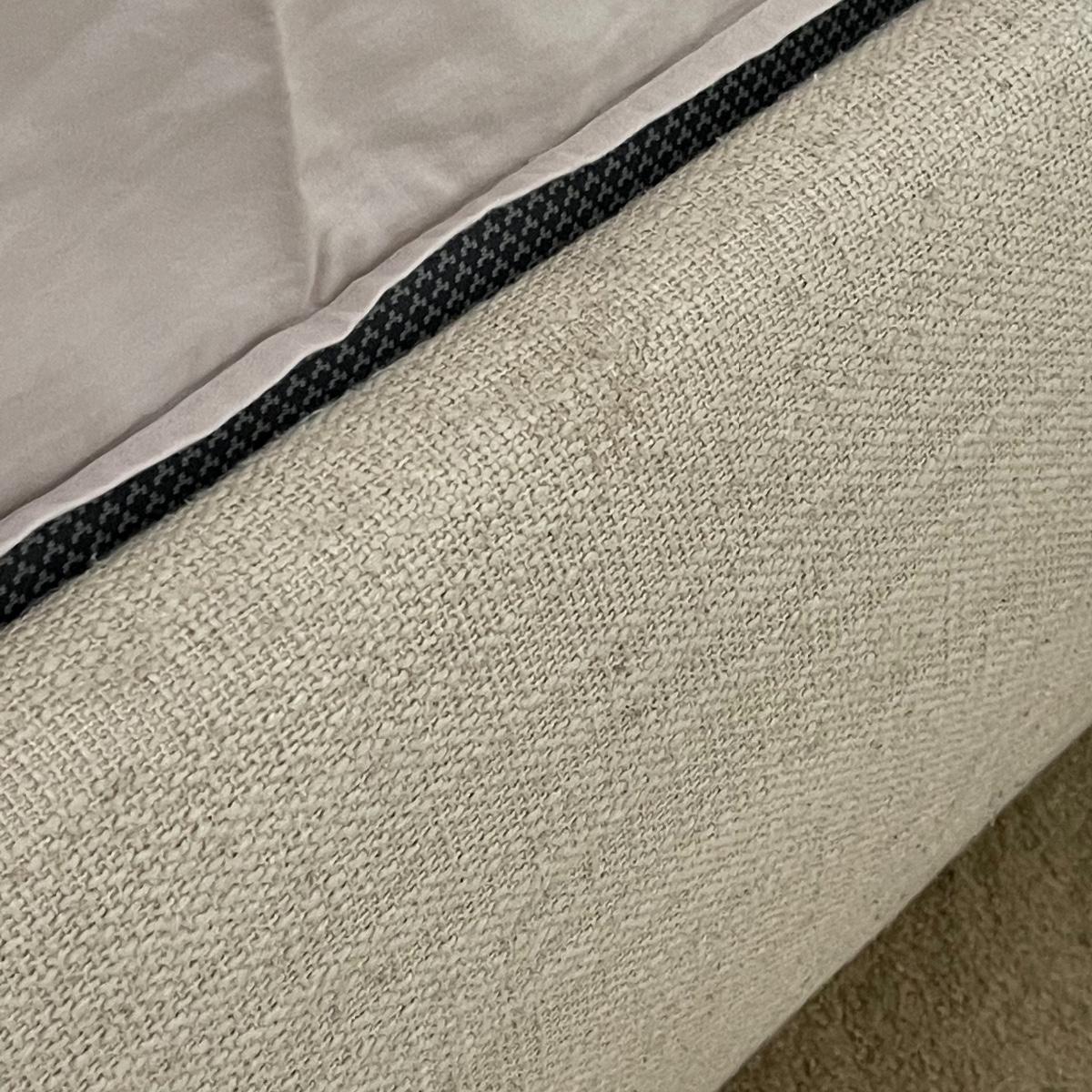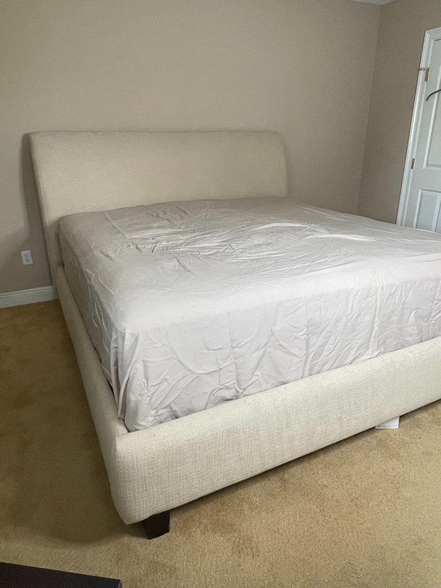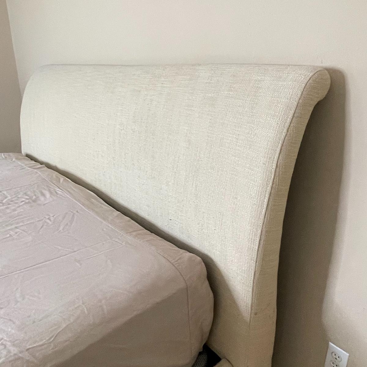 Very solid. Bed is cream/twill. Fabric has pilling from normal wear / Professional cleaning recommended. Pet and smoke free home. Mattress and Box Spring Not Included