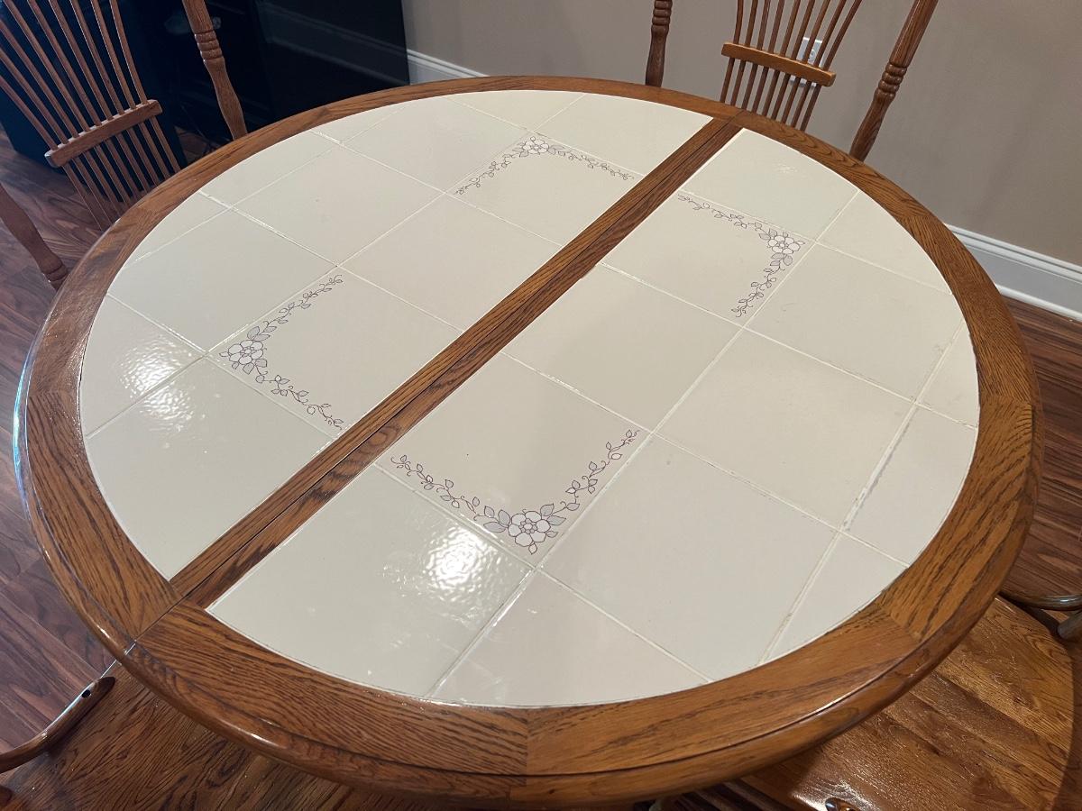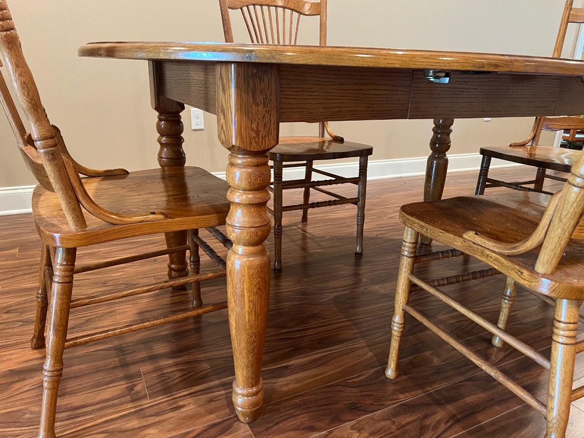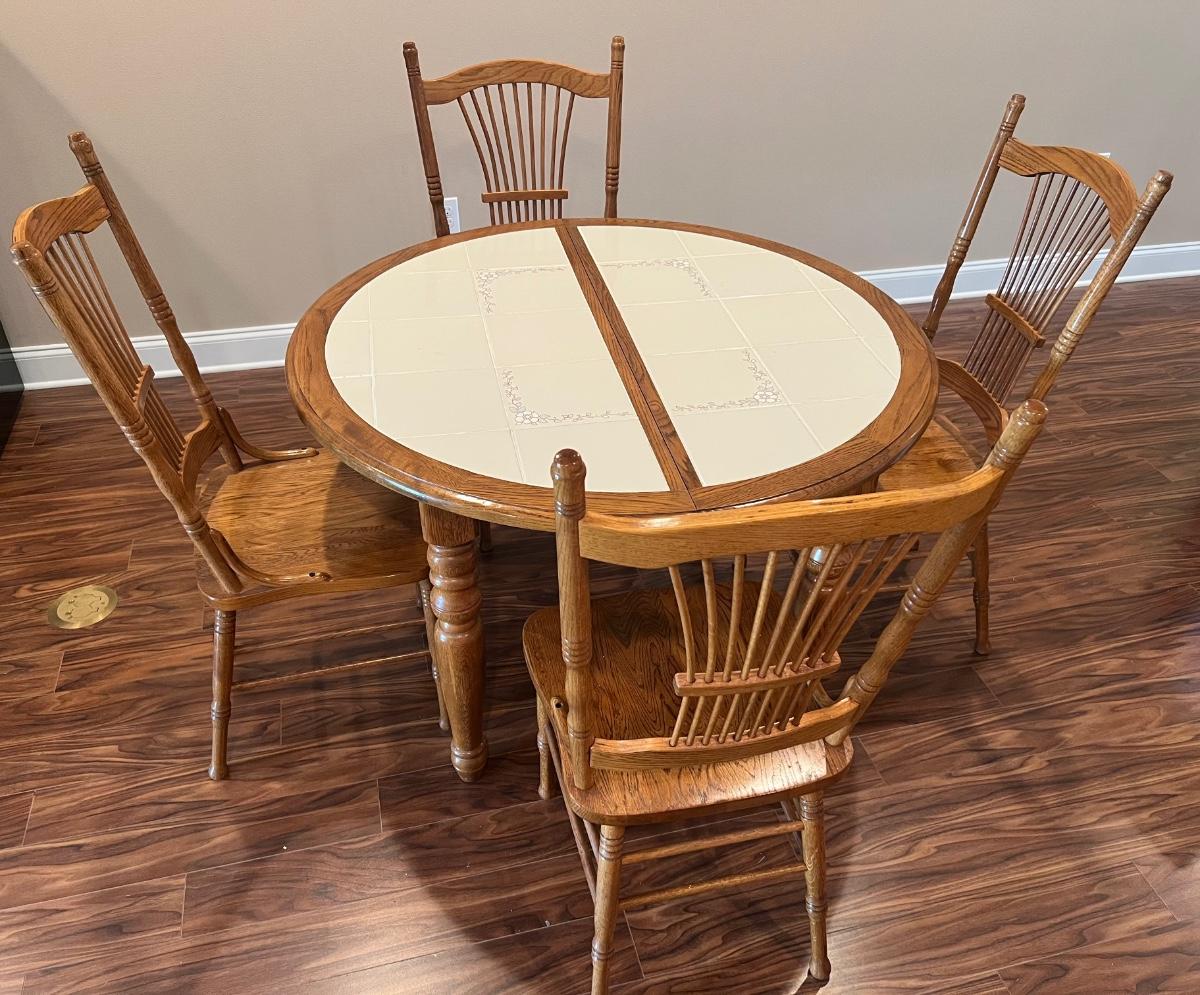 Measures 45” without leaf. 63” long with leaf. Leaf is 18” long. Great condition. Comes with 4 chairs.