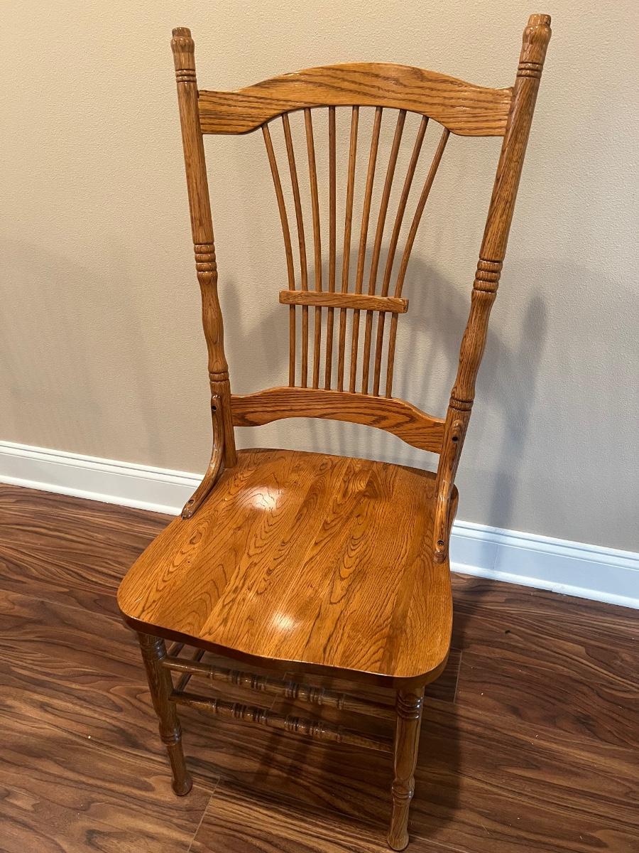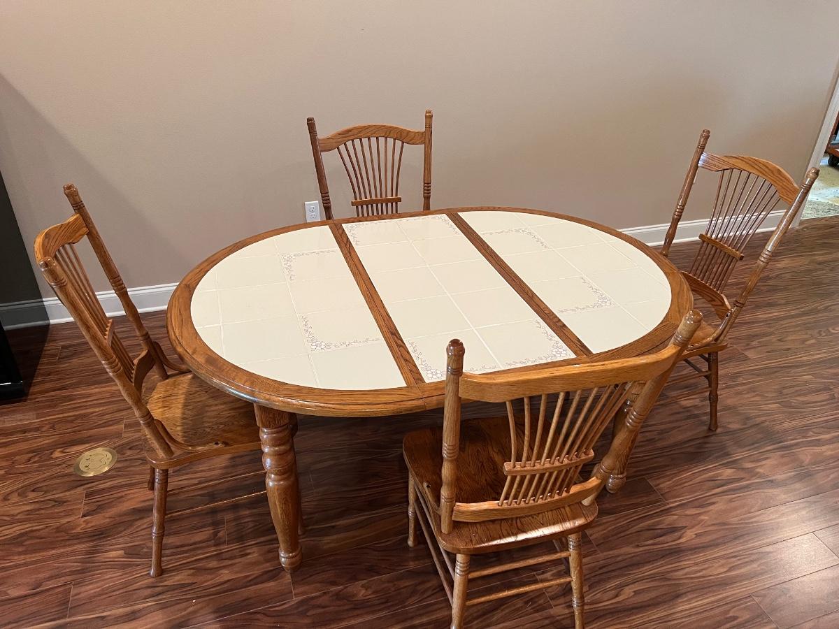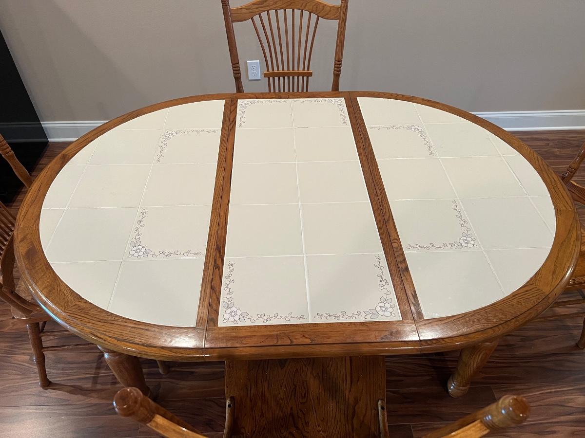 Measures 45” without leaf. 63” long with leaf. Leaf is 18” long. Great condition. Comes with 4 chairs.