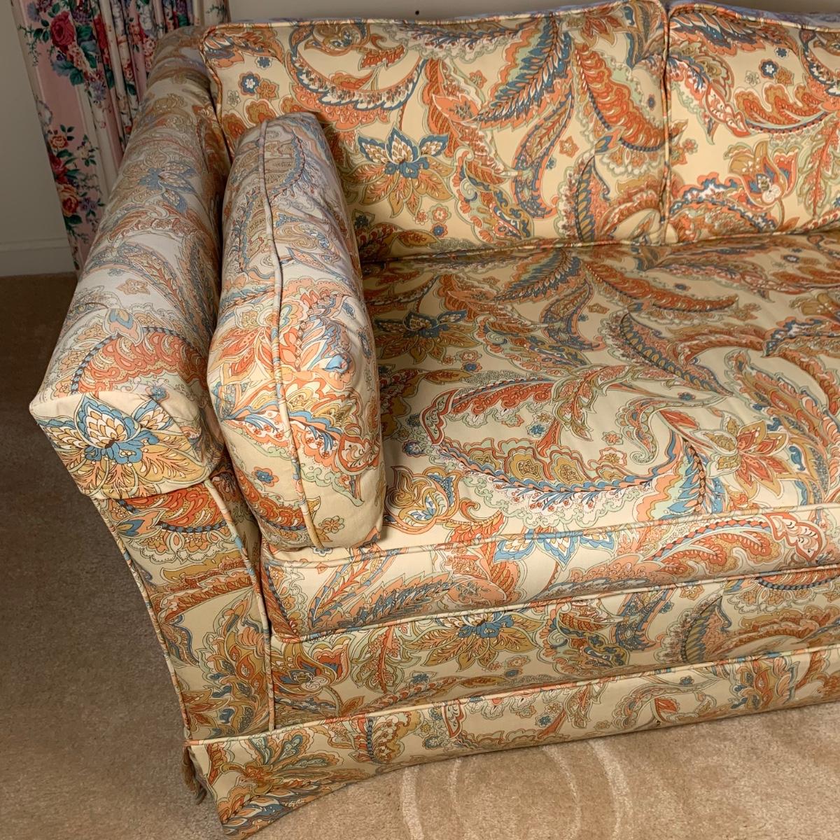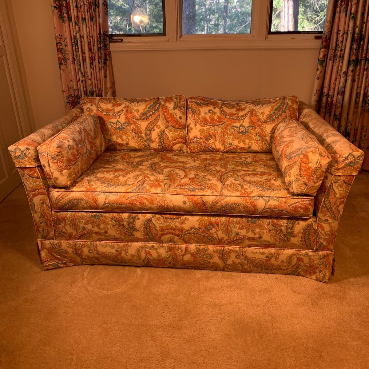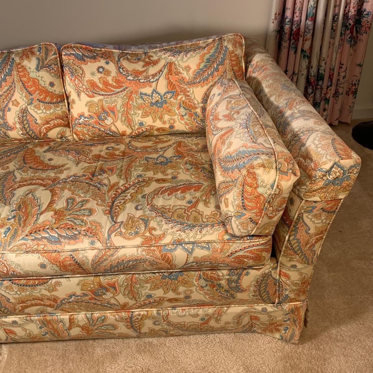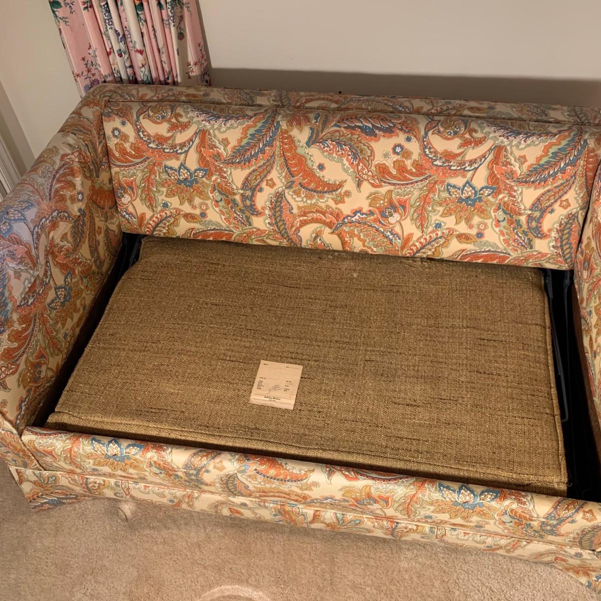 This Ashley Manor sleeper loveseat measures 59” x 35.5” x 25”H. It has armrest covers, two side pillows, and removable seat and back cushions. Its base color is beige and it has different shades of coral and blue in a paisley print (bad lighting in the room; closeup pictures show truer colors). The loveseat is on casters and easy to reposition. One armrest cover has a tear and they both are a little faded, but the armrests underneath are still vibrant. There is some fraying on the back of the seat cushion but it’s not visible when in place.