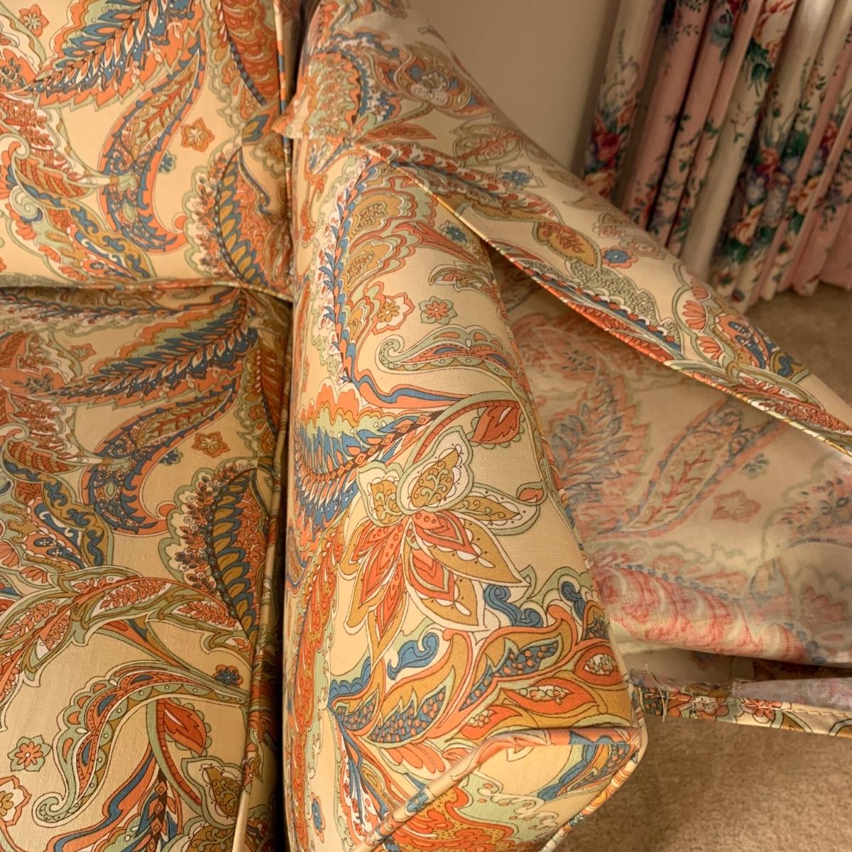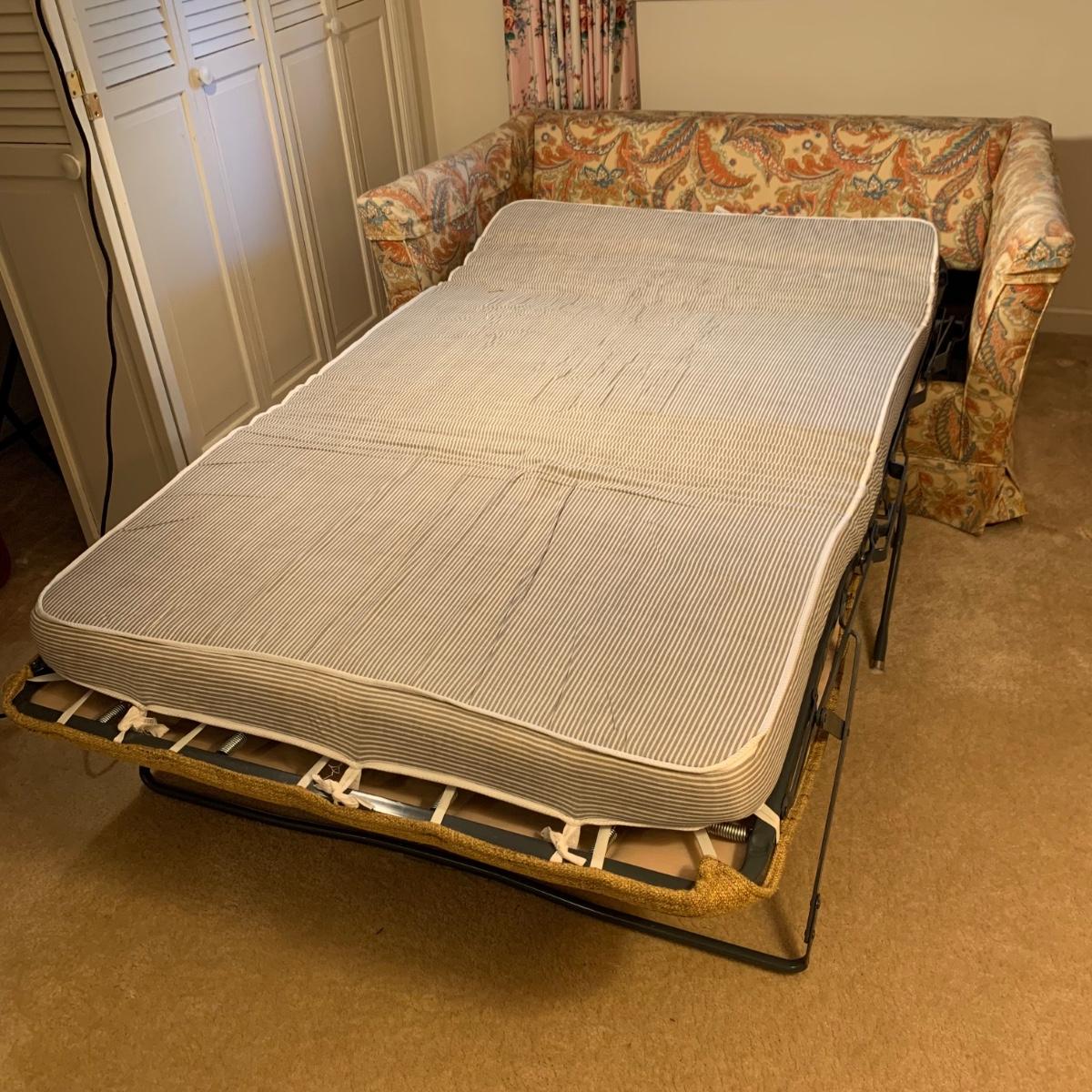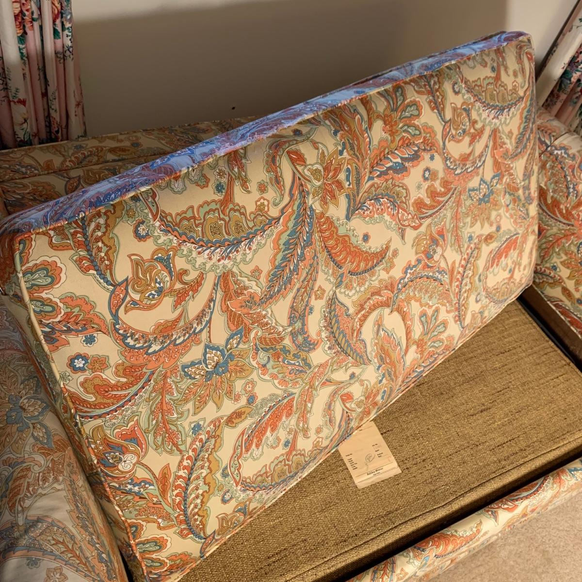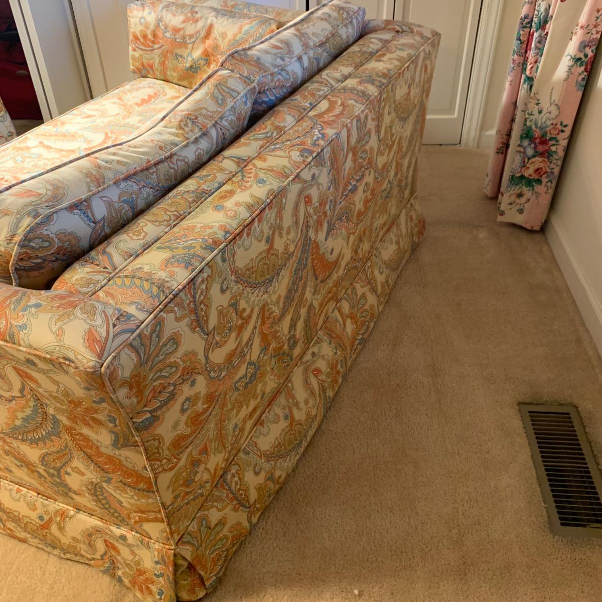 This Ashley Manor sleeper loveseat measures 59” x 35.5” x 25”H. It has armrest covers, two side pillows, and removable seat and back cushions. Its base color is beige and it has different shades of coral and blue in a paisley print (bad lighting in the room; closeup pictures show truer colors). The loveseat is on casters and easy to reposition. One armrest cover has a tear and they both are a little faded, but the armrests underneath are still vibrant. There is some fraying on the back of the seat cushion but it’s not visible when in place.