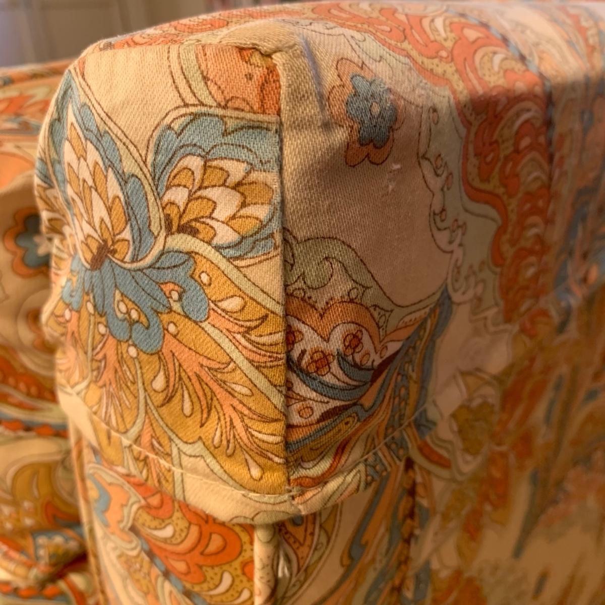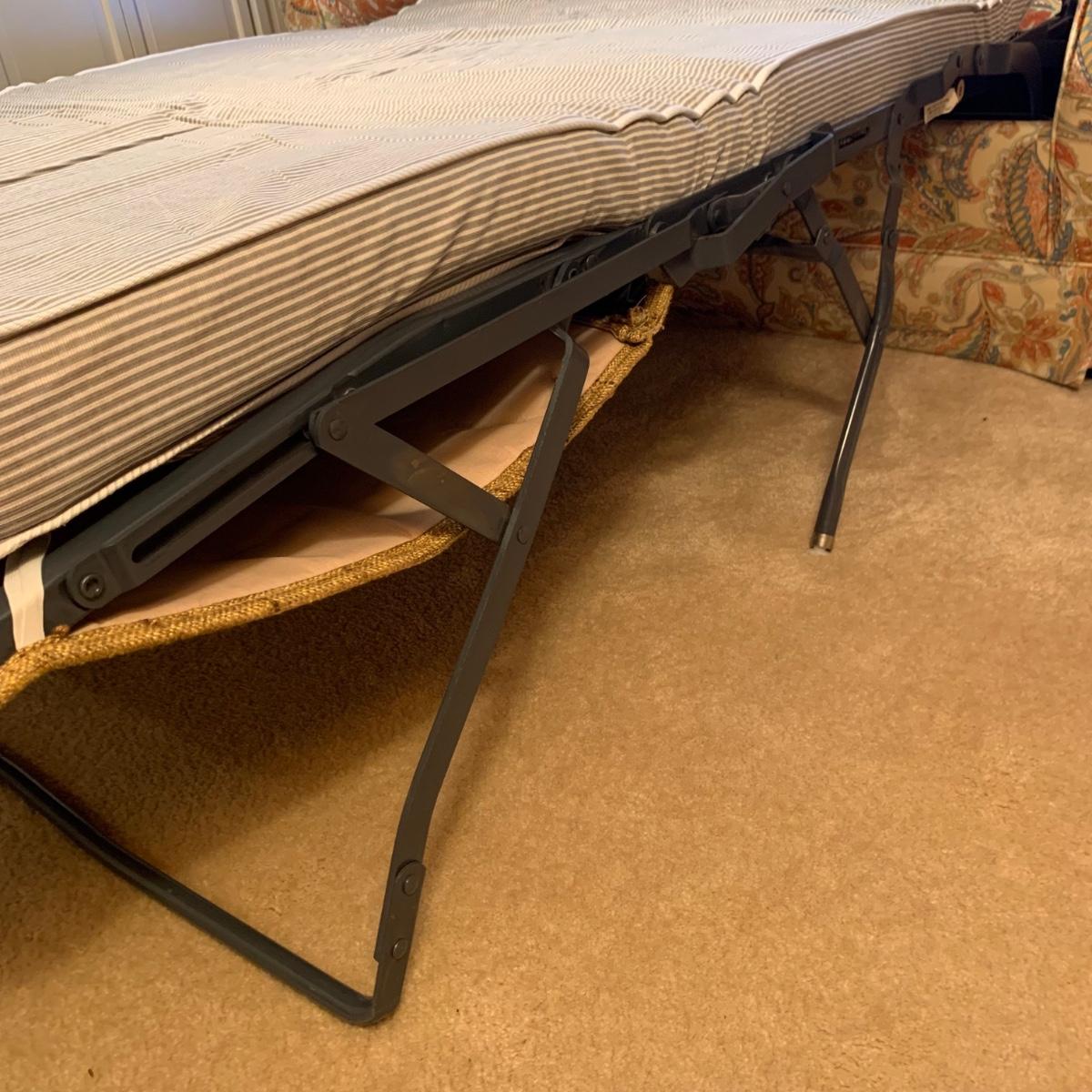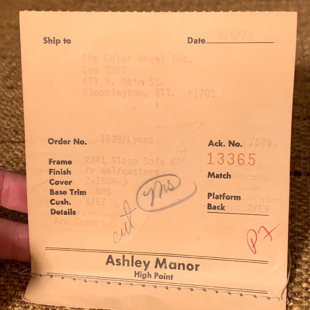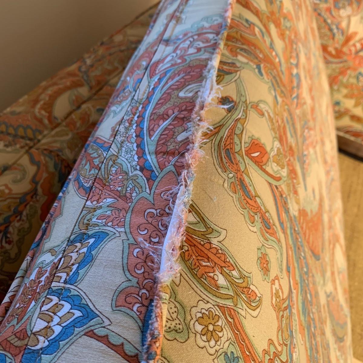 This Ashley Manor sleeper loveseat measures 59” x 35.5” x 25”H. It has armrest covers, two side pillows, and removable seat and back cushions. Its base color is beige and it has different shades of coral and blue in a paisley print (bad lighting in the room; closeup pictures show truer colors). The loveseat is on casters and easy to reposition. One armrest cover has a tear and they both are a little faded, but the armrests underneath are still vibrant. There is some fraying on the back of the seat cushion but it’s not visible when in place.