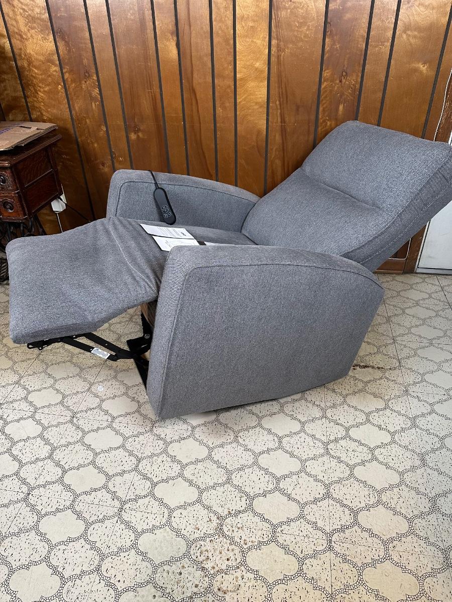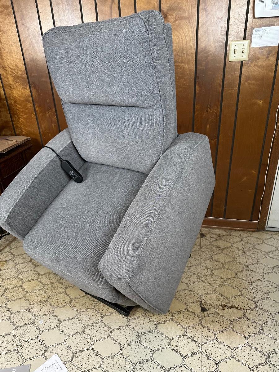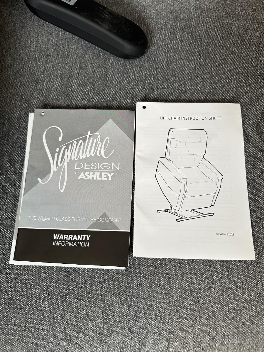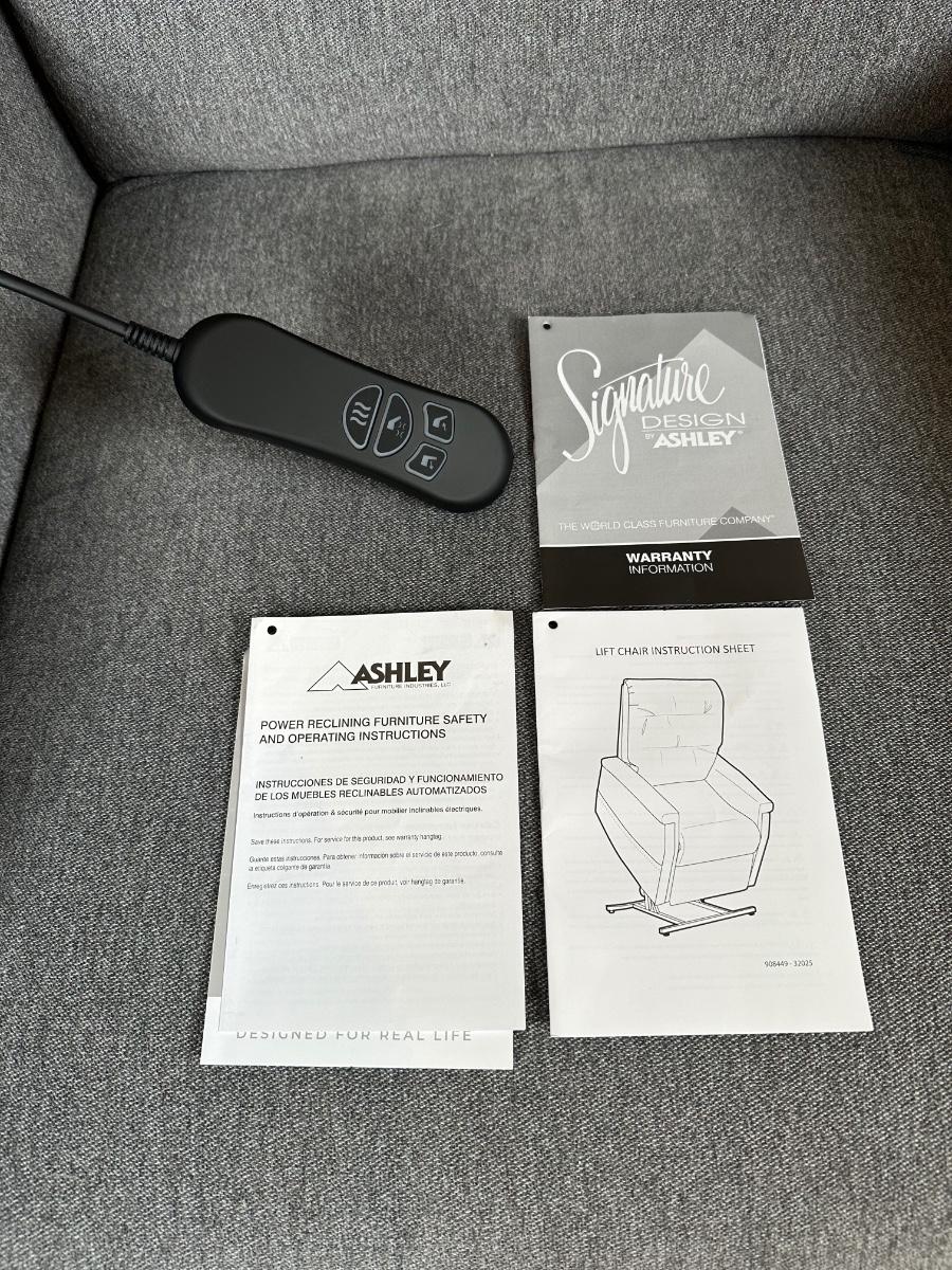 Modern power lift recliner by Ashley Furniture Industries (Signature Design). Upholstered in neutral gray fabric with padded arms and back. Features powered recline and lift assist, easy-use wired remote, and smooth, quiet operation. Includes original manuals. Clean, well-kept, and fully functional—ideal for comfort, mobility assistance, or everyday lounging.