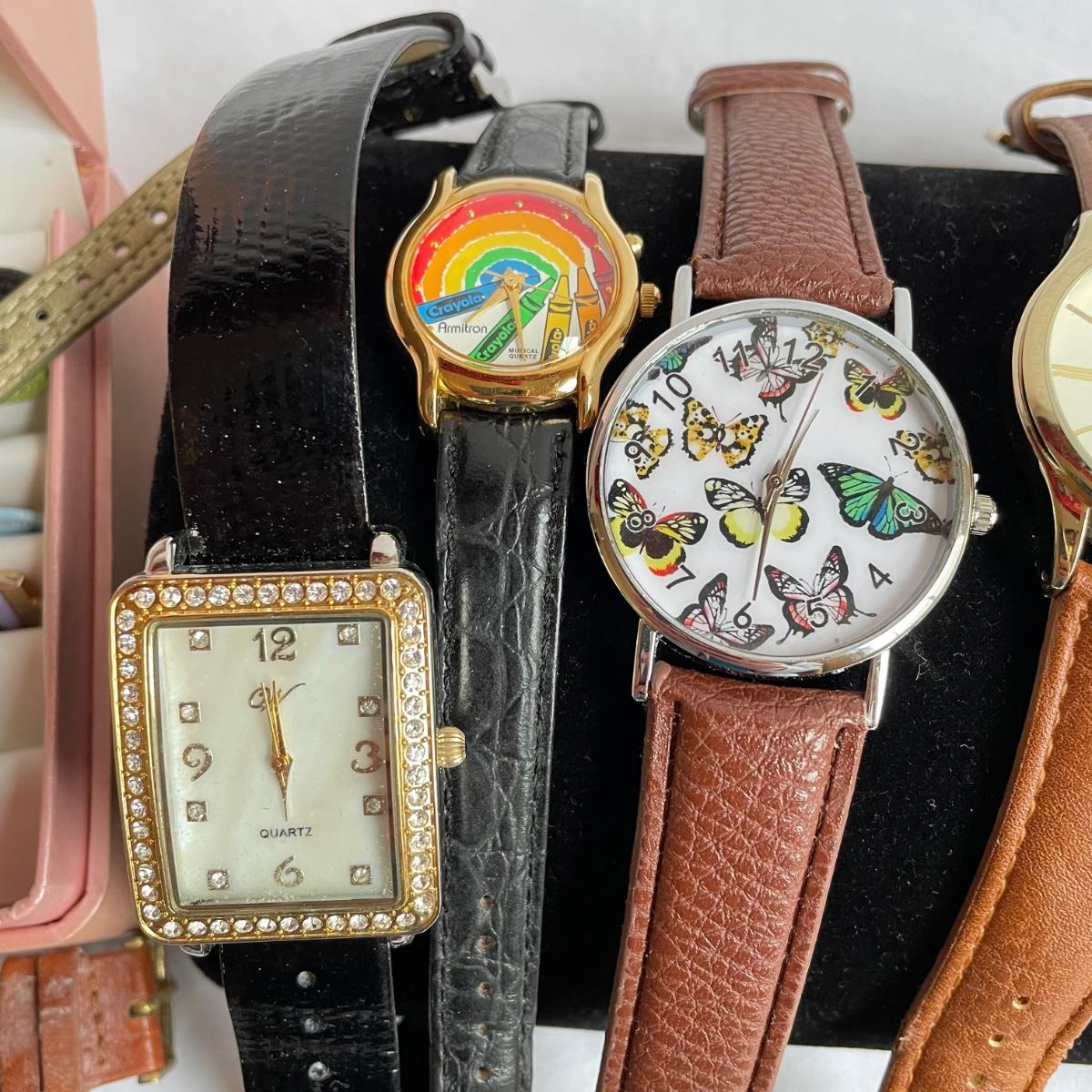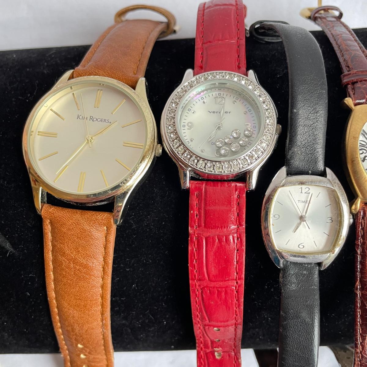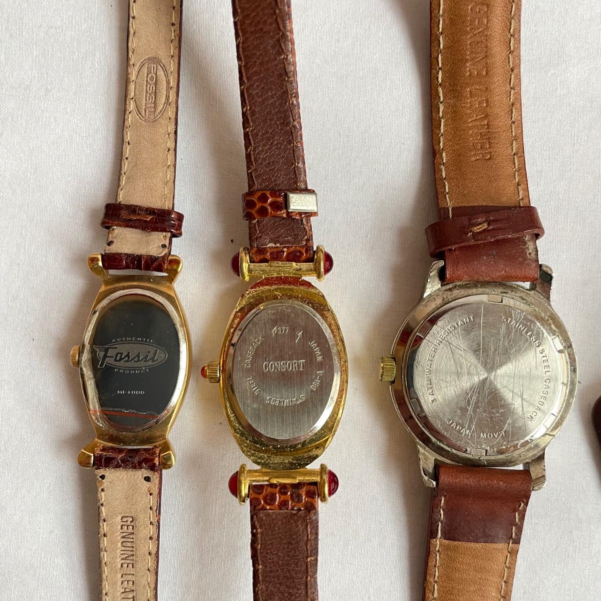A nice selection of leather and faux leather banded watches including brands like Ashley, Fossil, Kim Rogers, Sergio Valente and more. The Ashley swatch collection includes five bands and eight face plate frames plus its original box. There is one digital watch that turned on when printed by its side button, all other watches were not tested. All bands are adjustable, some need cleaning. All sales are final. No returns or refunds. Please bid accordingly. Shipping available.