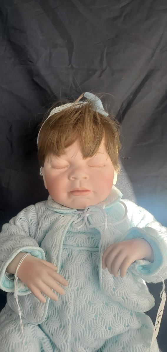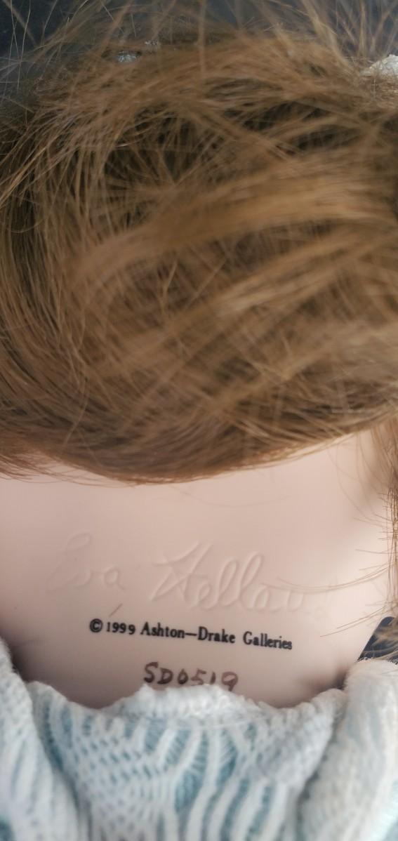 Porcelain Doll in a blue shirt and pants. Ashton Drake Galleries.