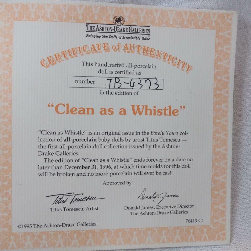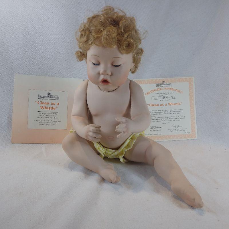 All Porcelain doll by Ashton-Drake Galleries. Doll artist Titus Tomescu. #7B-4373 1995. She mesures 10 1/2-inches tall X 8-inches wide. Very Good Condition. Note: She's bigger than you think - shipping could get expensive, but she is worth it. Reserve Price $25.