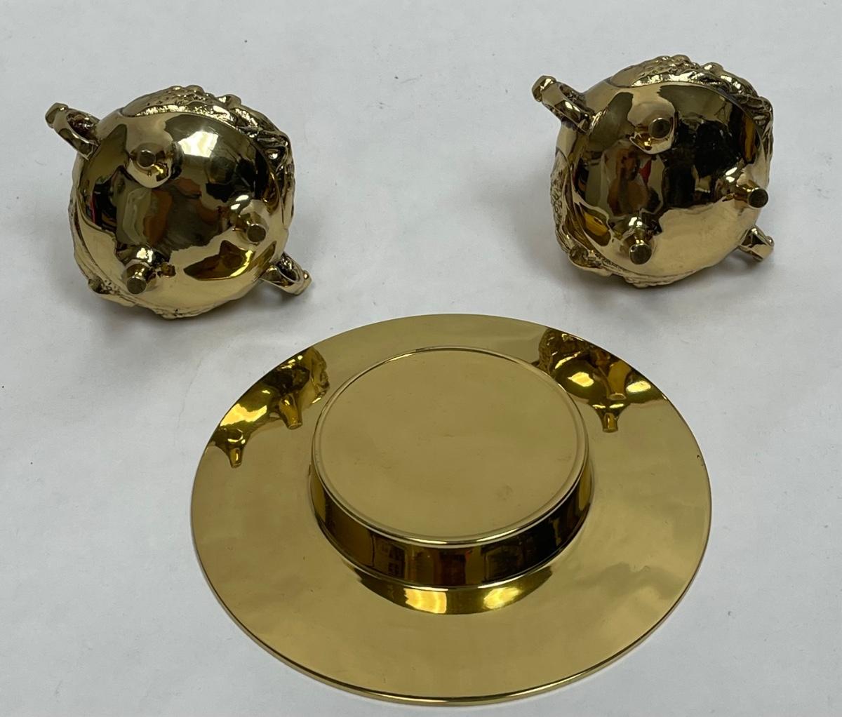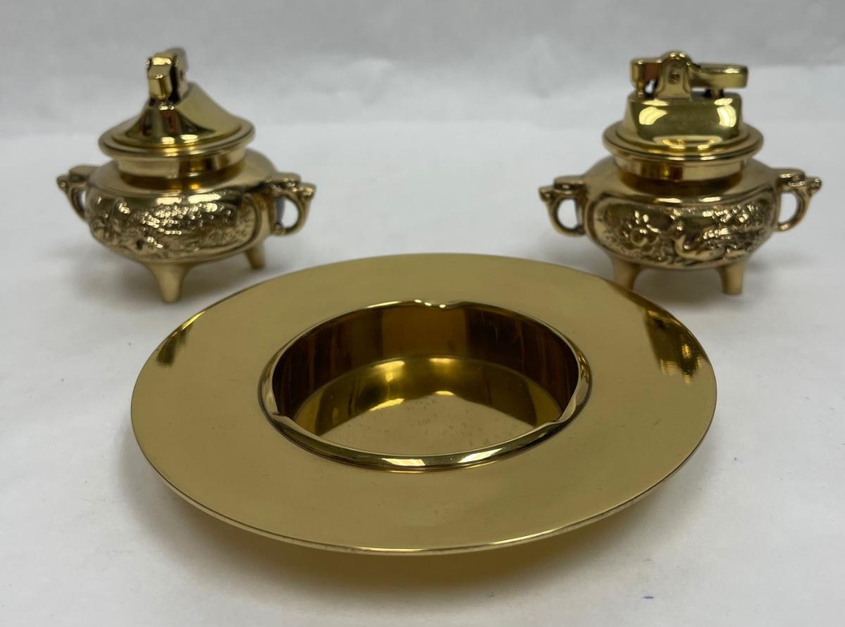 Smokers Trio Polished Brass Ashtray & 2 tri-footed lighters