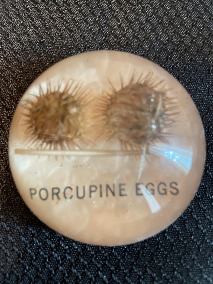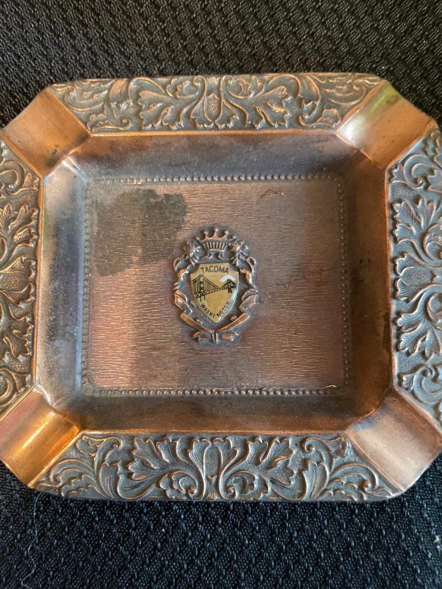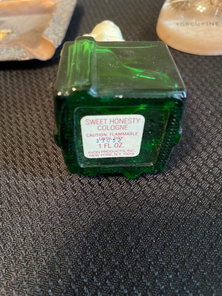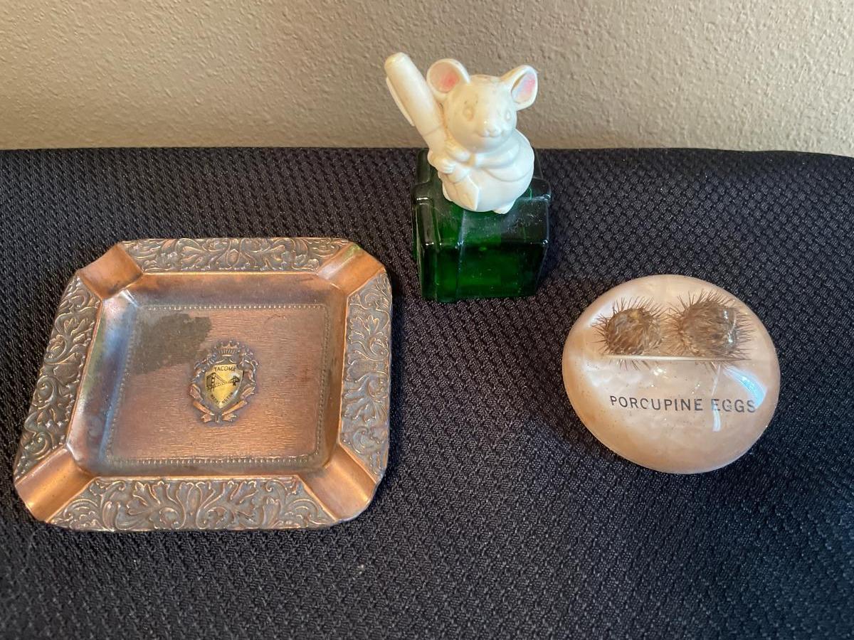 Avon cologne still in bottle, porcupine eggs in acrylic and metal ashtray from Tacoma