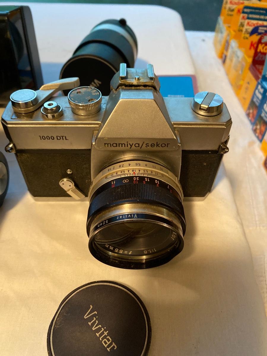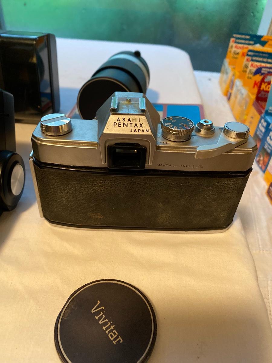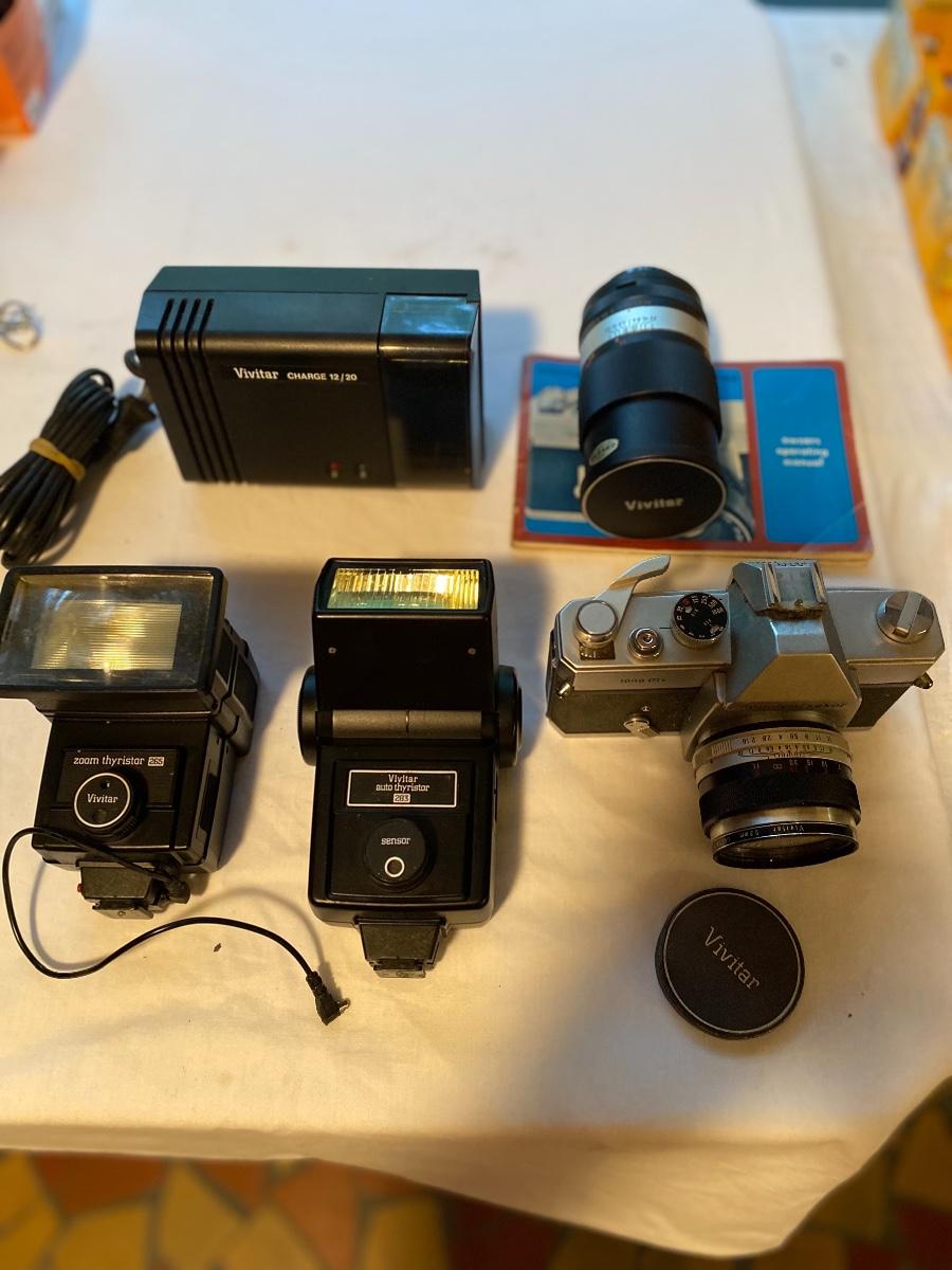 ASAHI Pentax Vivitar 35 mm camera with accessories by Mamon’s/Sekor: flash, light meter, zoom lens, charger