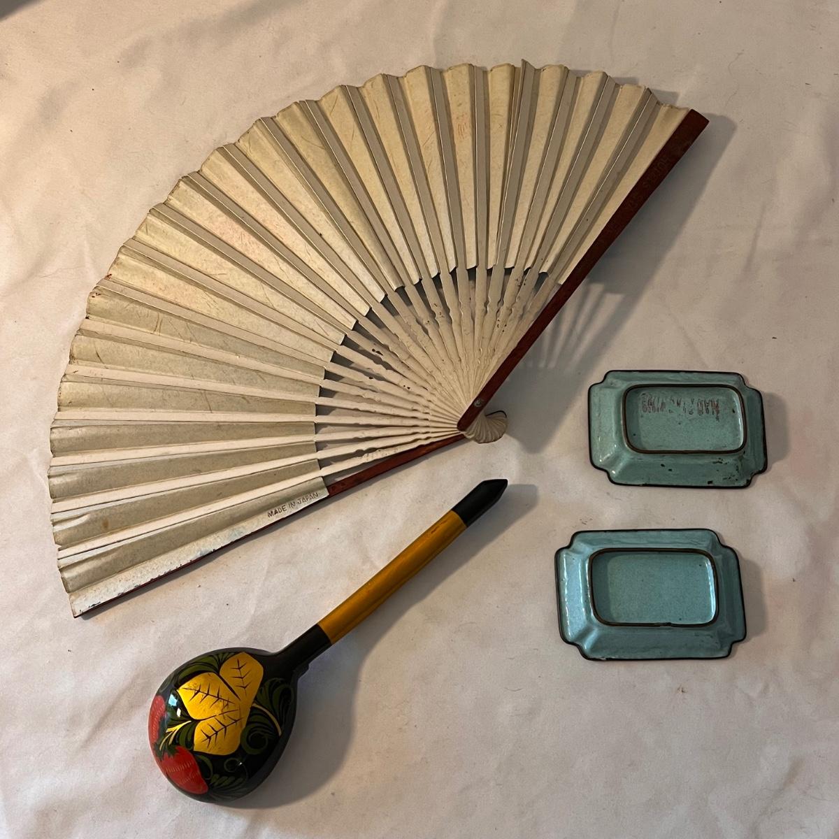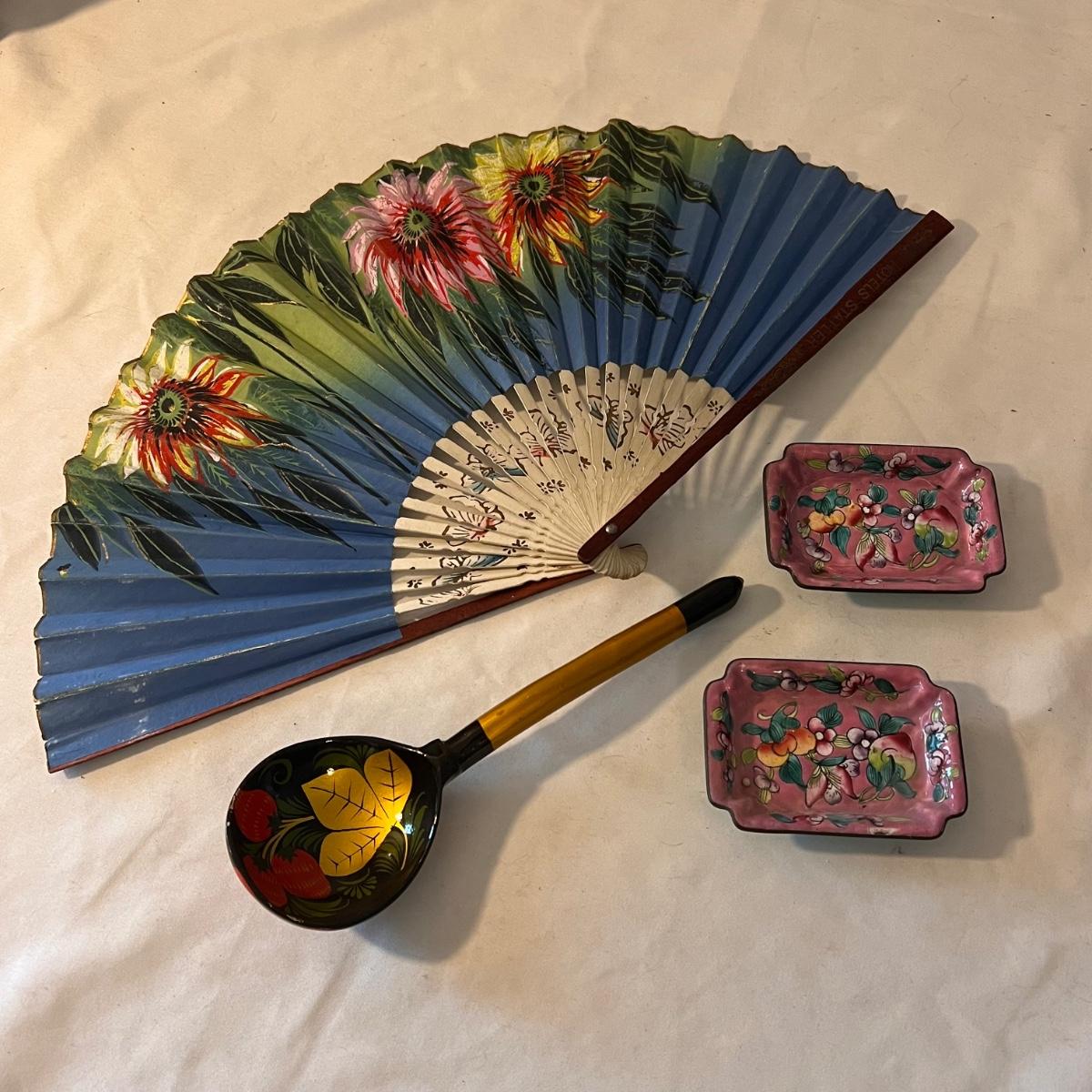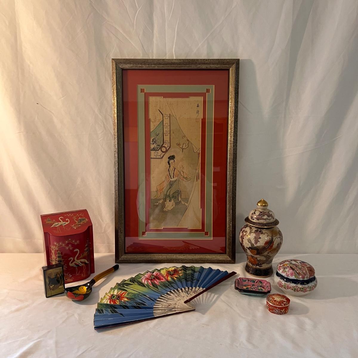 This lot comes with around 10 pieces of Asian influenced collectibles. Included in the lot is a handheld fan, three various sized jars, one framed art, one mint or matched holder, two small trays, one painted wooden spoon, and one tin box. The largest piece is the framed and double matted art that measures 13” x 22”H. Frame is dusty and cleans easily. Shipping available.