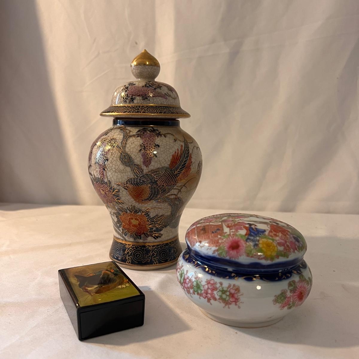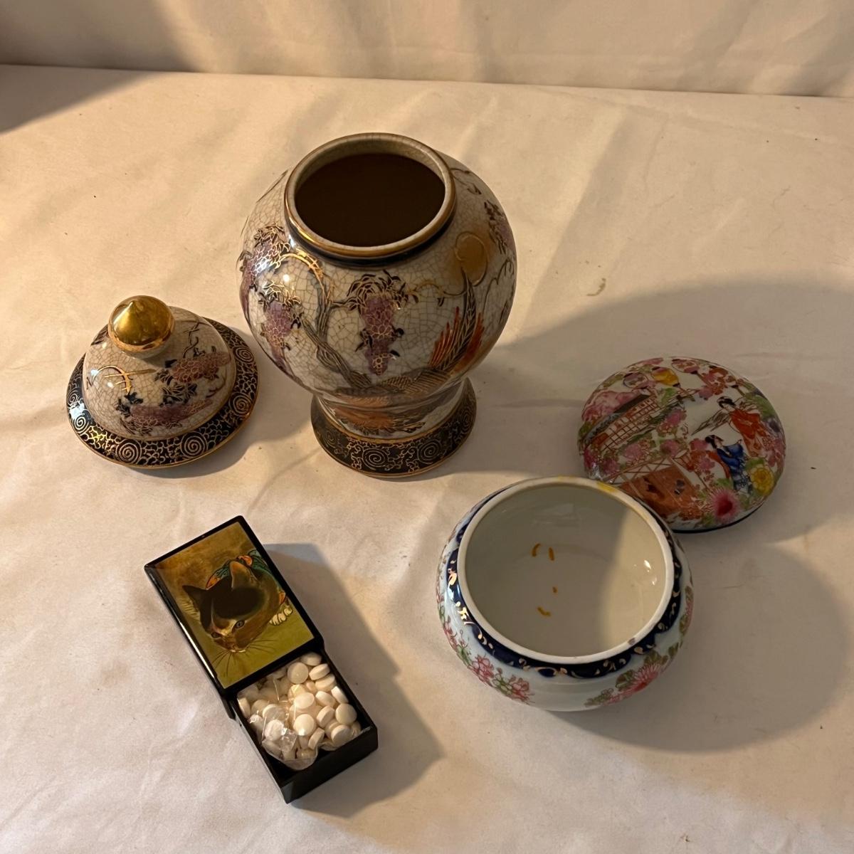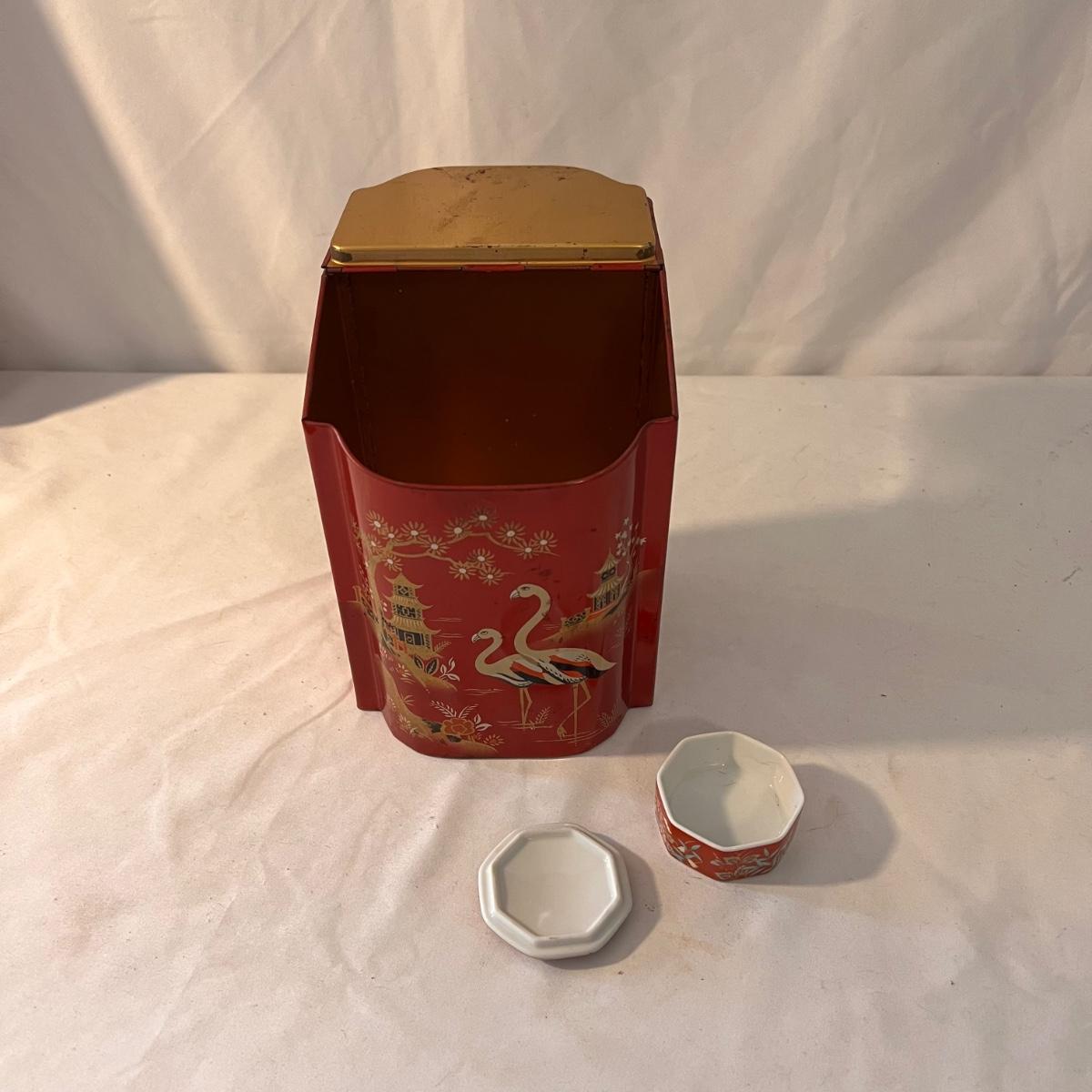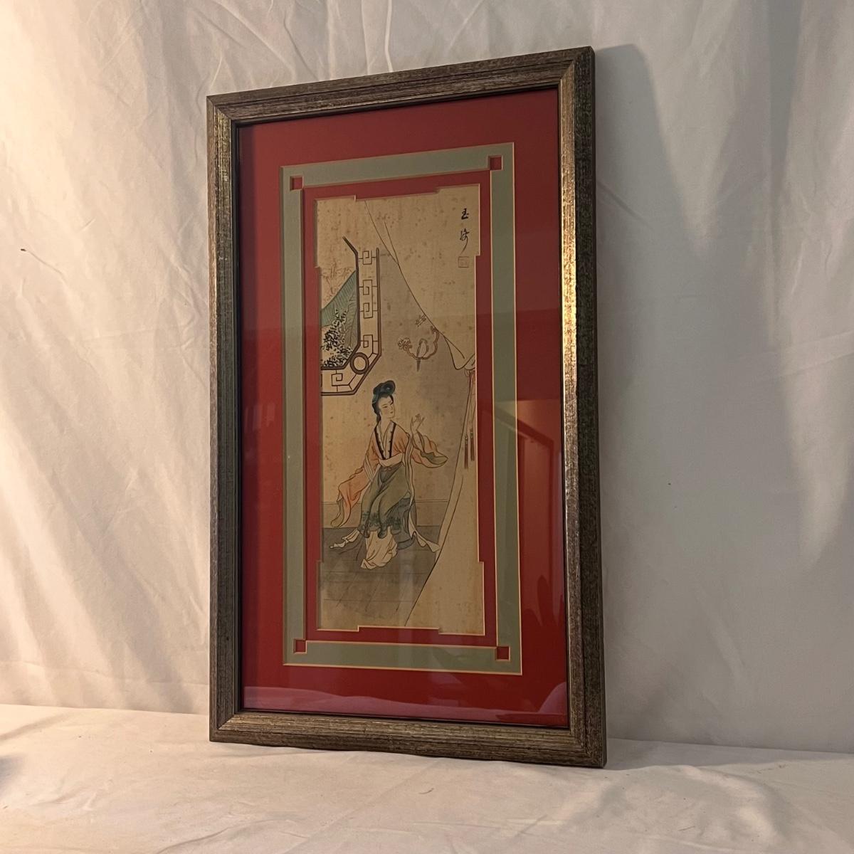 This lot comes with around 10 pieces of Asian influenced collectibles. Included in the lot is a handheld fan, three various sized jars, one framed art, one mint or matched holder, two small trays, one painted wooden spoon, and one tin box. The largest piece is the framed and double matted art that measures 13” x 22”H. Frame is dusty and cleans easily. Shipping available.