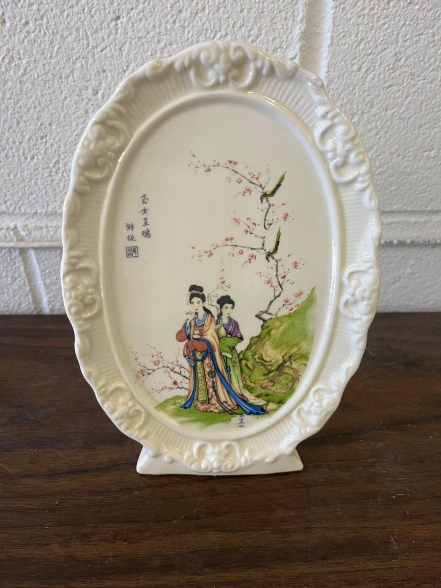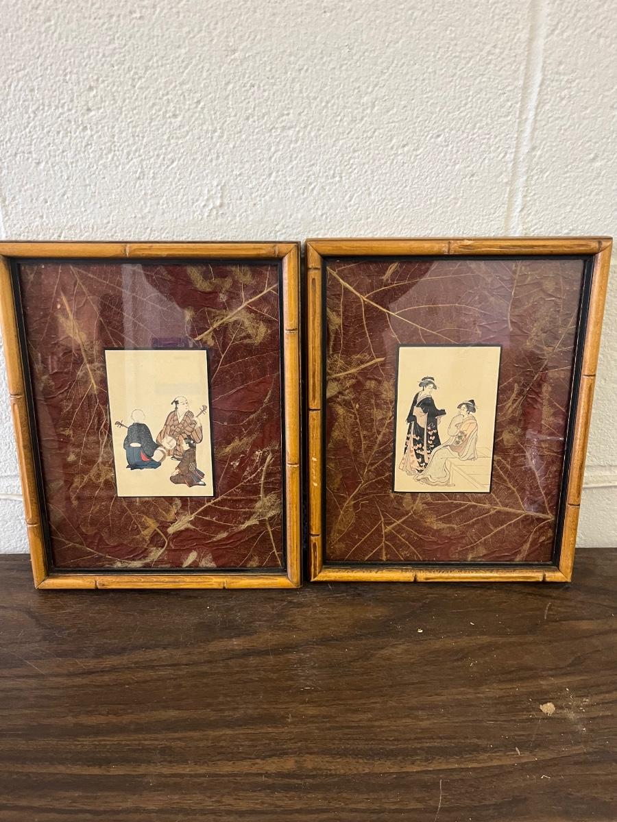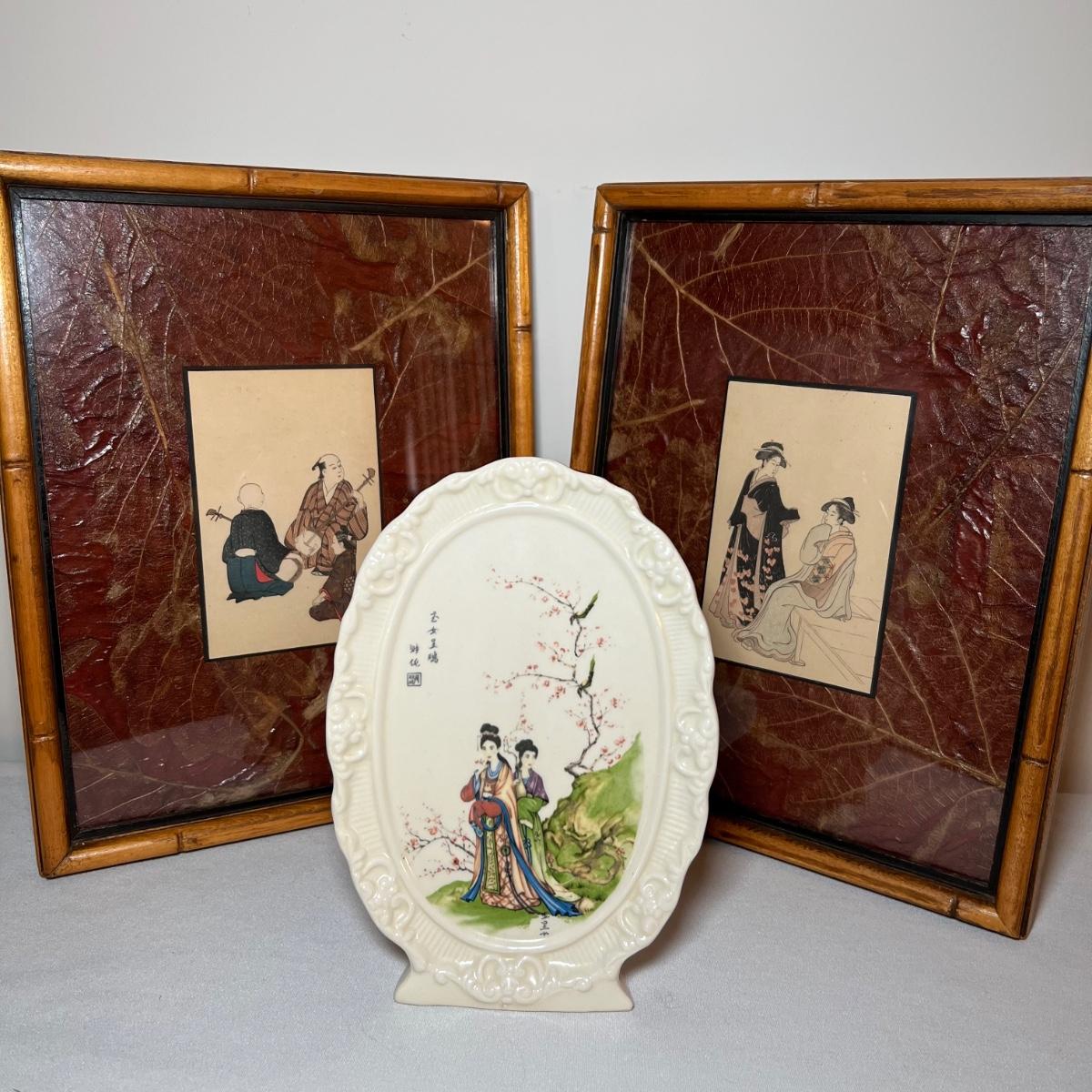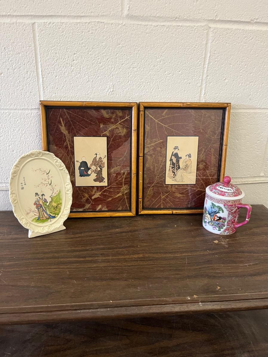 Lot includes two frame pieces of artwork that appear to be pen and pencil art on pretty leaf adorned mattes with bamboo style matching frames. Also includes cup with lid and standing ceramic plate shaped art that has a signature. Frames measure 9.5” x 12”.