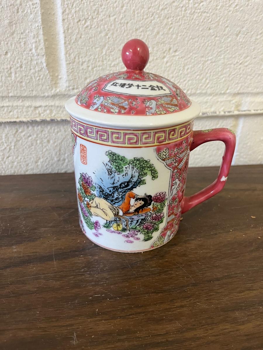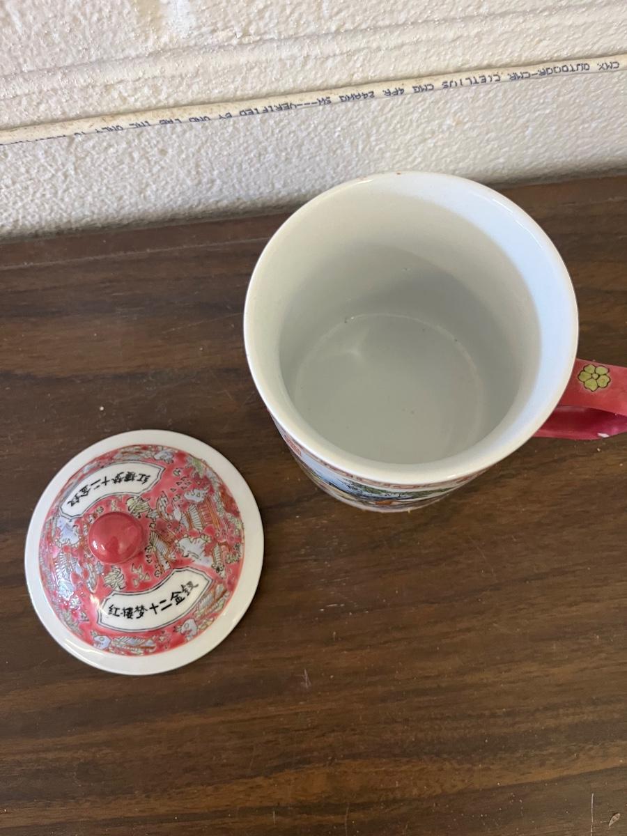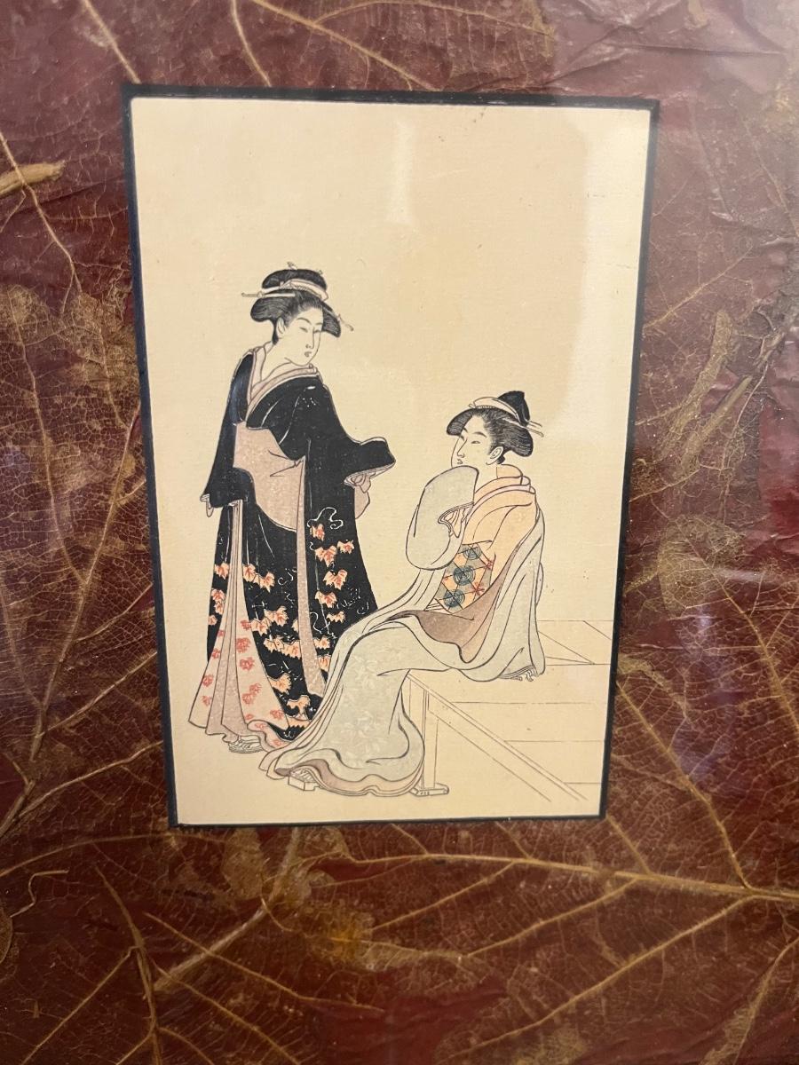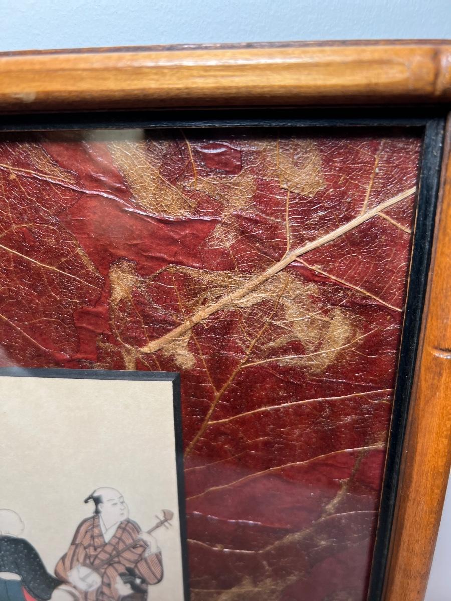 Lot includes two frame pieces of artwork that appear to be pen and pencil art on pretty leaf adorned mattes with bamboo style matching frames. Also includes cup with lid and standing ceramic plate shaped art that has a signature. Frames measure 9.5” x 12”.