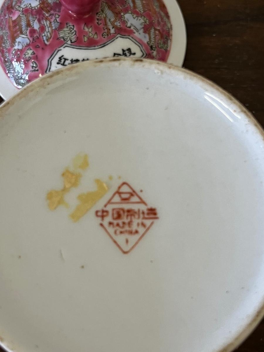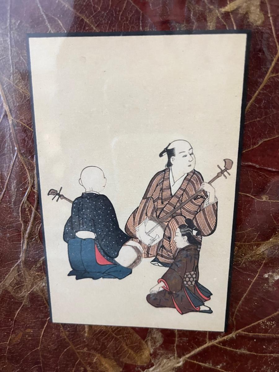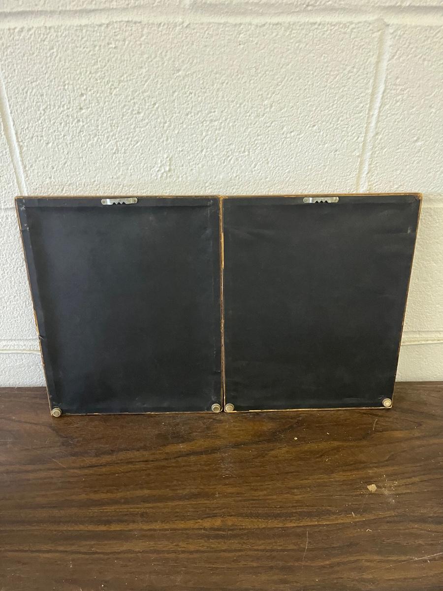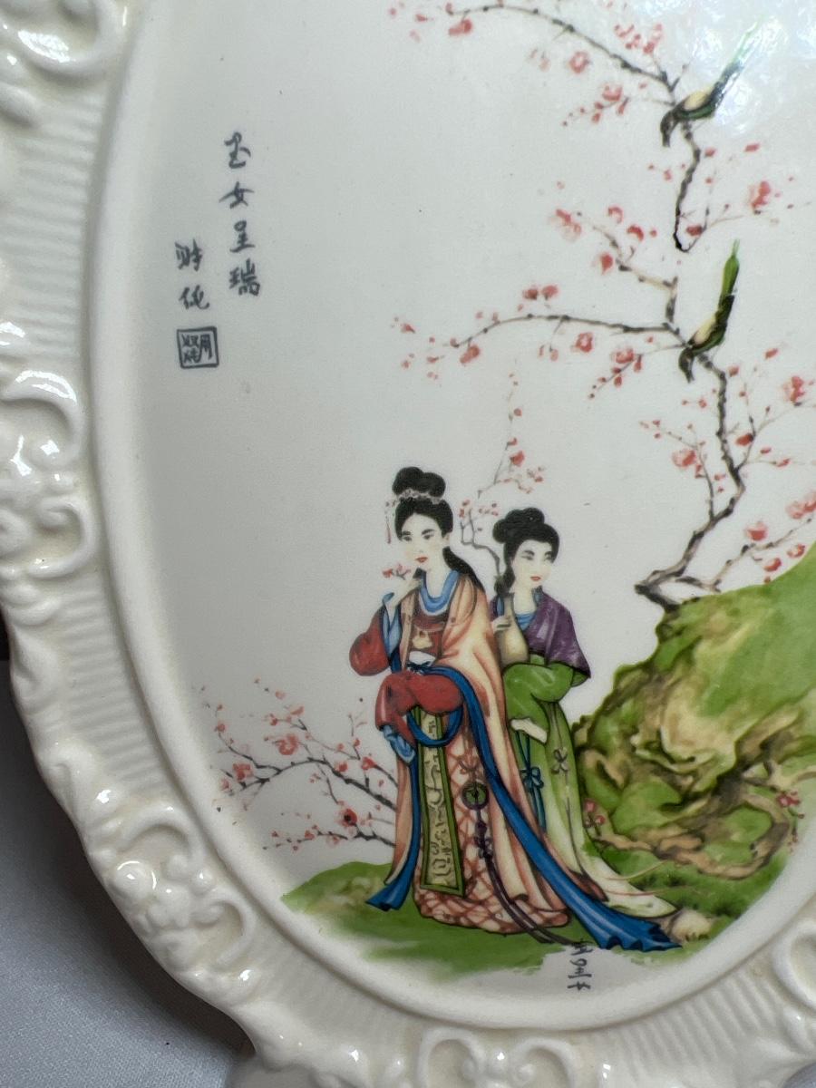 Lot includes two frame pieces of artwork that appear to be pen and pencil art on pretty leaf adorned mattes with bamboo style matching frames. Also includes cup with lid and standing ceramic plate shaped art that has a signature. Frames measure 9.5” x 12”.