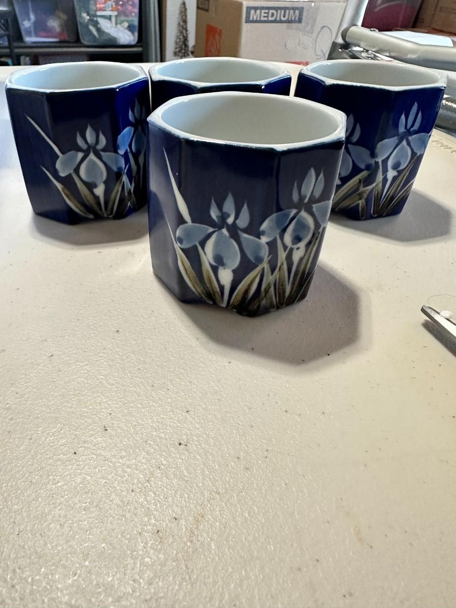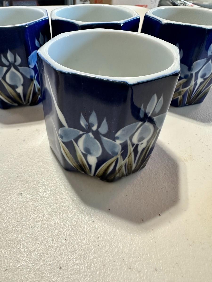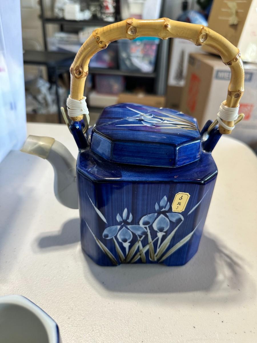 Asian Blue Iris Octagonal Ceramic Teapot Wood Handle Floral Flowers w/ cups
