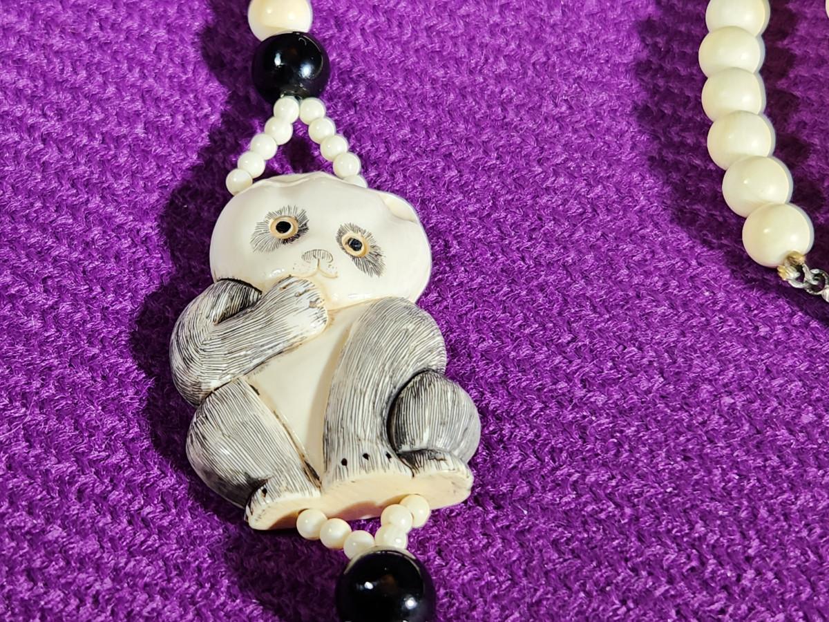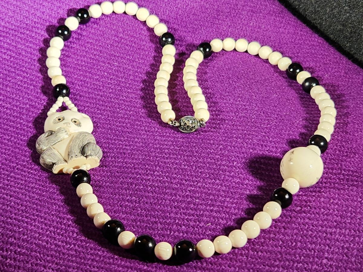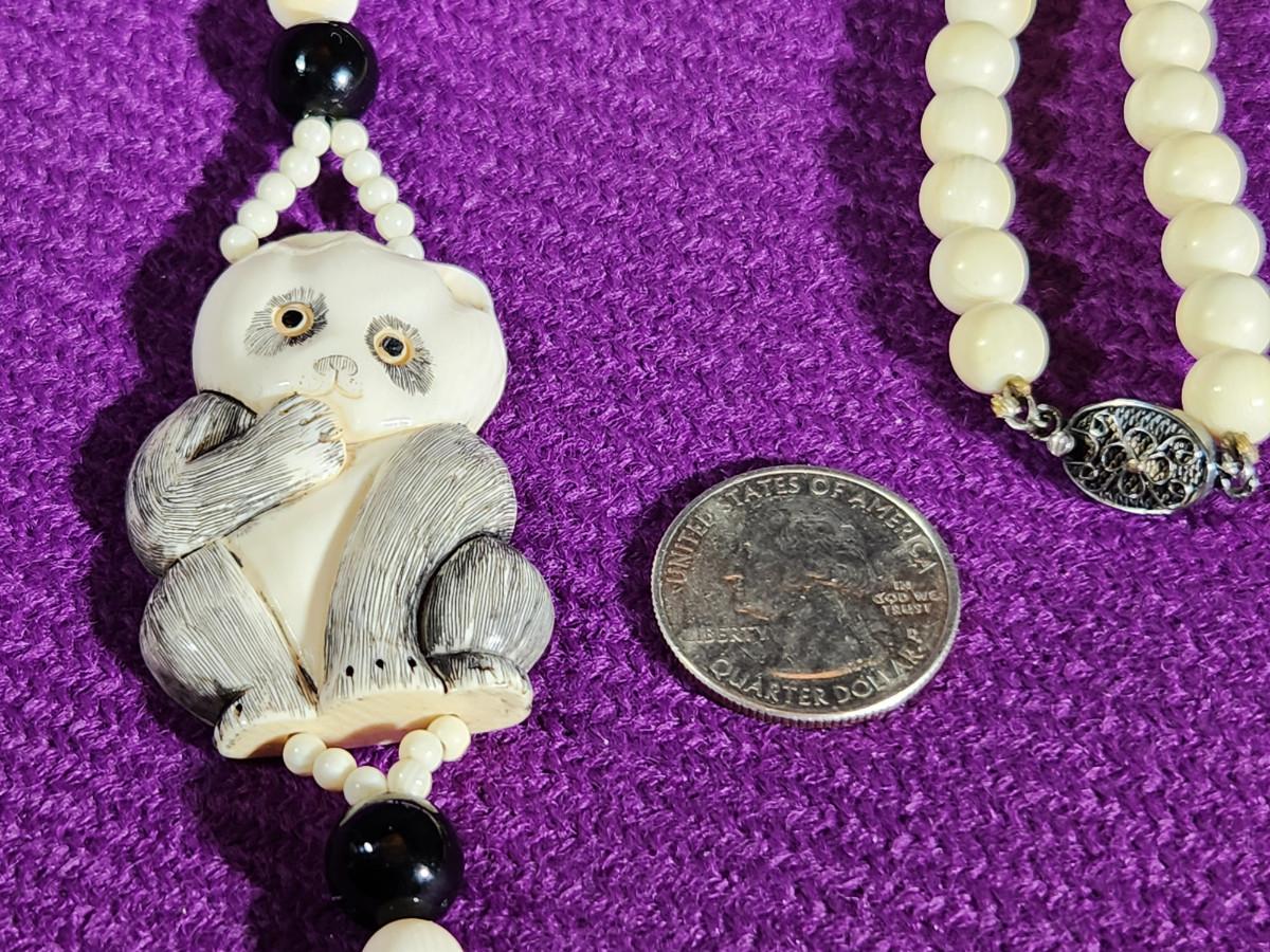 This auction lot is for a nifty Asian Bone Necklace. The carved panda is quite the star of this jewelry. Appears to be carved from bone. Necklace measures about 25-inches and has a sterling silver clasp. Very nice tourist item, probably purchased on a visit to the Beijing.