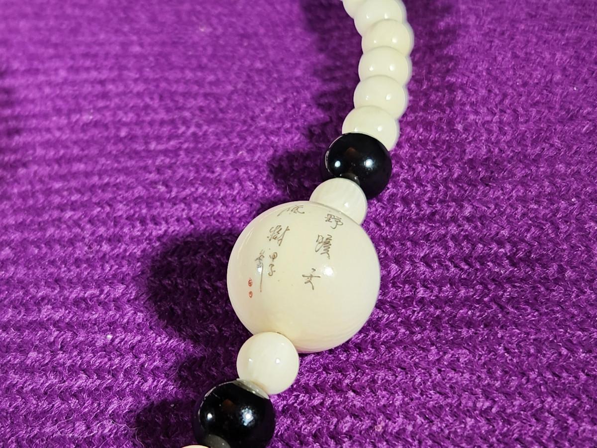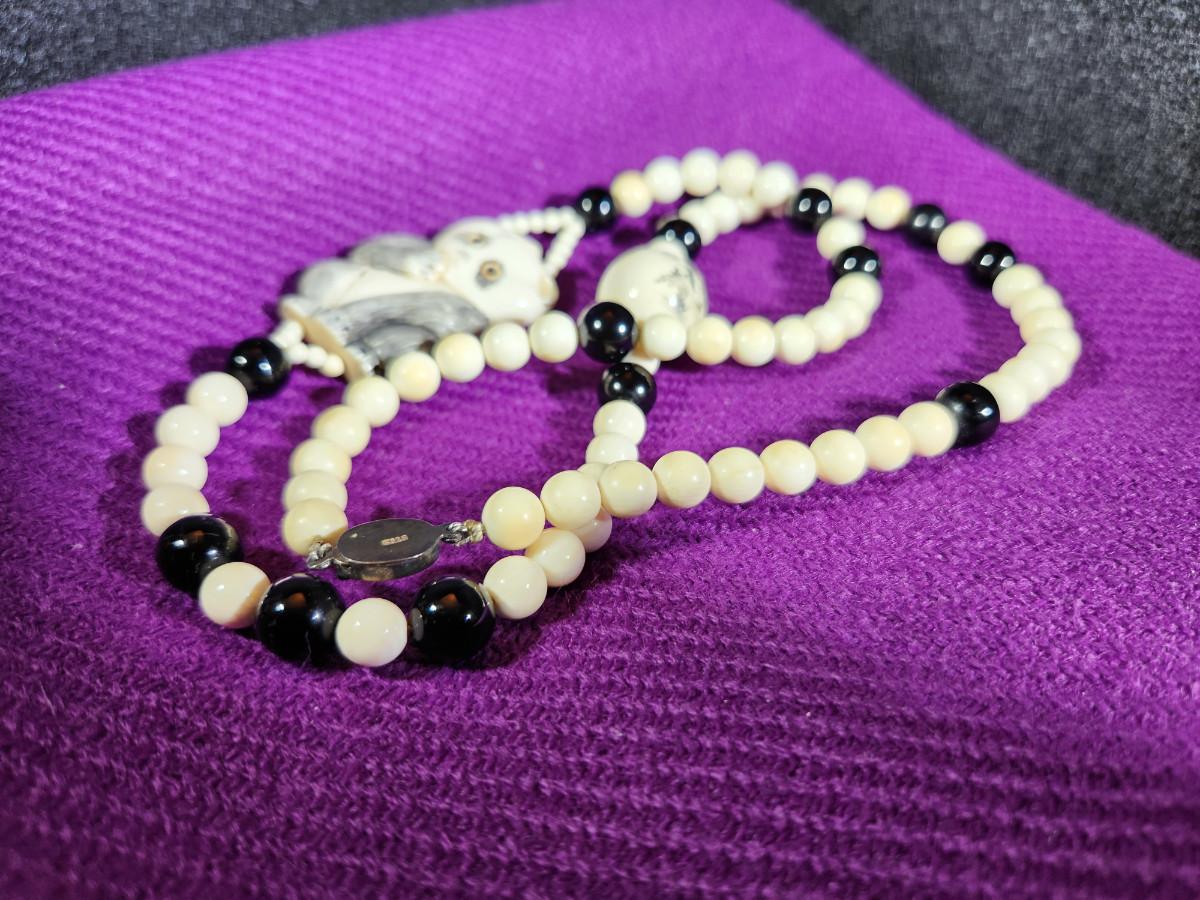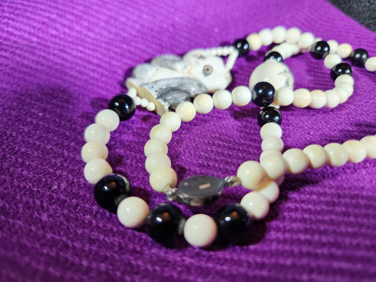 This auction lot is for a nifty Asian Bone Necklace. The carved panda is quite the star of this jewelry. Appears to be carved from bone. Necklace measures about 25-inches and has a sterling silver clasp. Very nice tourist item, probably purchased on a visit to the Beijing.