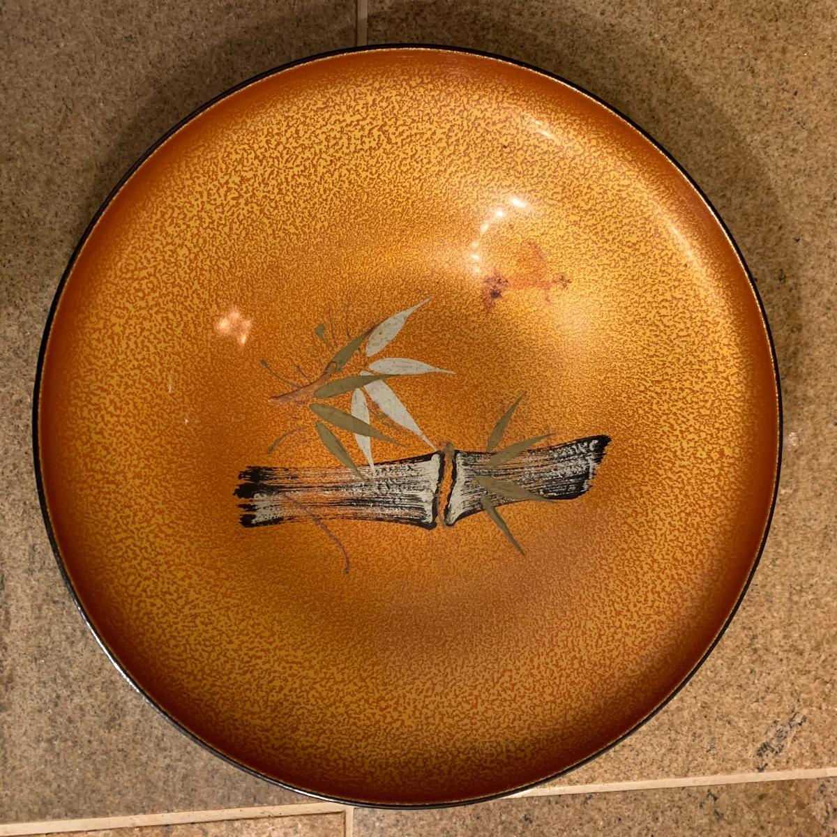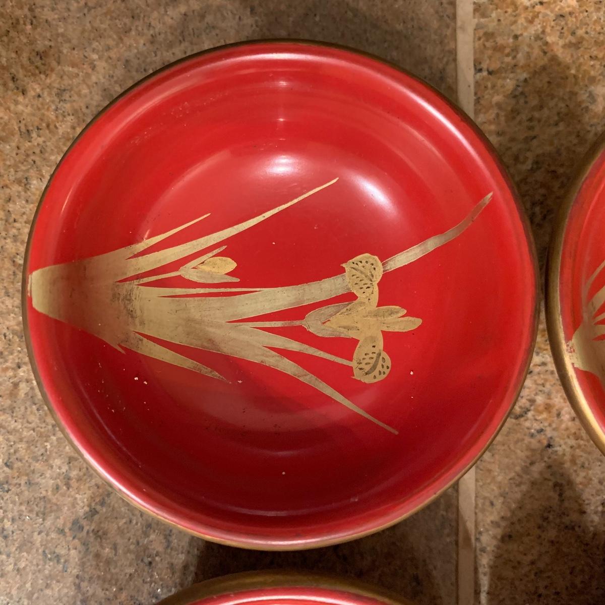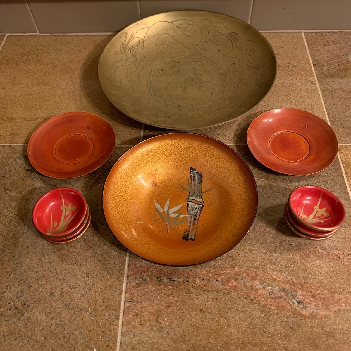 This lot offers several asian inspired bowls. The largest is made of brass, and features a dragon pattern etching. This bowl is 12” in diameter. Also included is a bowl featuring a bamboo design, two tan saucers, and a set of six tiny spice bowls. All bowls are plastic except the large brass piece.