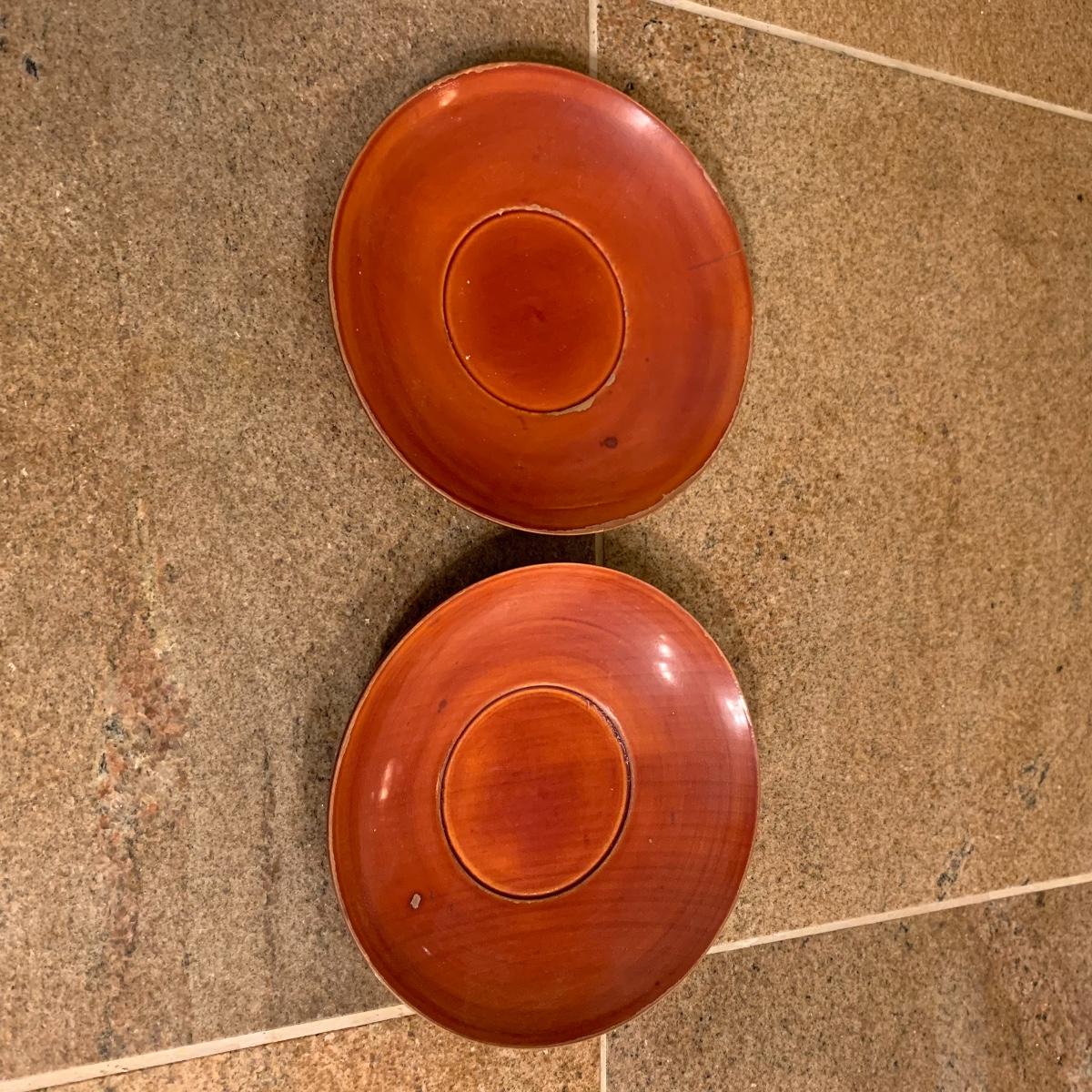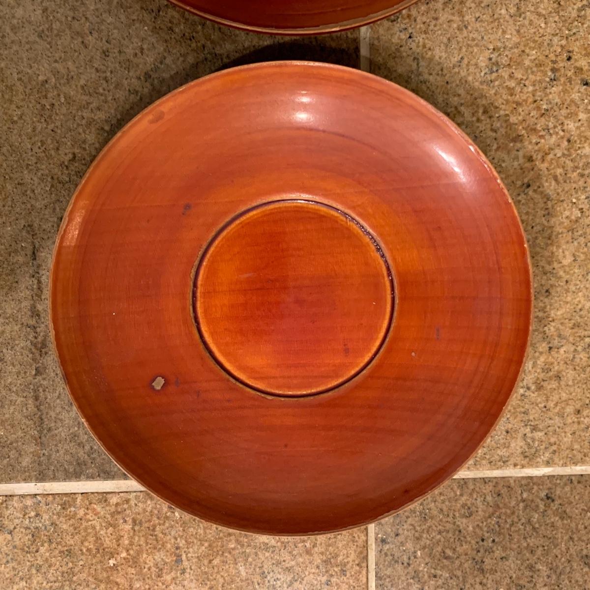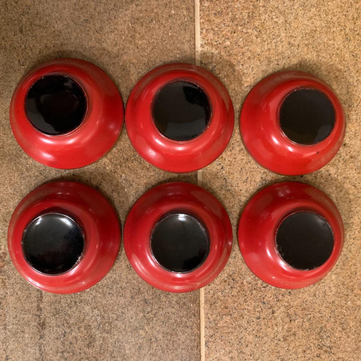 This lot offers several asian inspired bowls. The largest is made of brass, and features a dragon pattern etching. This bowl is 12” in diameter. Also included is a bowl featuring a bamboo design, two tan saucers, and a set of six tiny spice bowls. All bowls are plastic except the large brass piece.