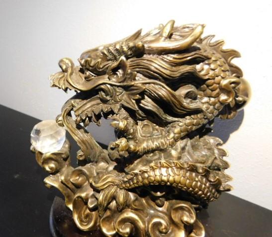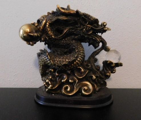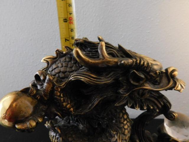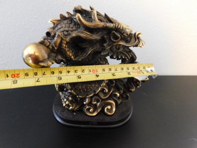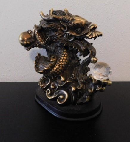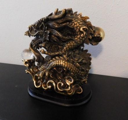 Asian Brass Dragon on Wood Base Holding Crystal Ball 7"x7"