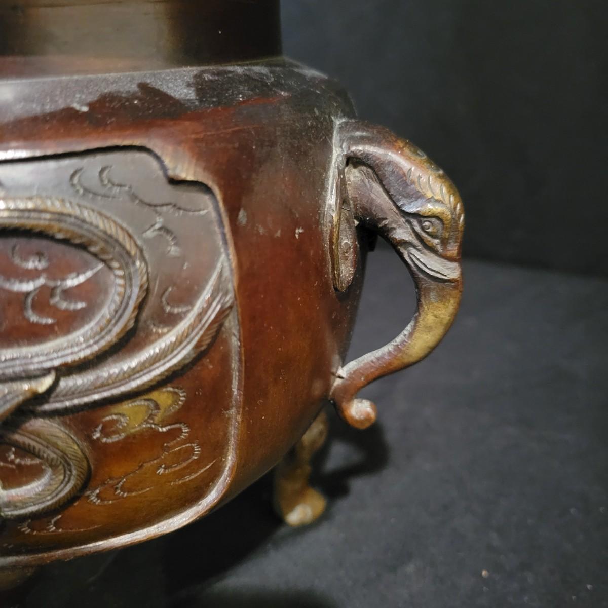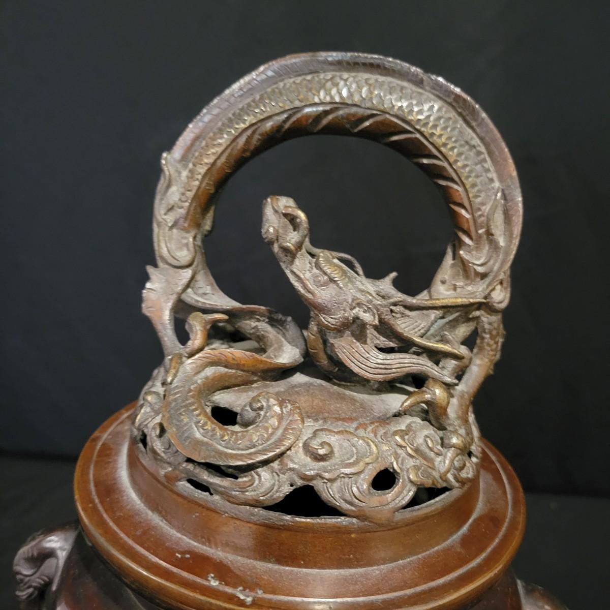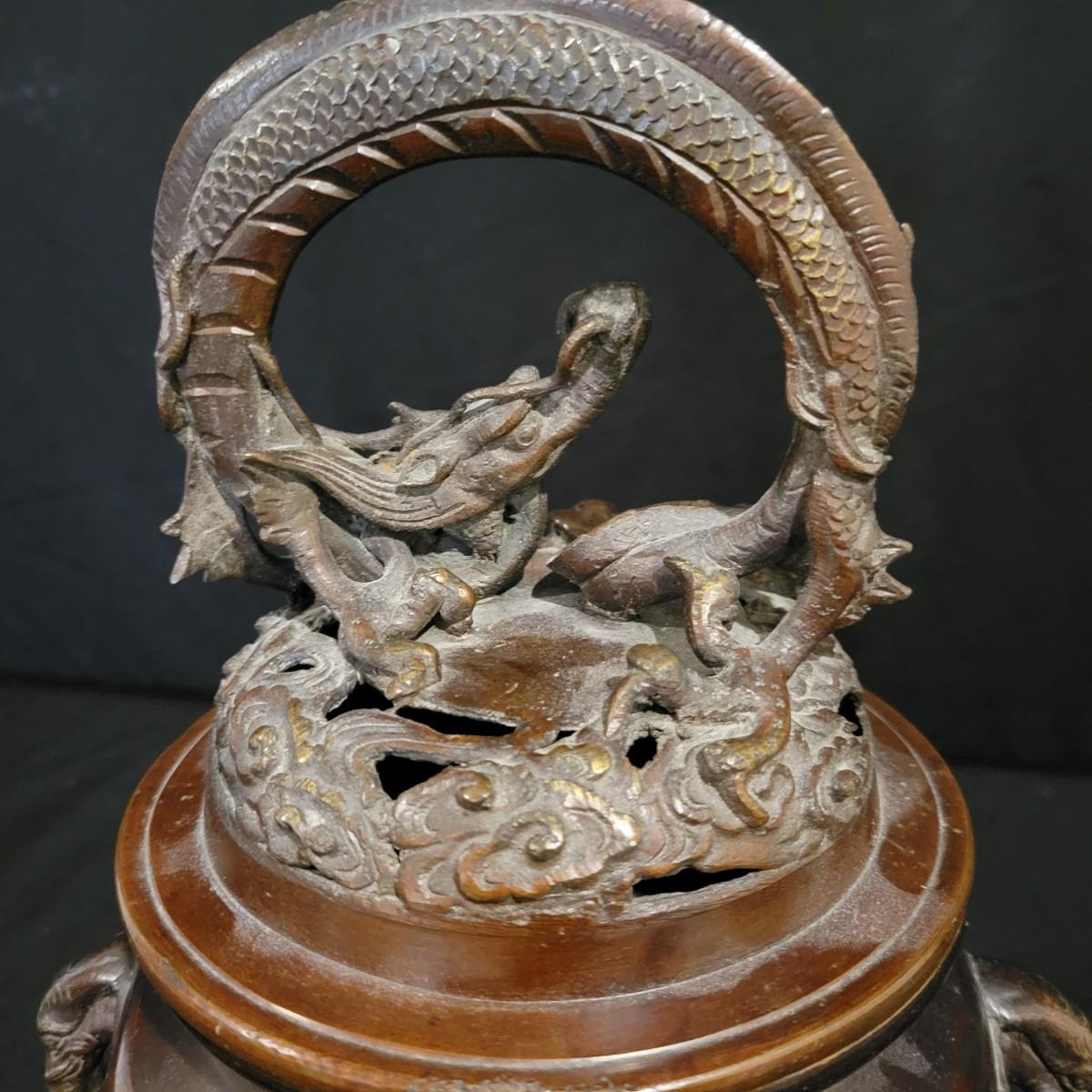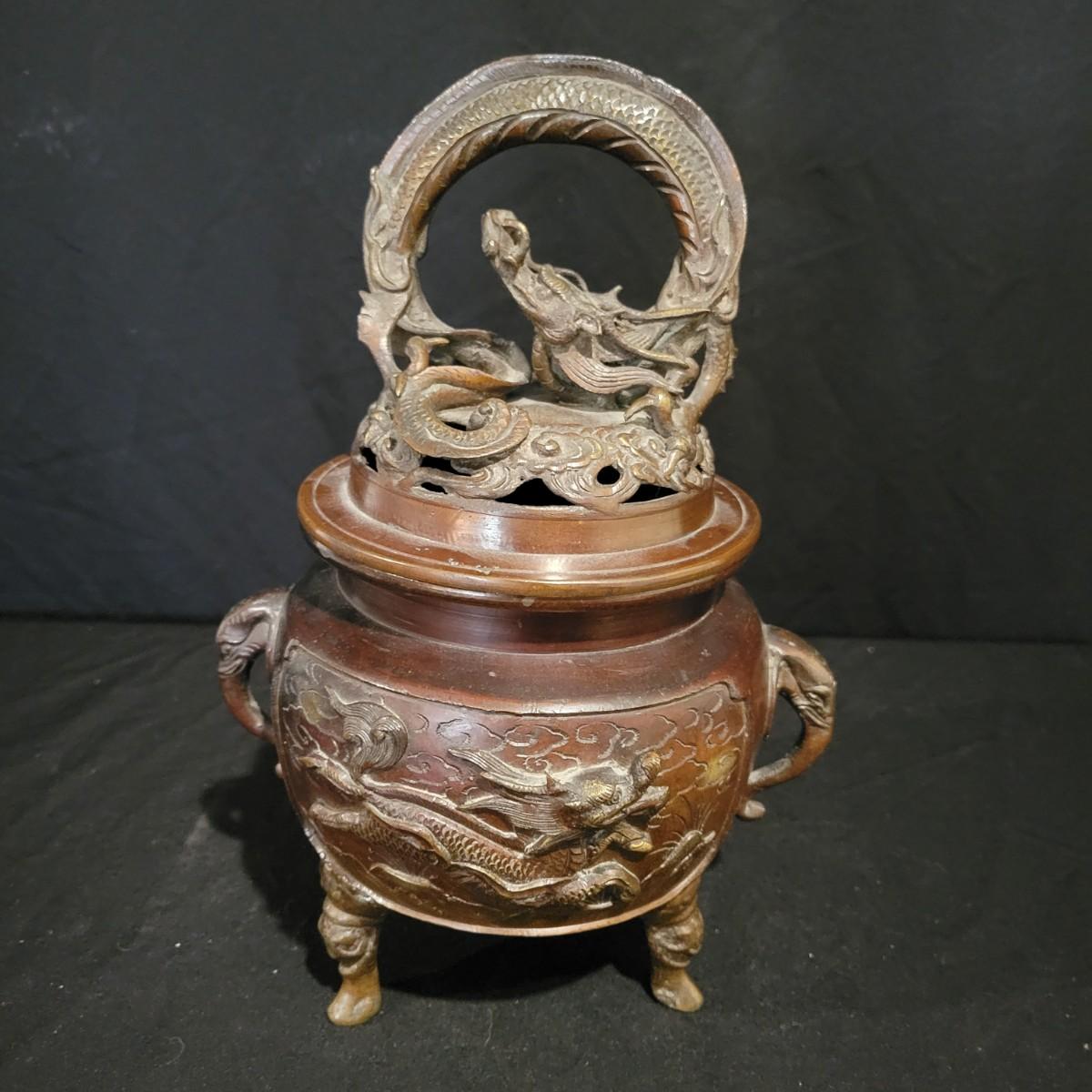 An Asian bronze dragon censer for burning insence in. It has very detailed dragon forms and elephant handles. It measures approximately 6"D x 11.5"H. Shipping available