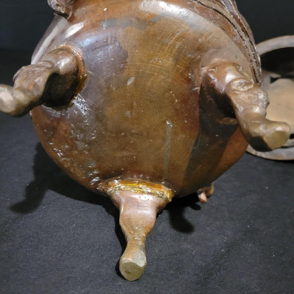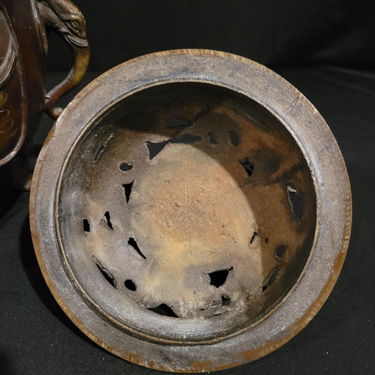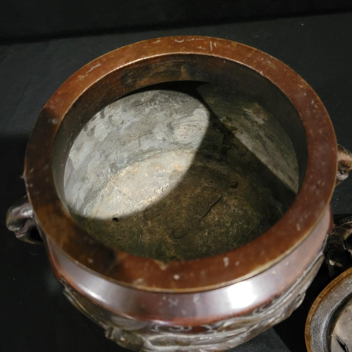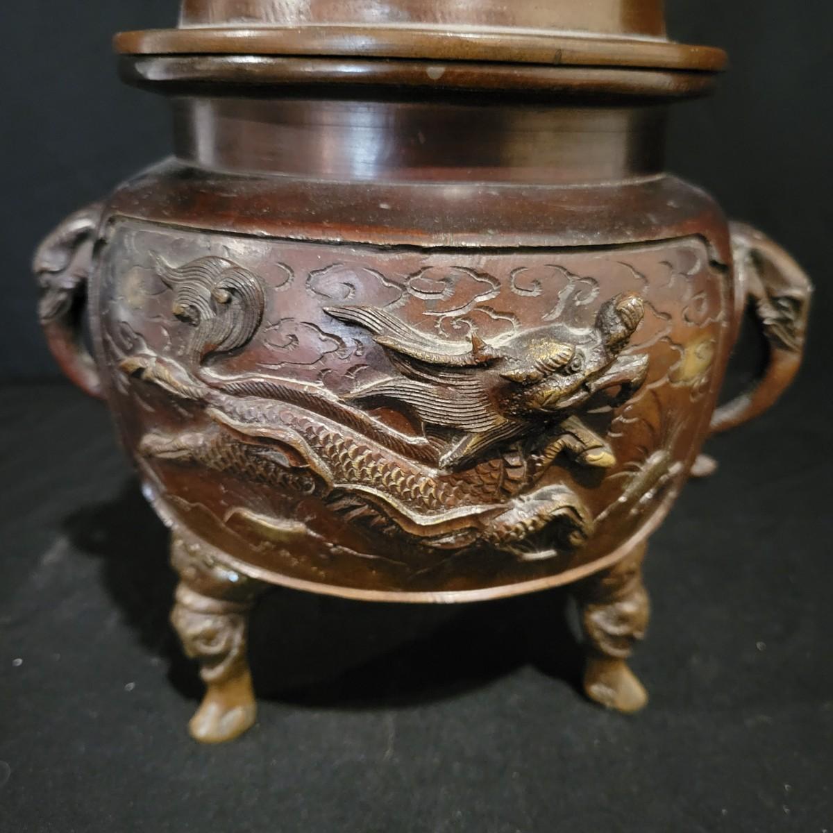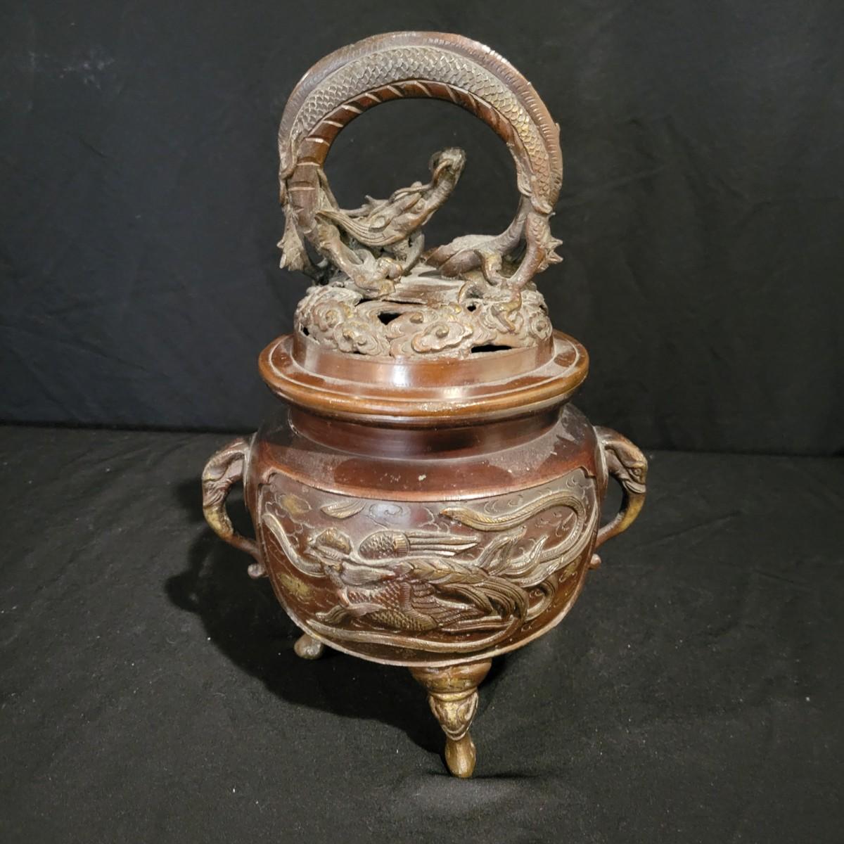 An Asian bronze dragon censer for burning insence in. It has very detailed dragon forms and elephant handles. It measures approximately 6"D x 11.5"H. Shipping available