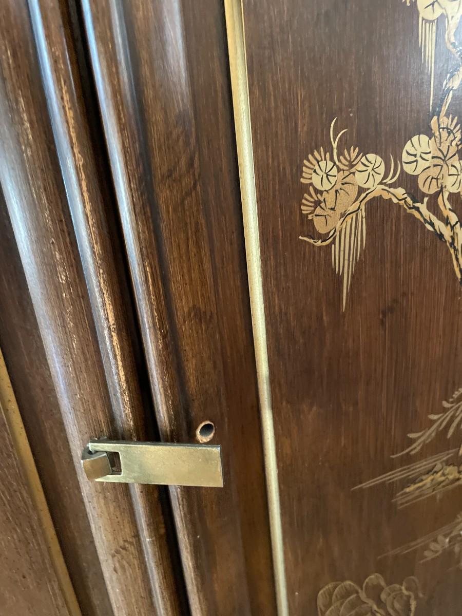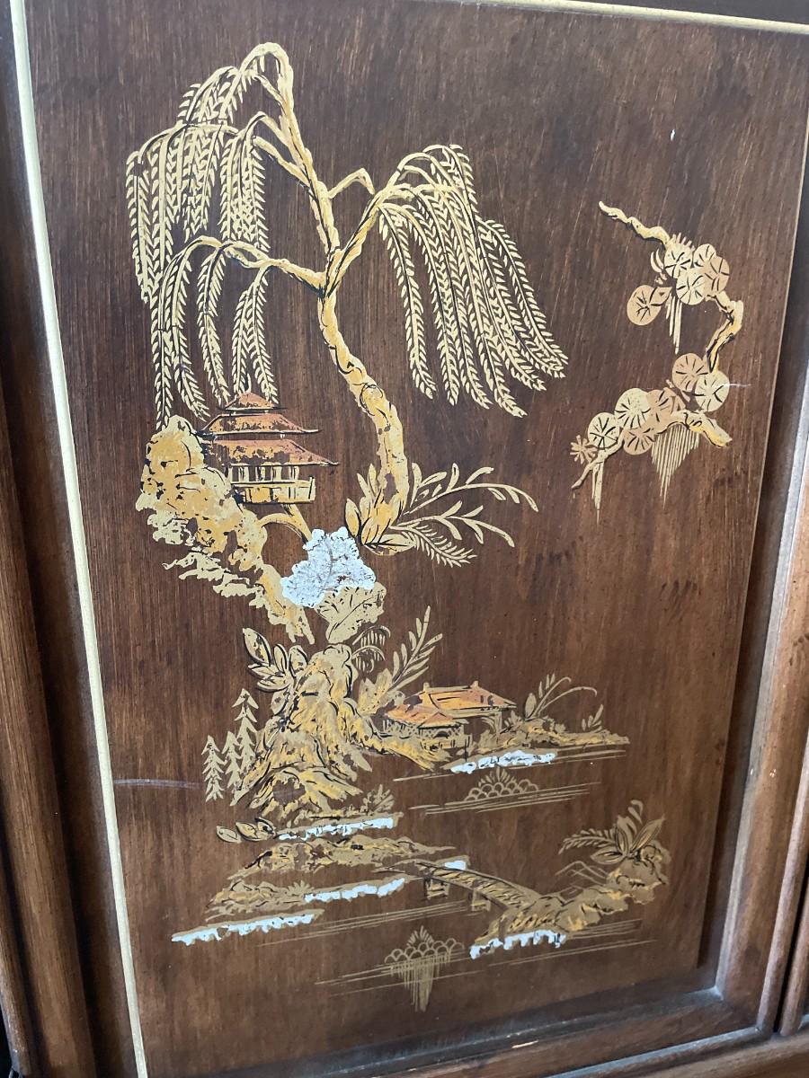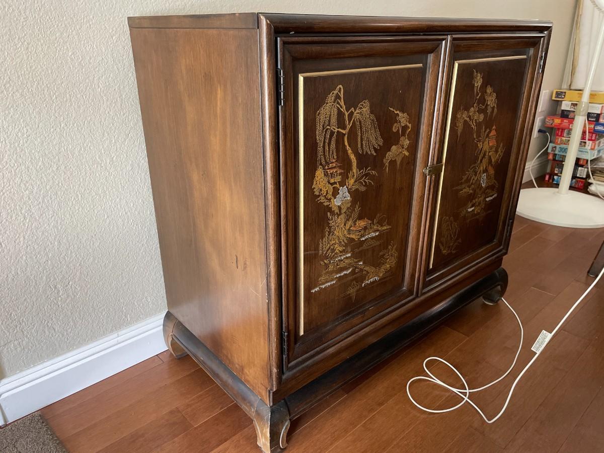 Cabinet is 36x19x33 with painted asian motifs on two doors, one long top drawer inside. Latch needs repair. Some nicks, shown in photos.