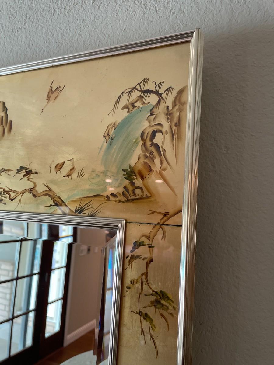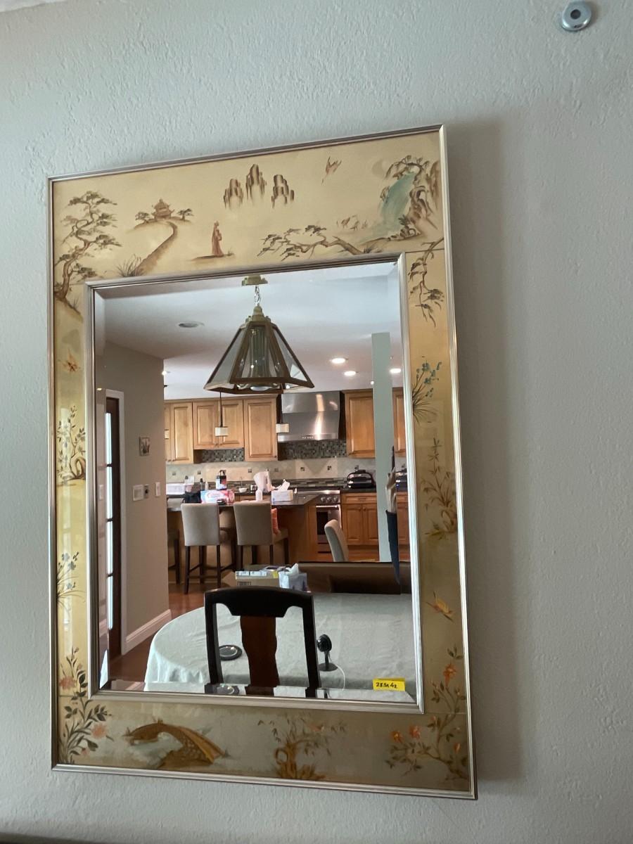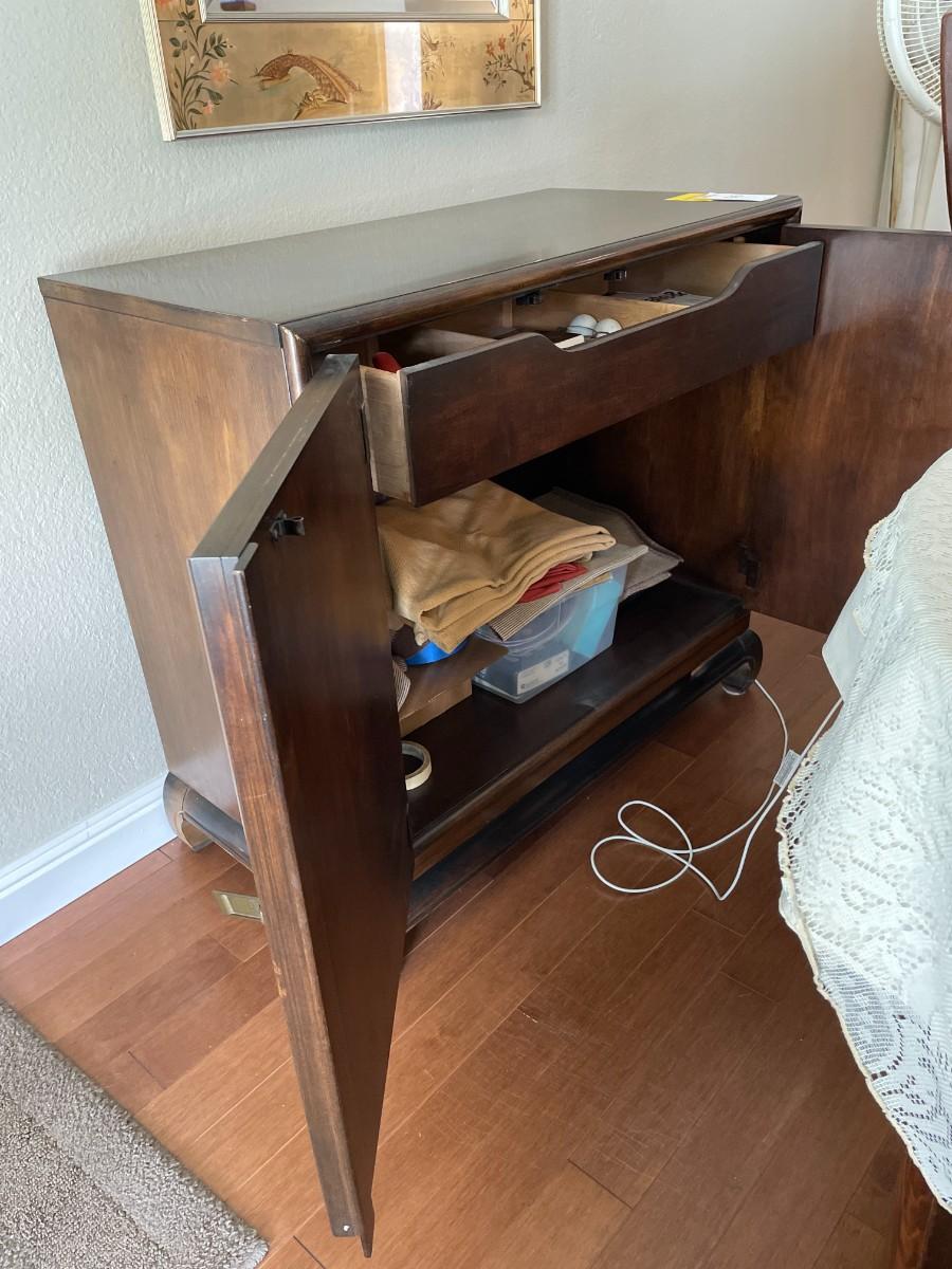 Cabinet is 36x19x33 with painted asian motifs on two doors, one long top drawer inside. Latch needs repair. Some nicks, shown in photos.
