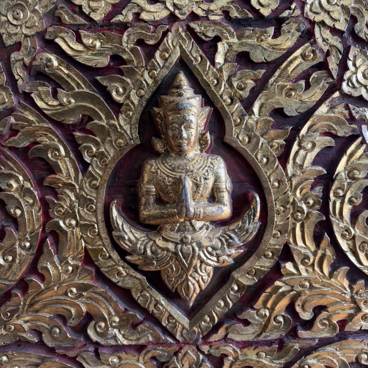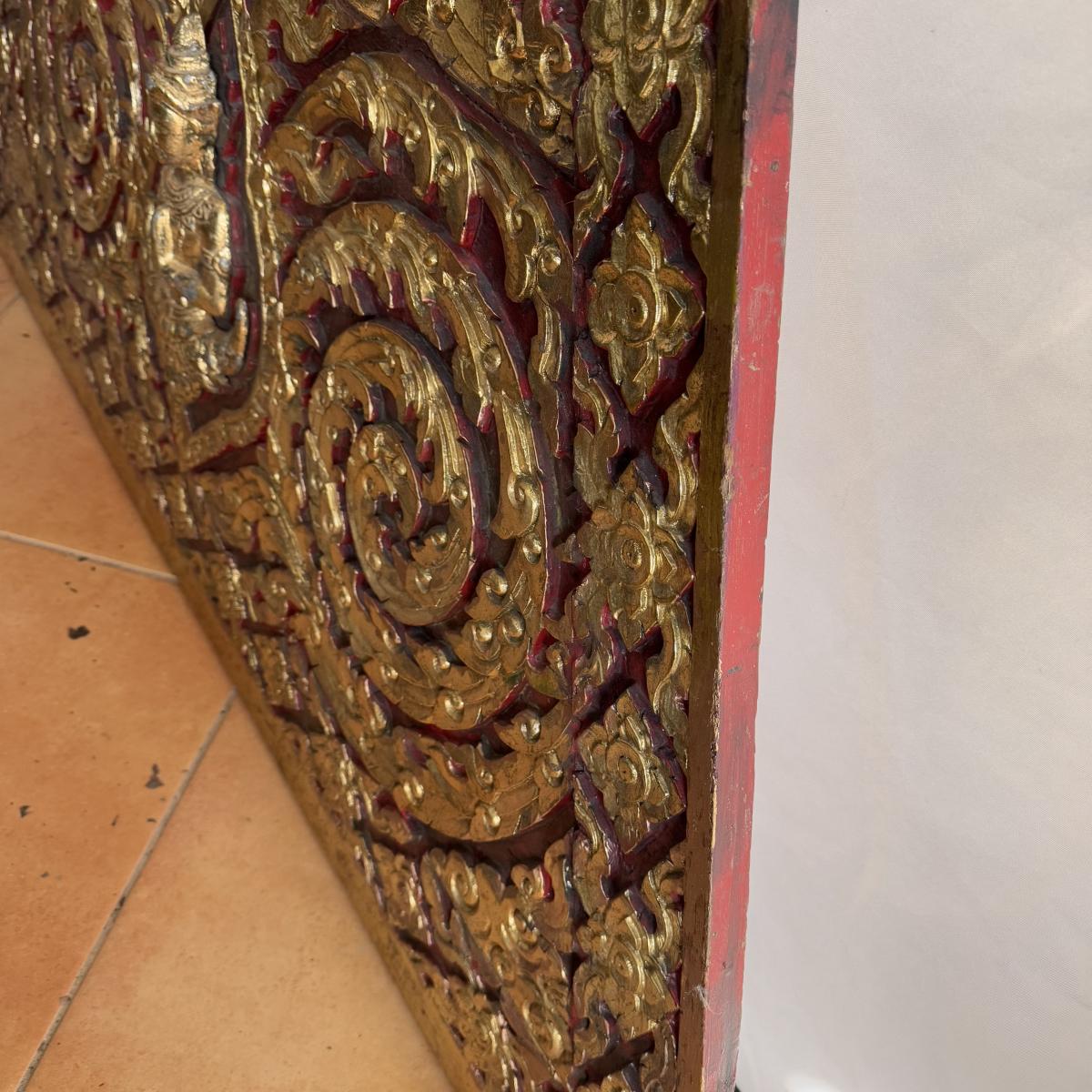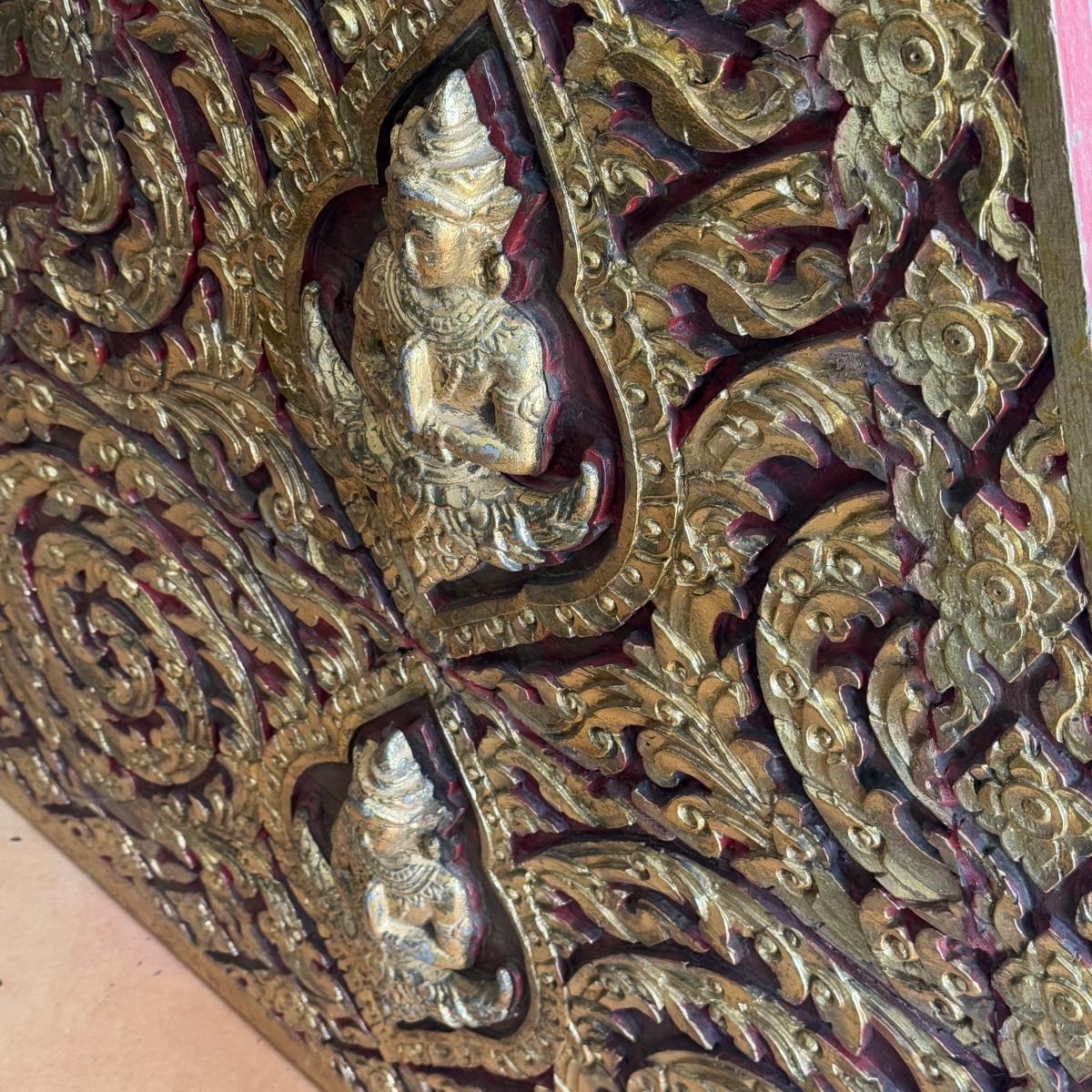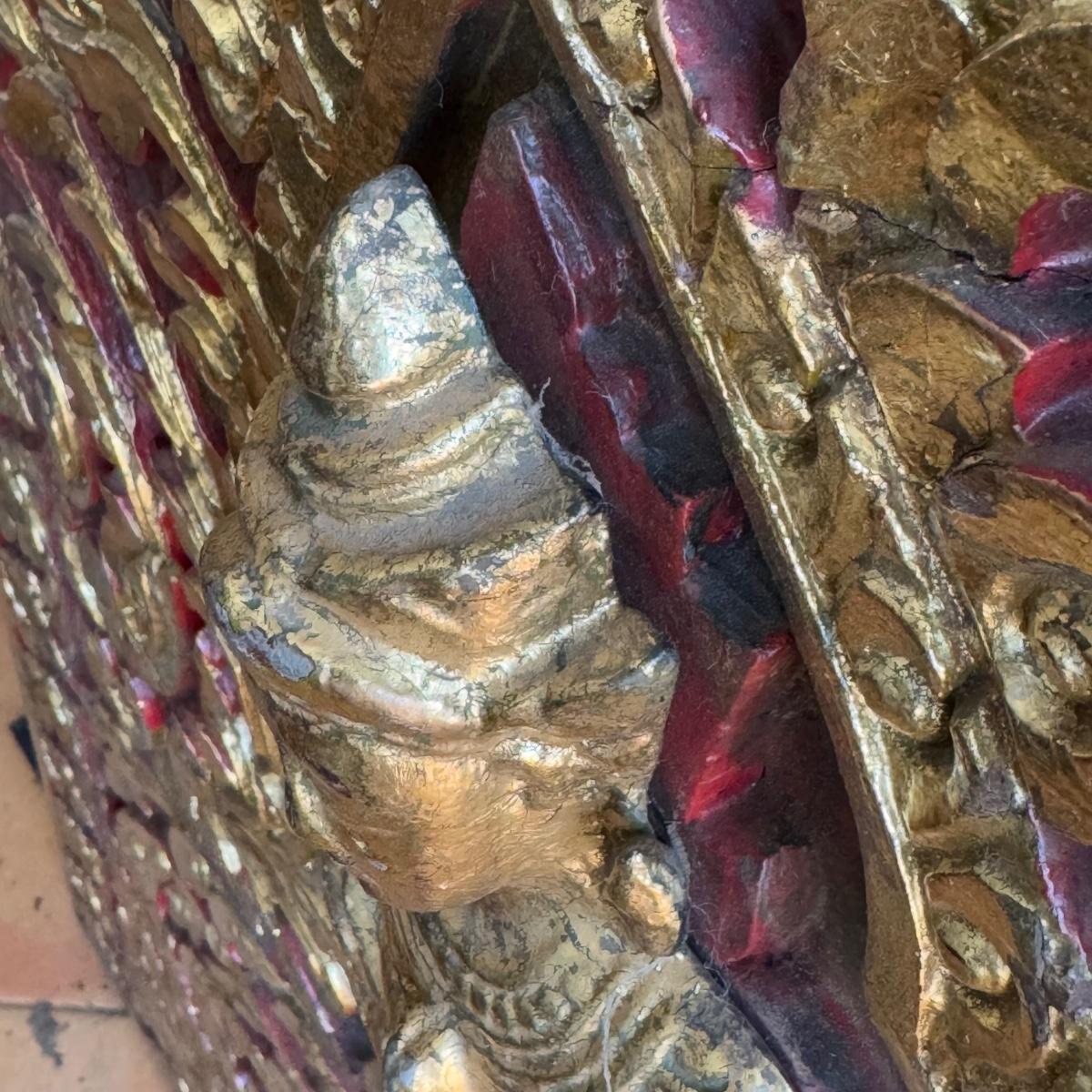 Lot includes one Asian carved and gilded wooden panel that has red and gold features.. The top Buddha is a bit loose - see picture included. The panel measures 57” x 63”H. Local pickup only.