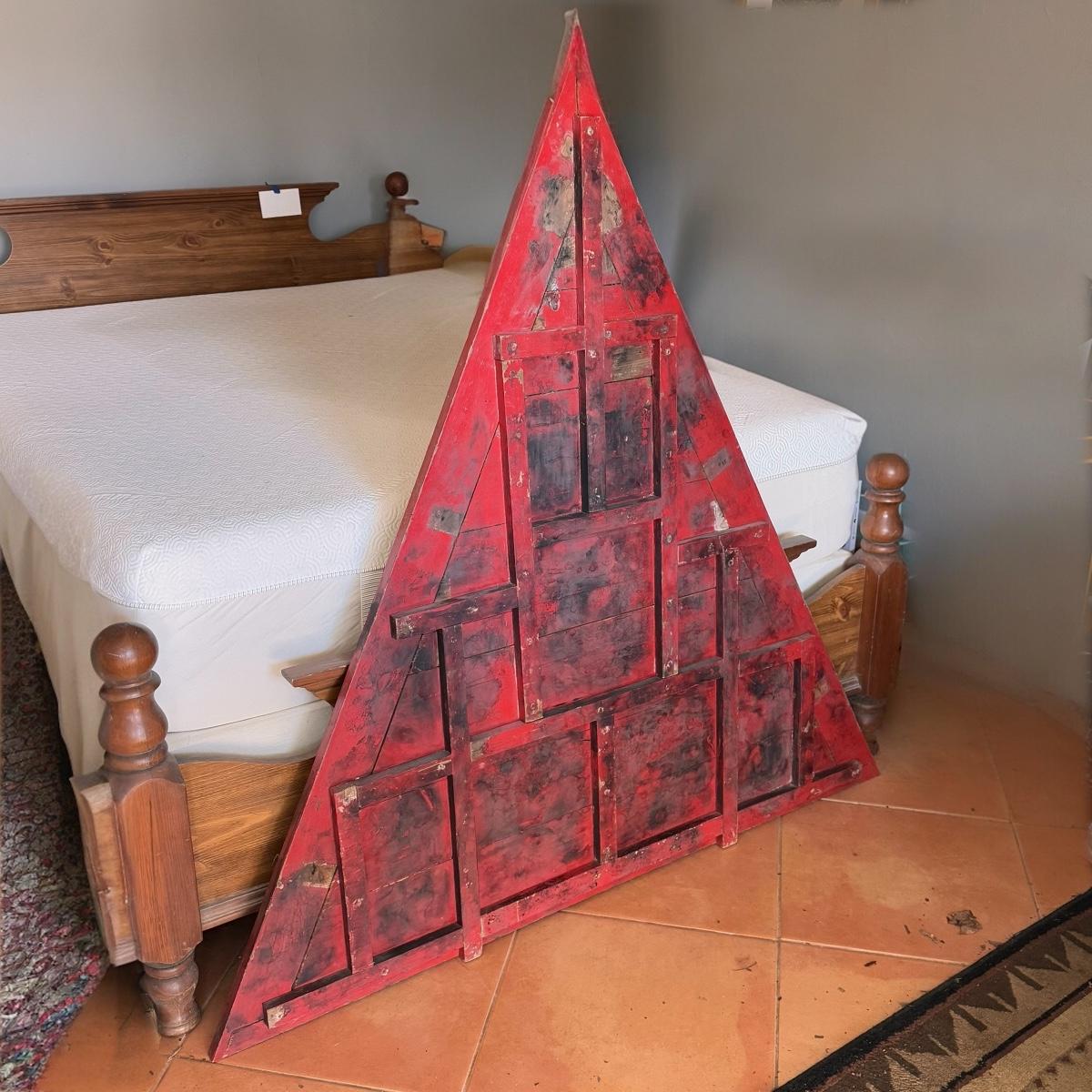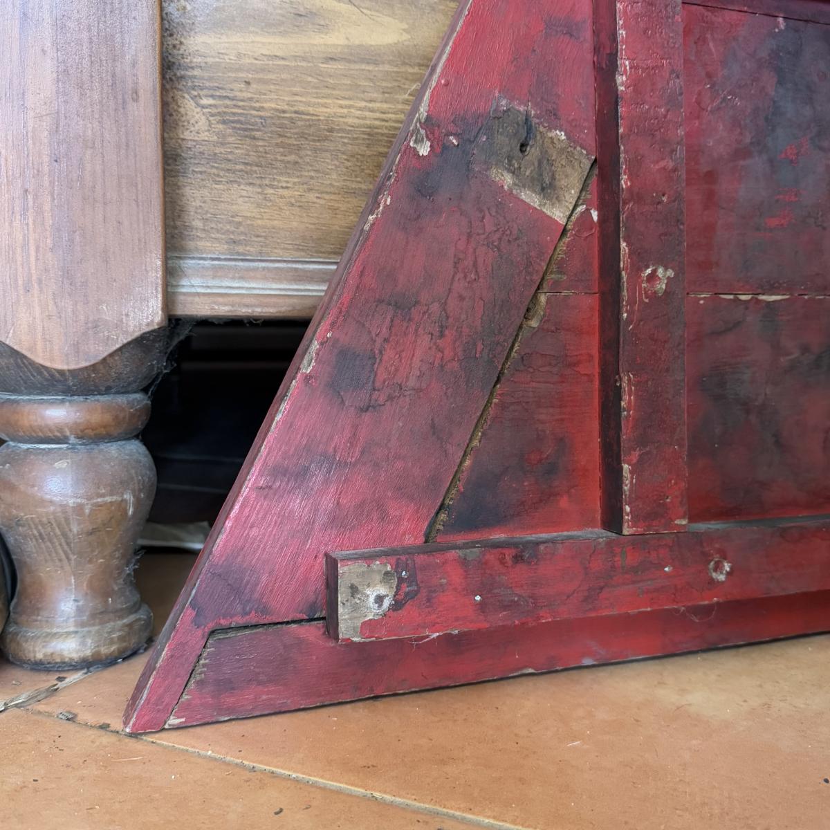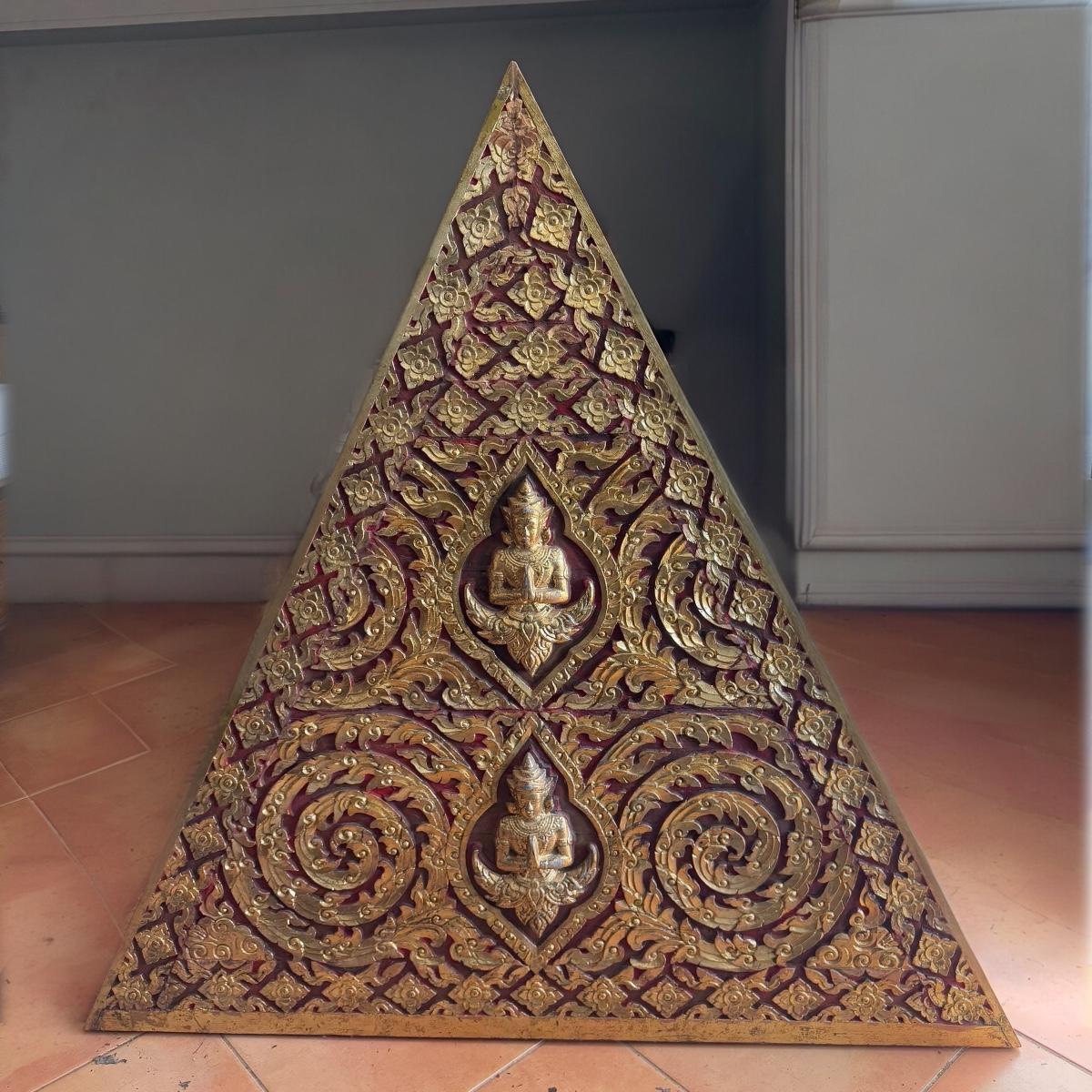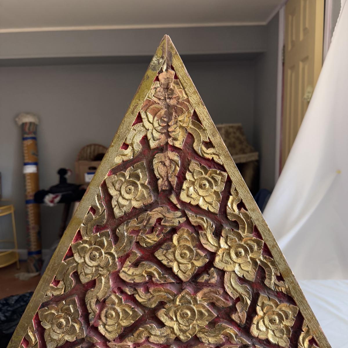 Lot includes one Asian carved and gilded wooden panel that has red and gold features.. The top Buddha is a bit loose - see picture included. The panel measures 57” x 63”H. Local pickup only.