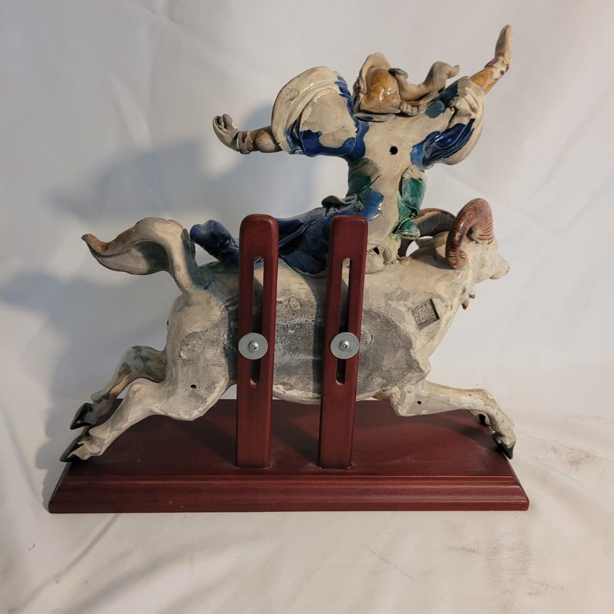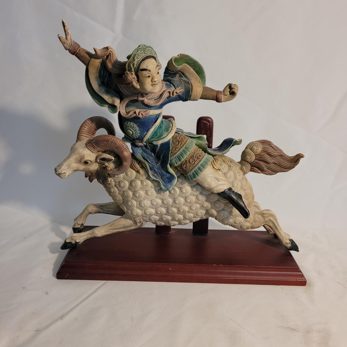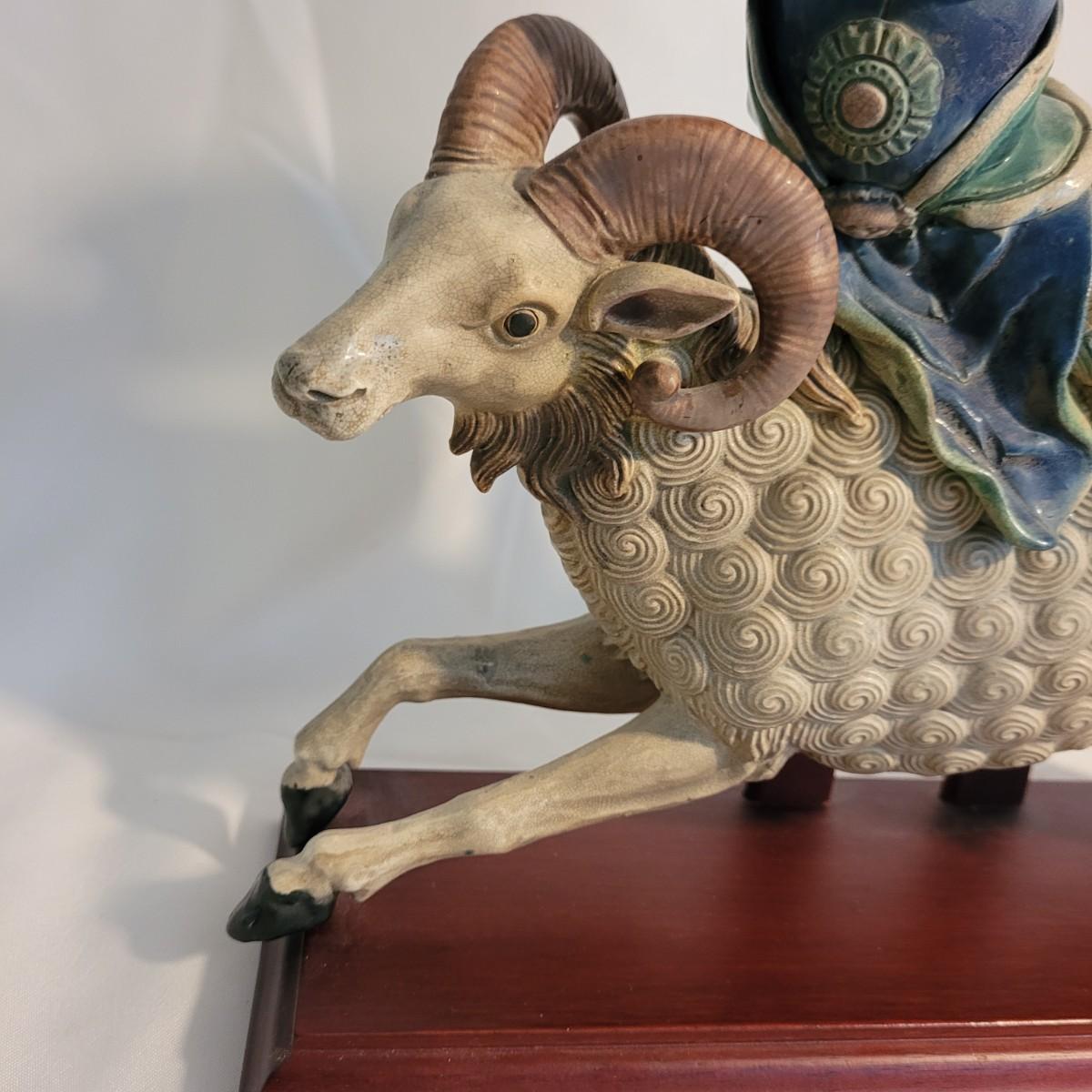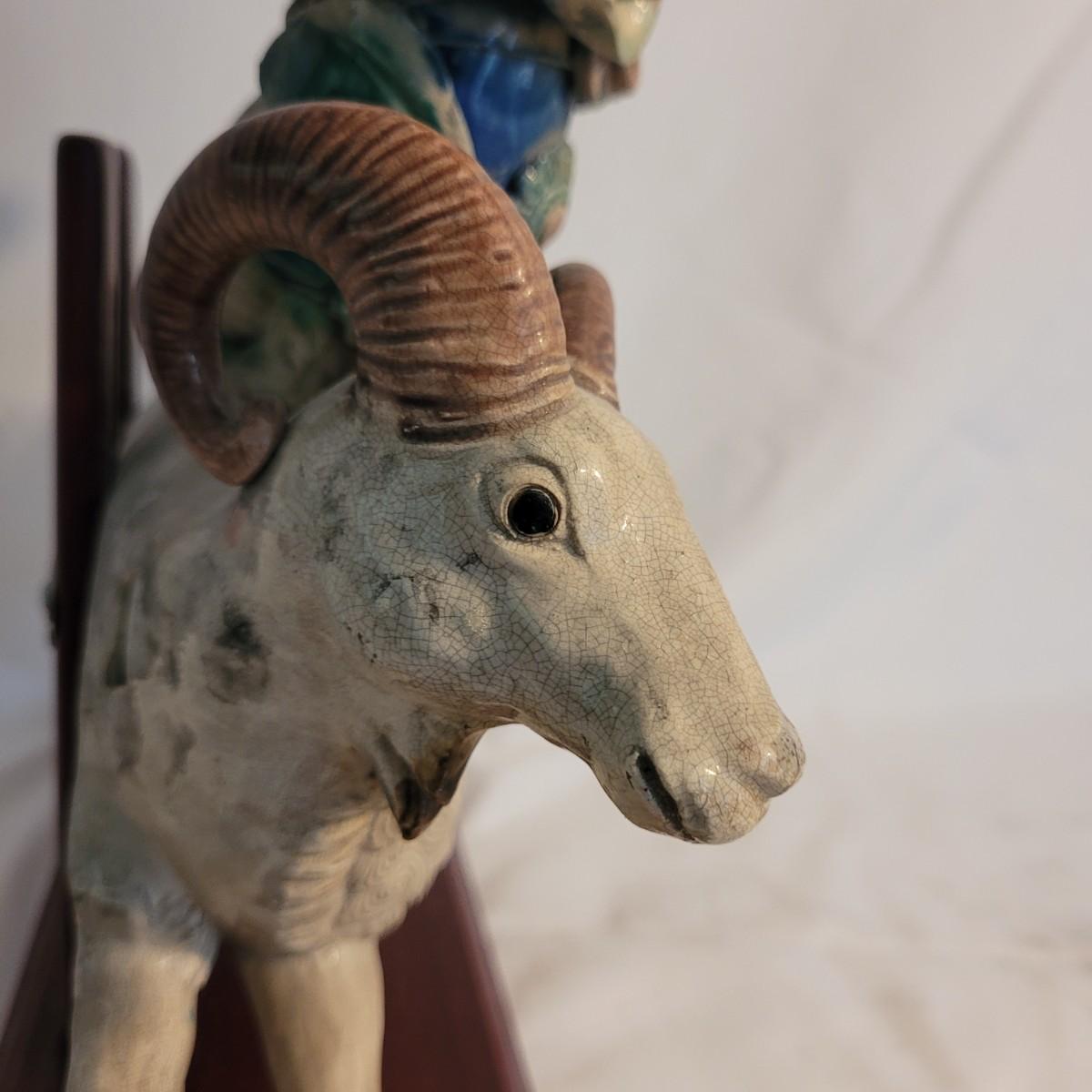 Asian ceramic Sancai on ram in the style of Chinese roof tile placed on temple roof top ridges. Statue in excellent condition, wooden base has small scratches in front and on back posts. Measures approximately 13.5"L x5"W x13"H. Shipping available.