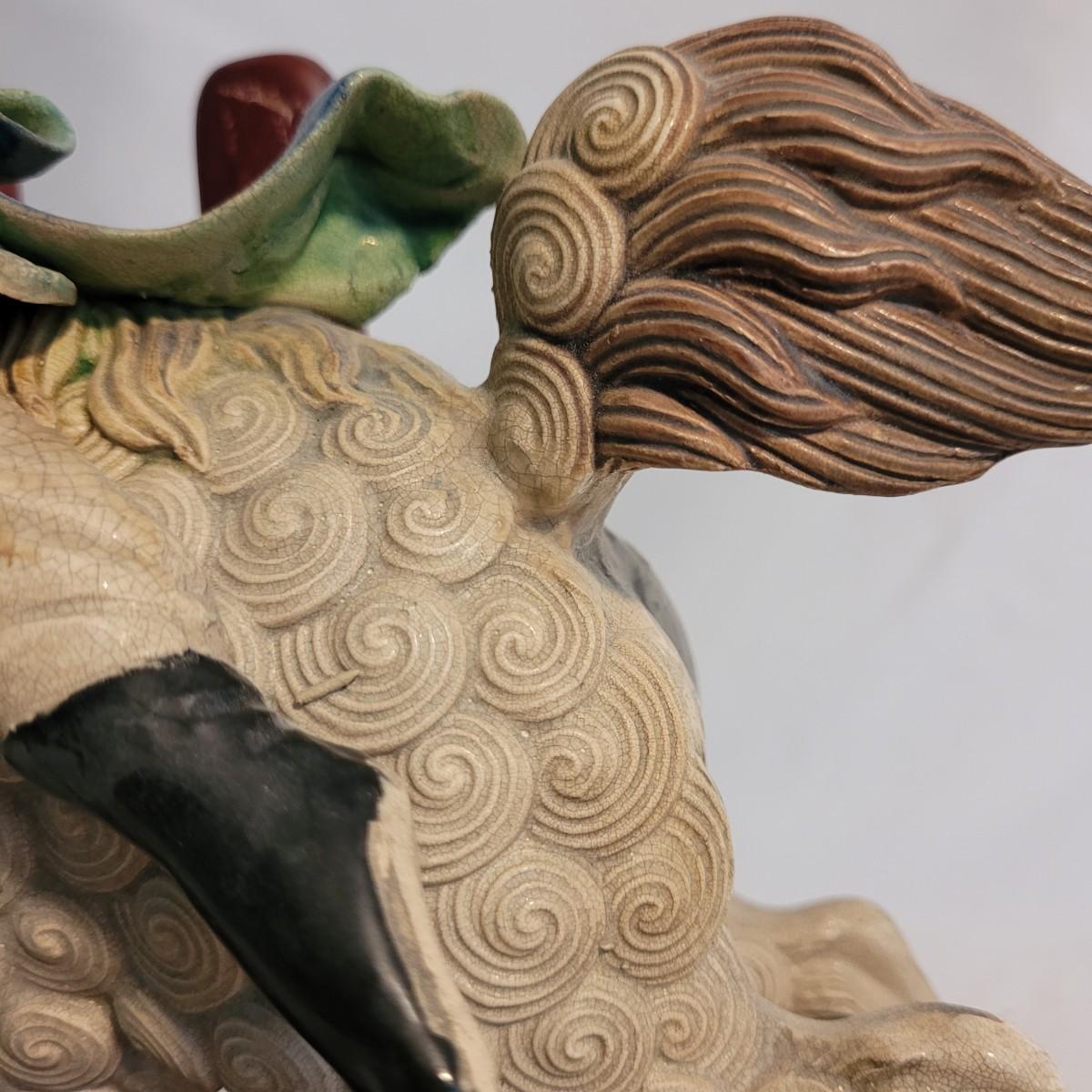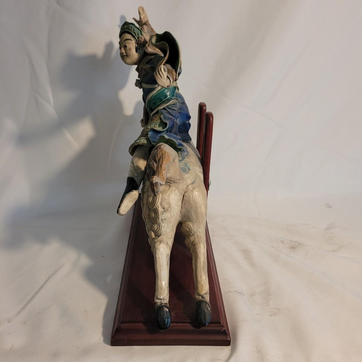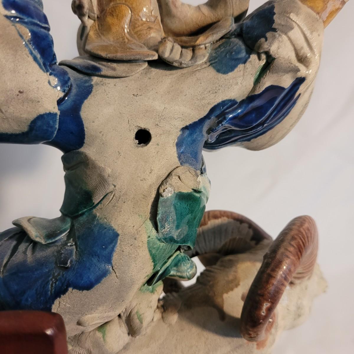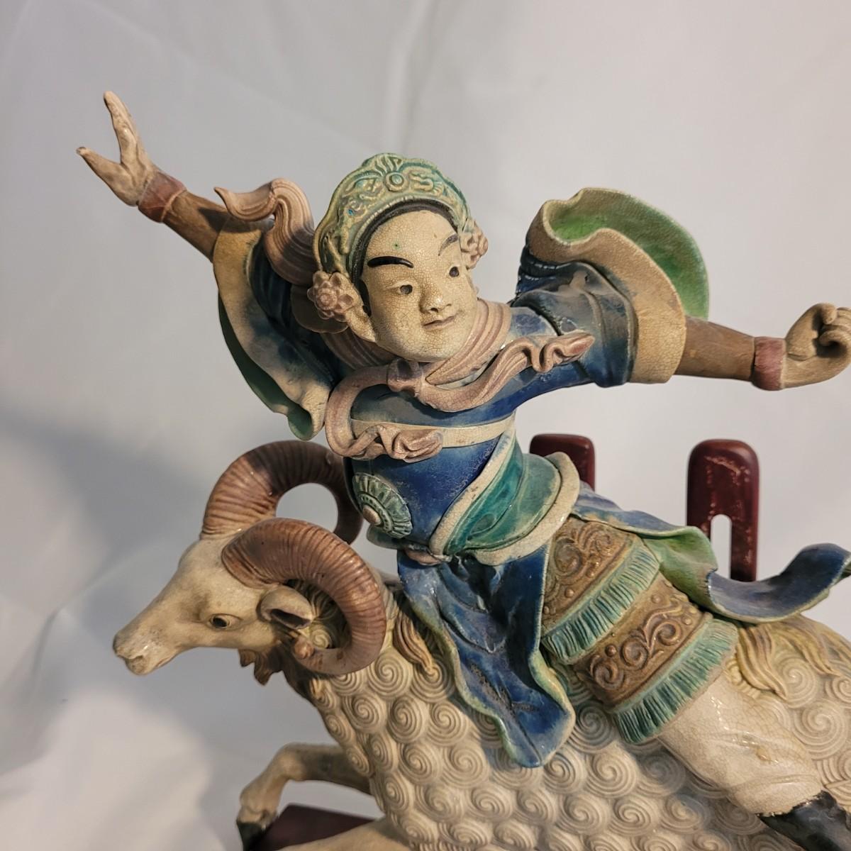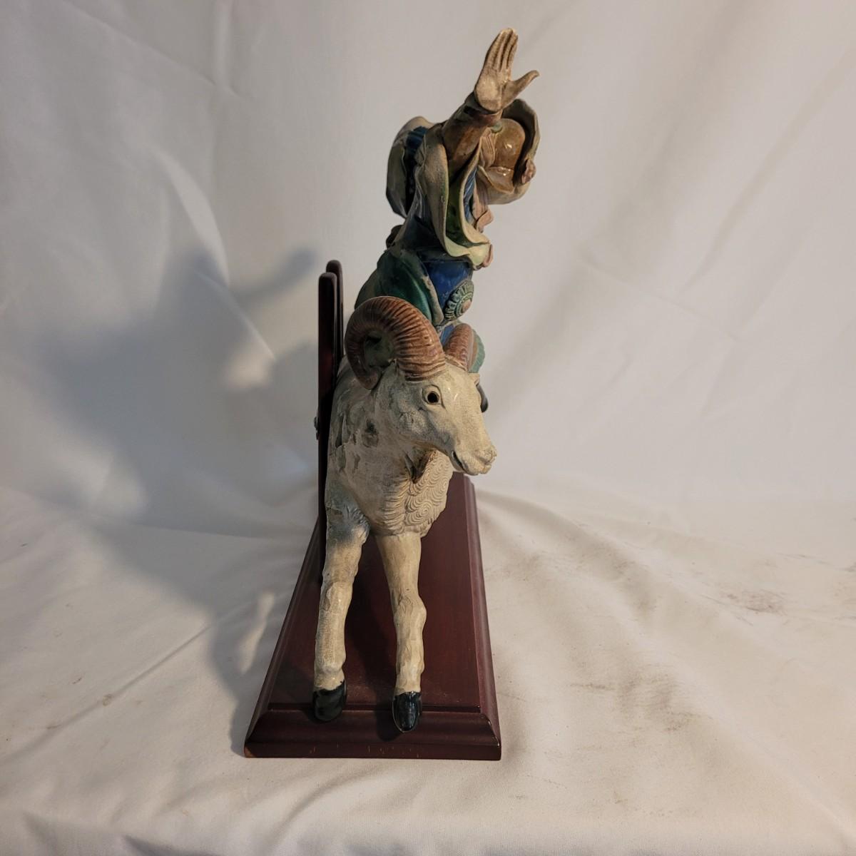 Asian ceramic Sancai on ram in the style of Chinese roof tile placed on temple roof top ridges. Statue in excellent condition, wooden base has small scratches in front and on back posts. Measures approximately 13.5"L x5"W x13"H. Shipping available.
