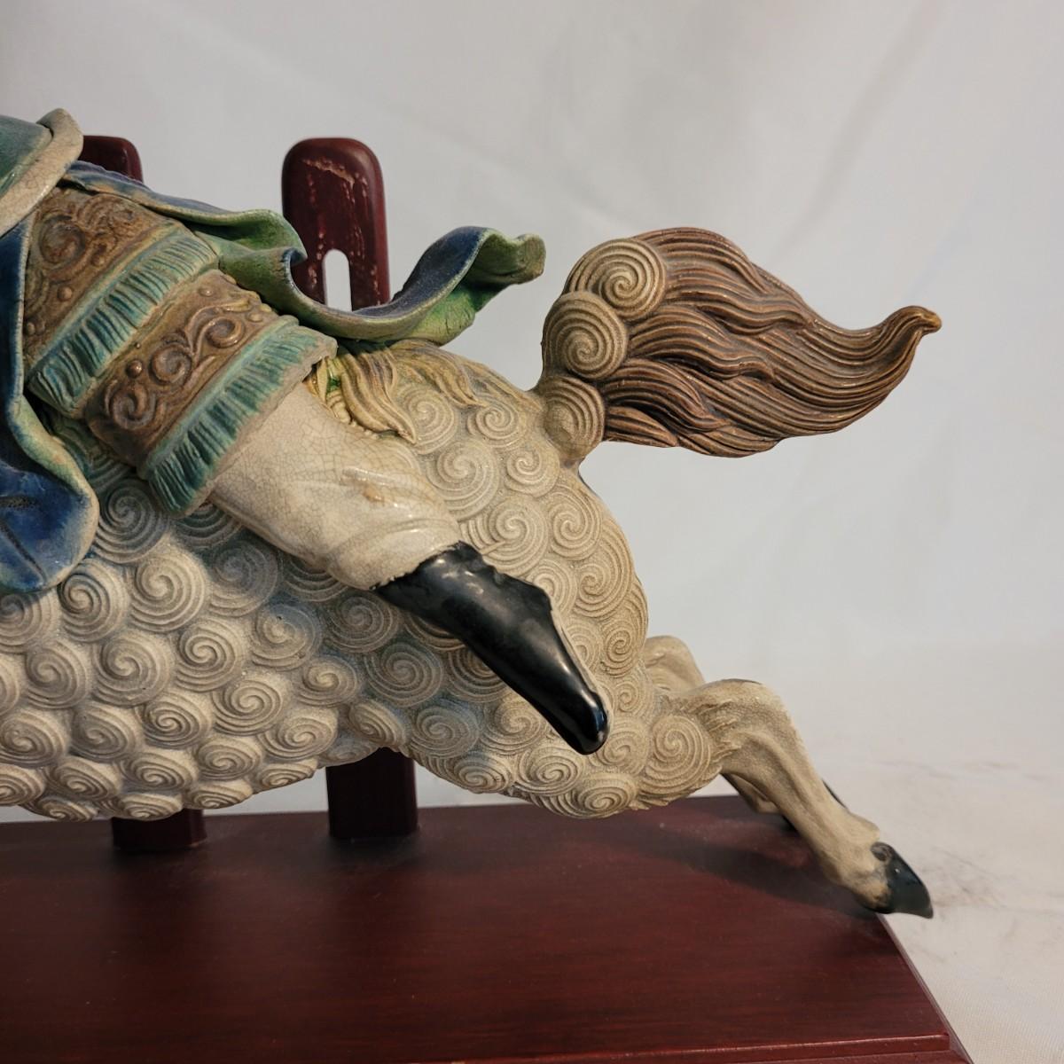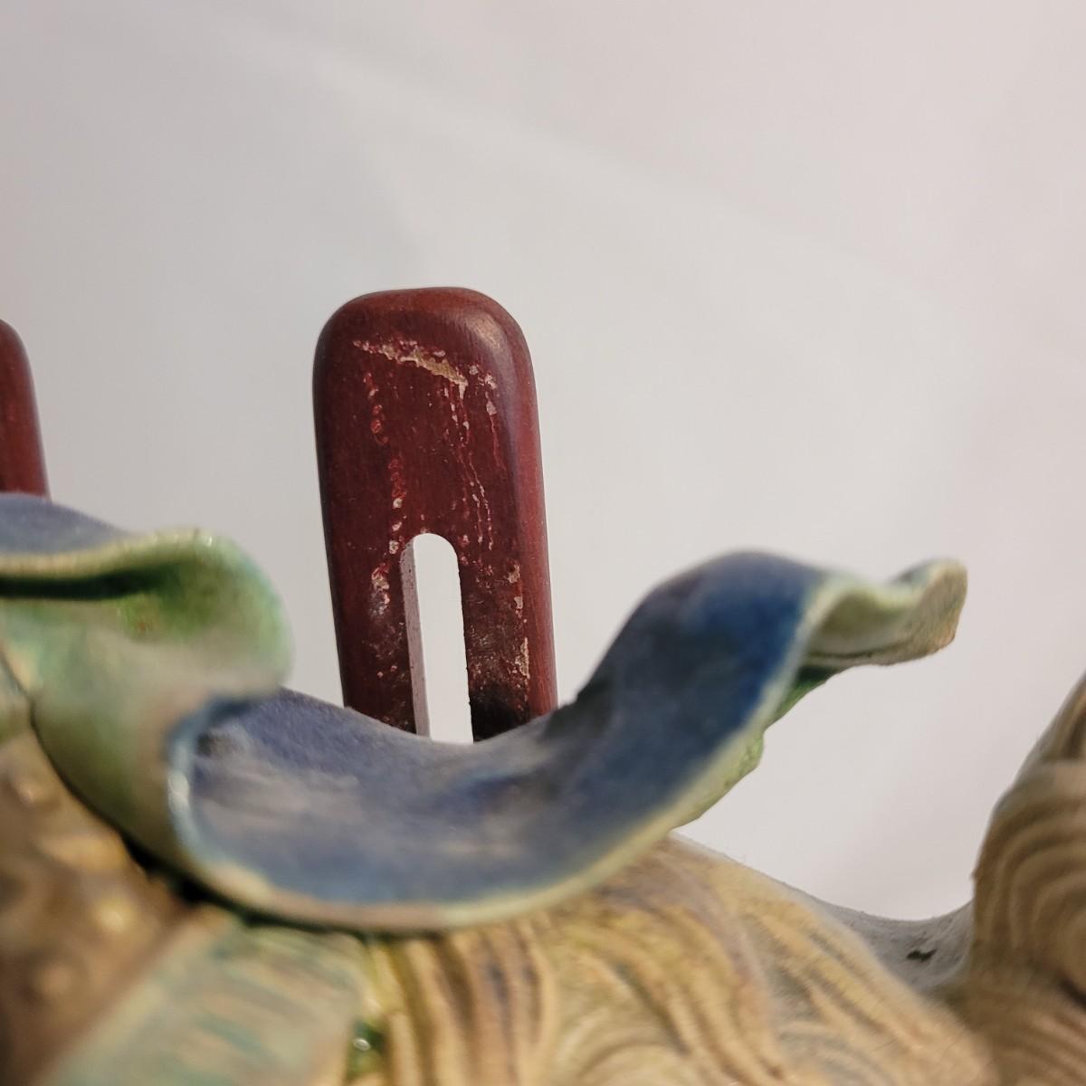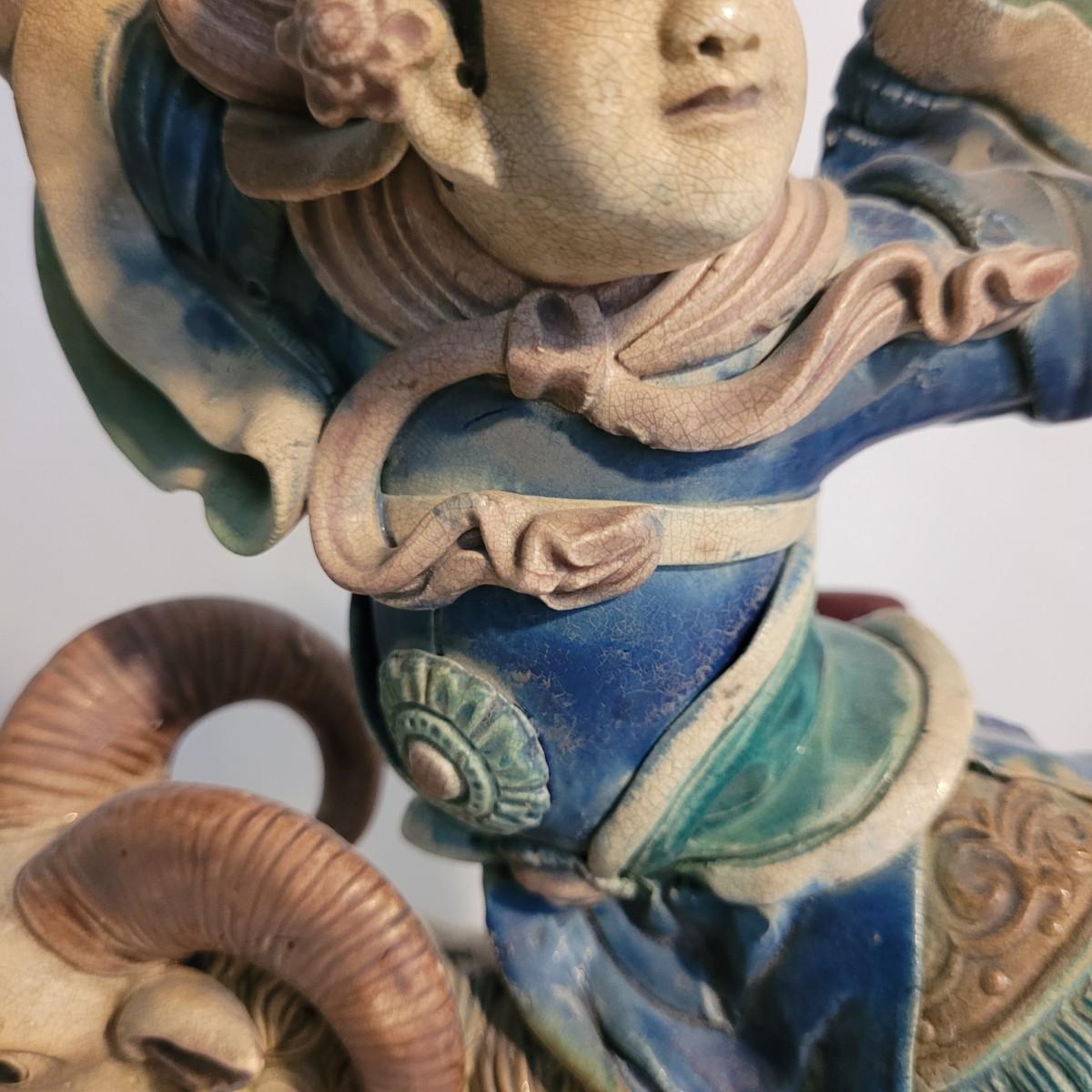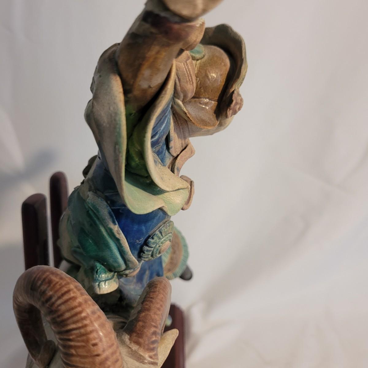 Asian ceramic Sancai on ram in the style of Chinese roof tile placed on temple roof top ridges. Statue in excellent condition, wooden base has small scratches in front and on back posts. Measures approximately 13.5"L x5"W x13"H. Shipping available.