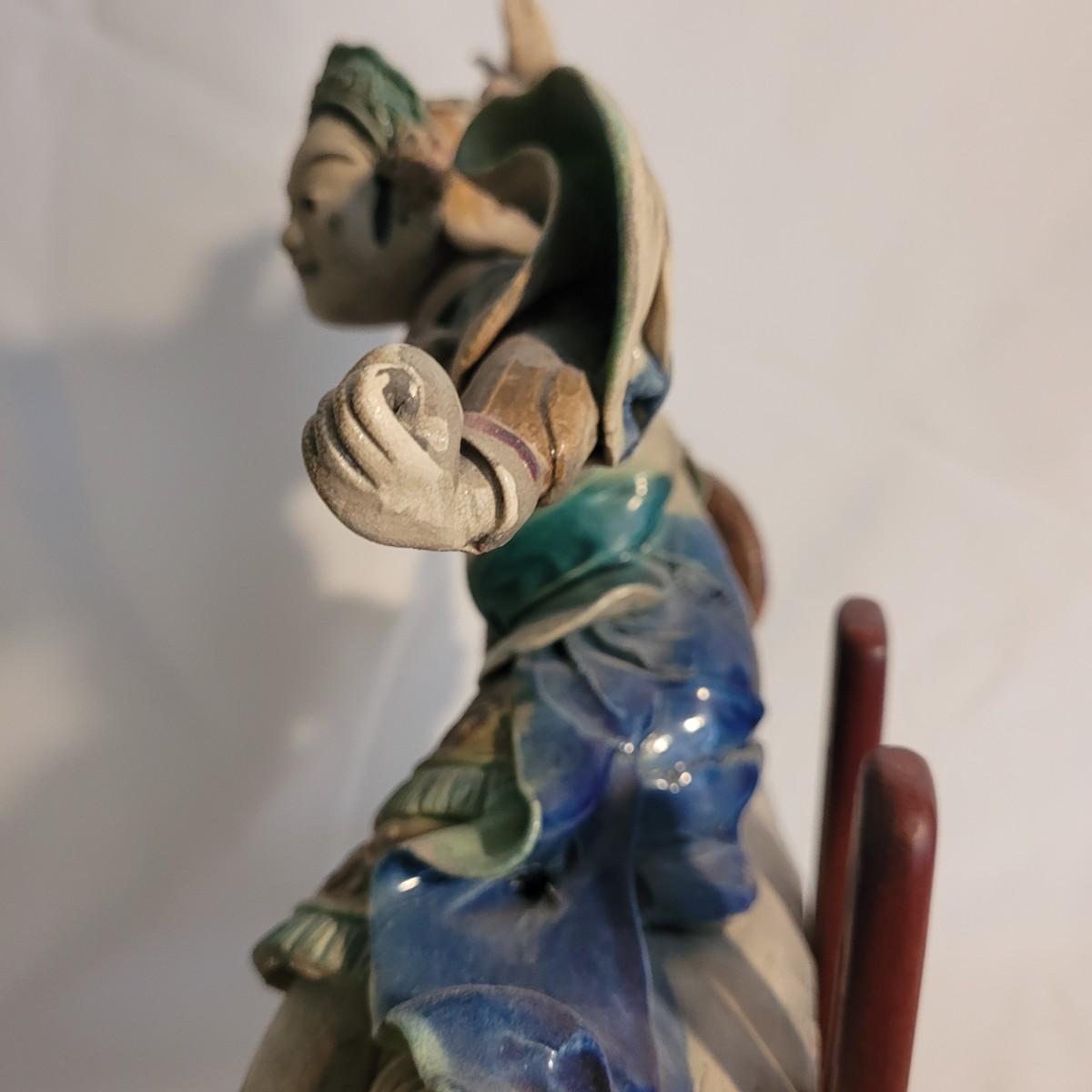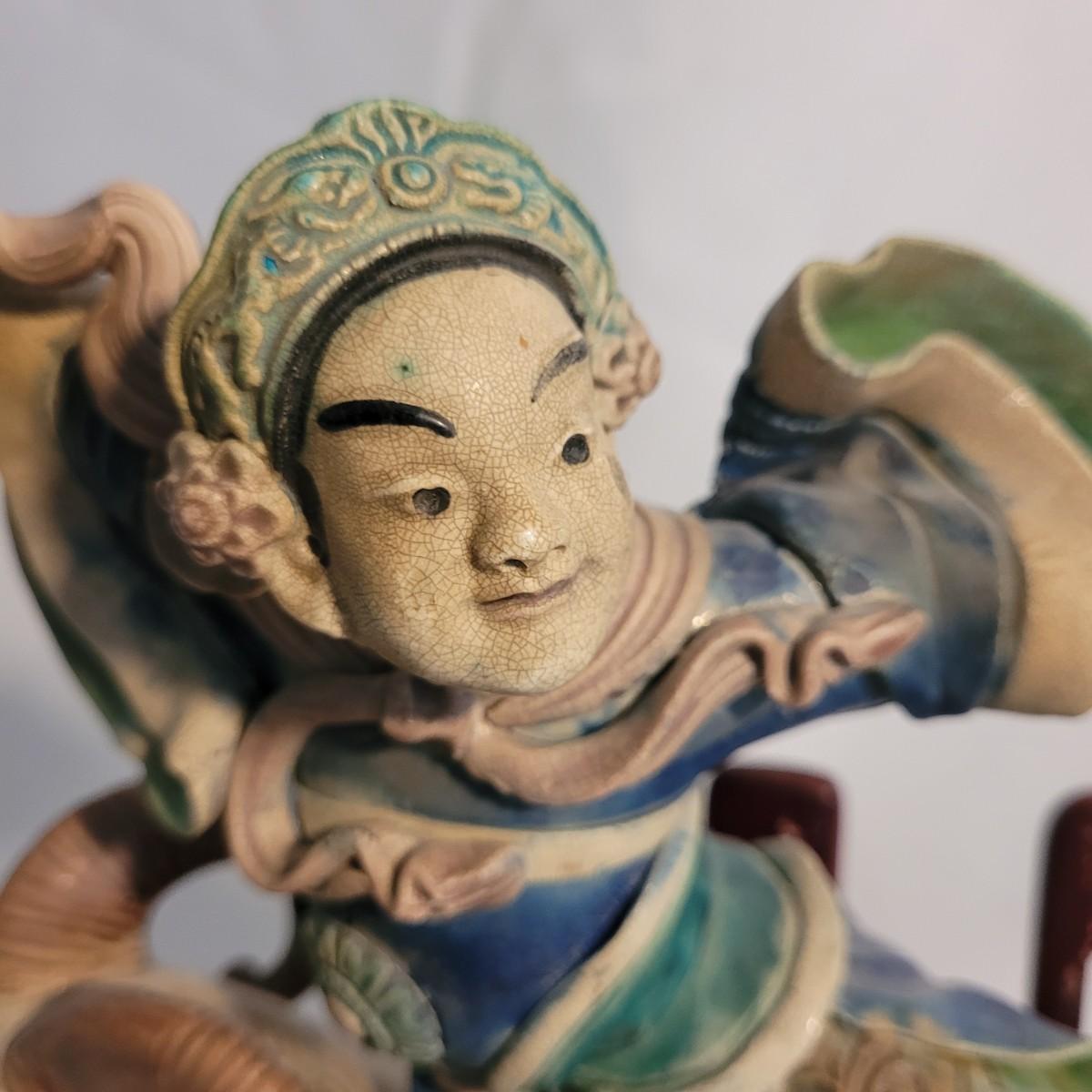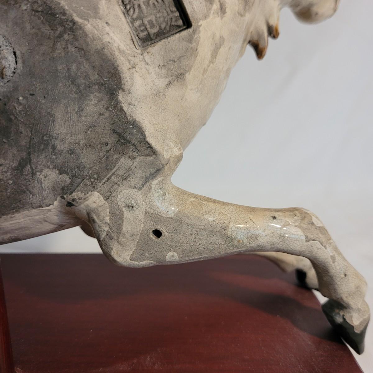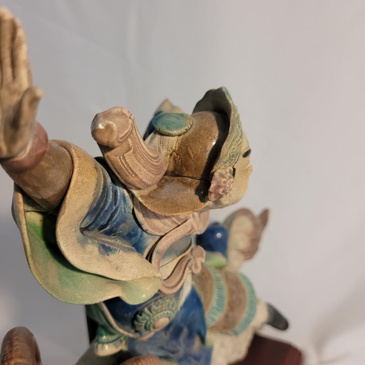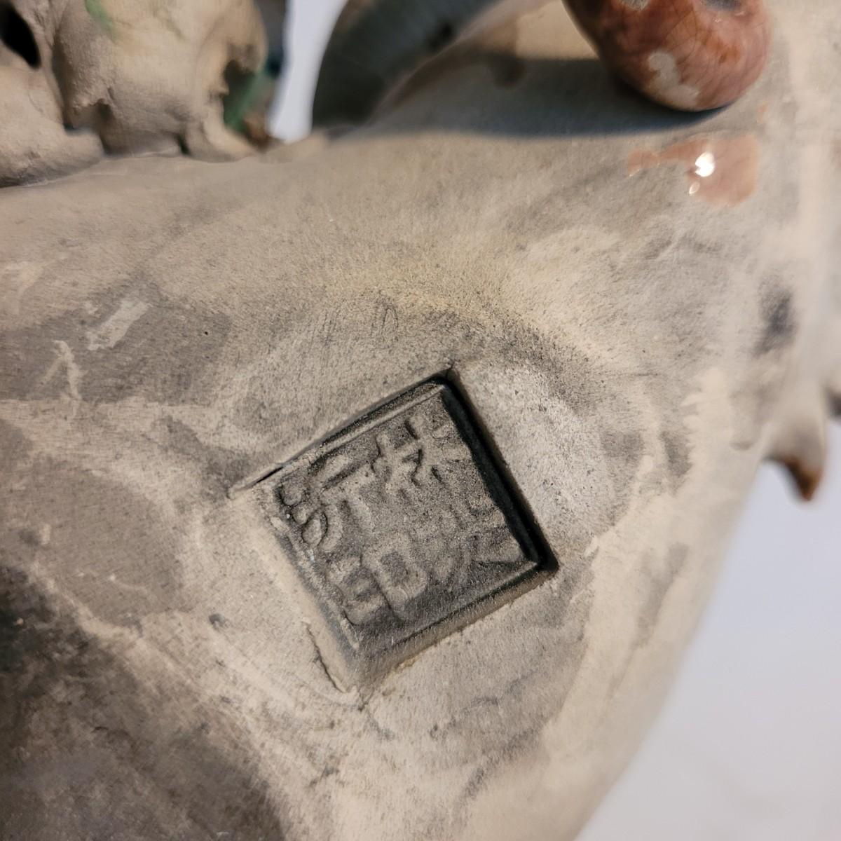 Asian ceramic Sancai on ram in the style of Chinese roof tile placed on temple roof top ridges. Statue in excellent condition, wooden base has small scratches in front and on back posts. Measures approximately 13.5"L x5"W x13"H. Shipping available.