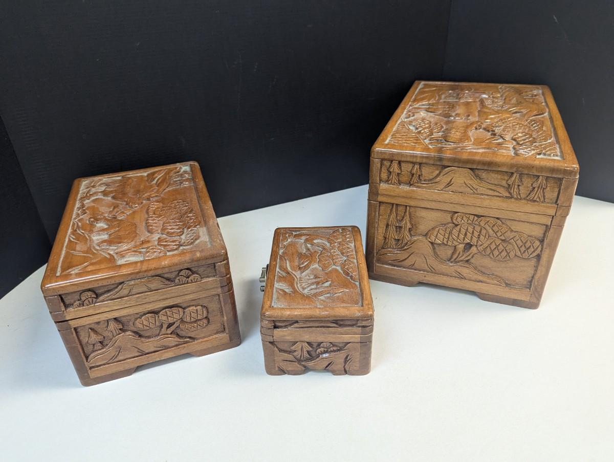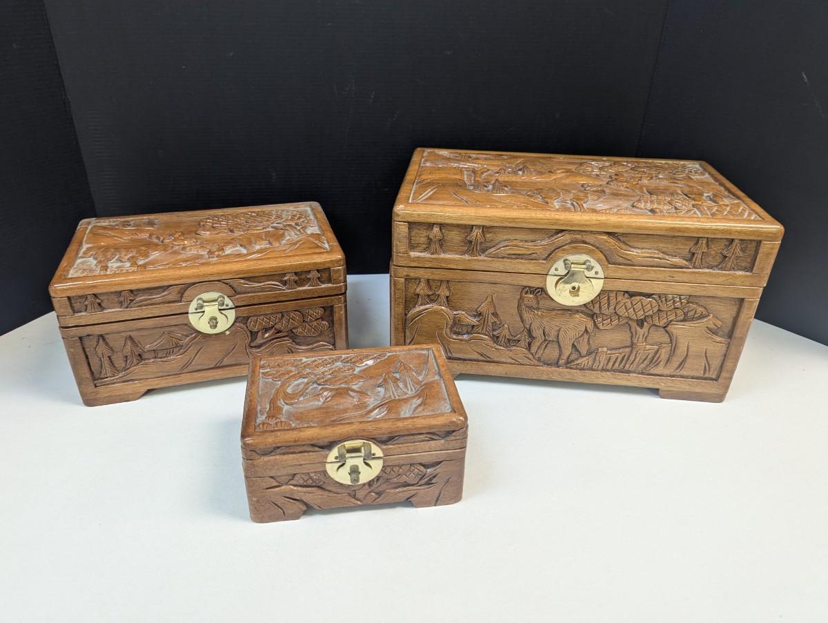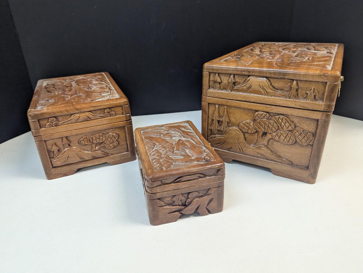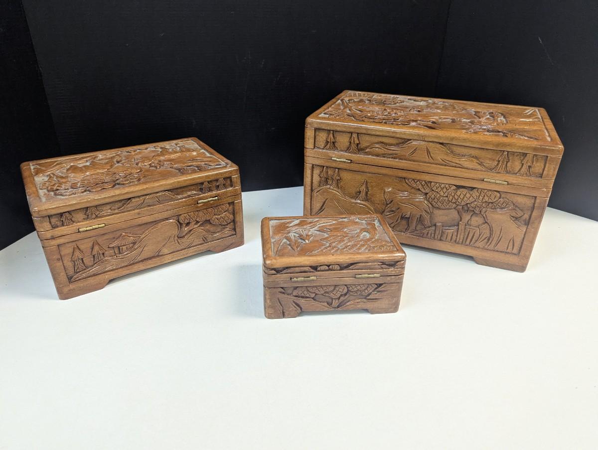 Asian Chinese Hand Carved Nesting Jewelry Chests