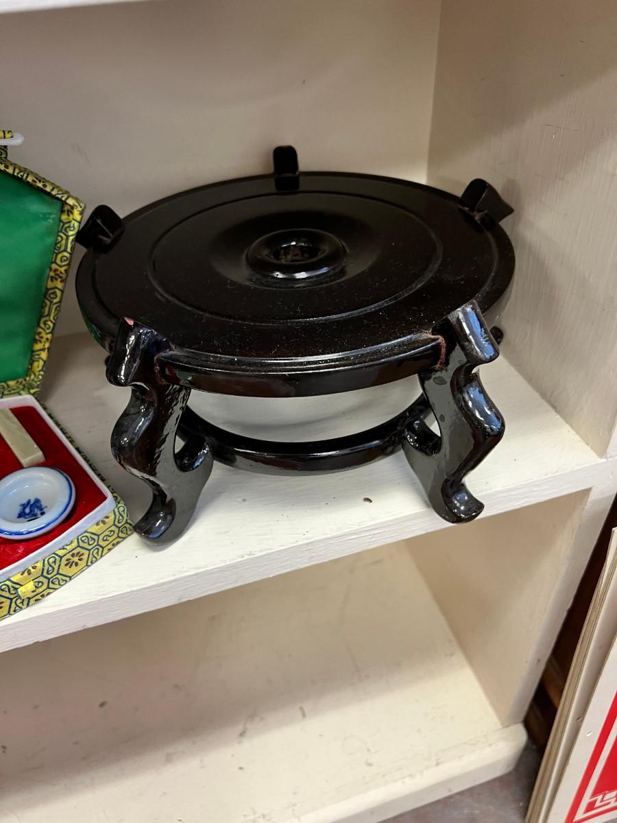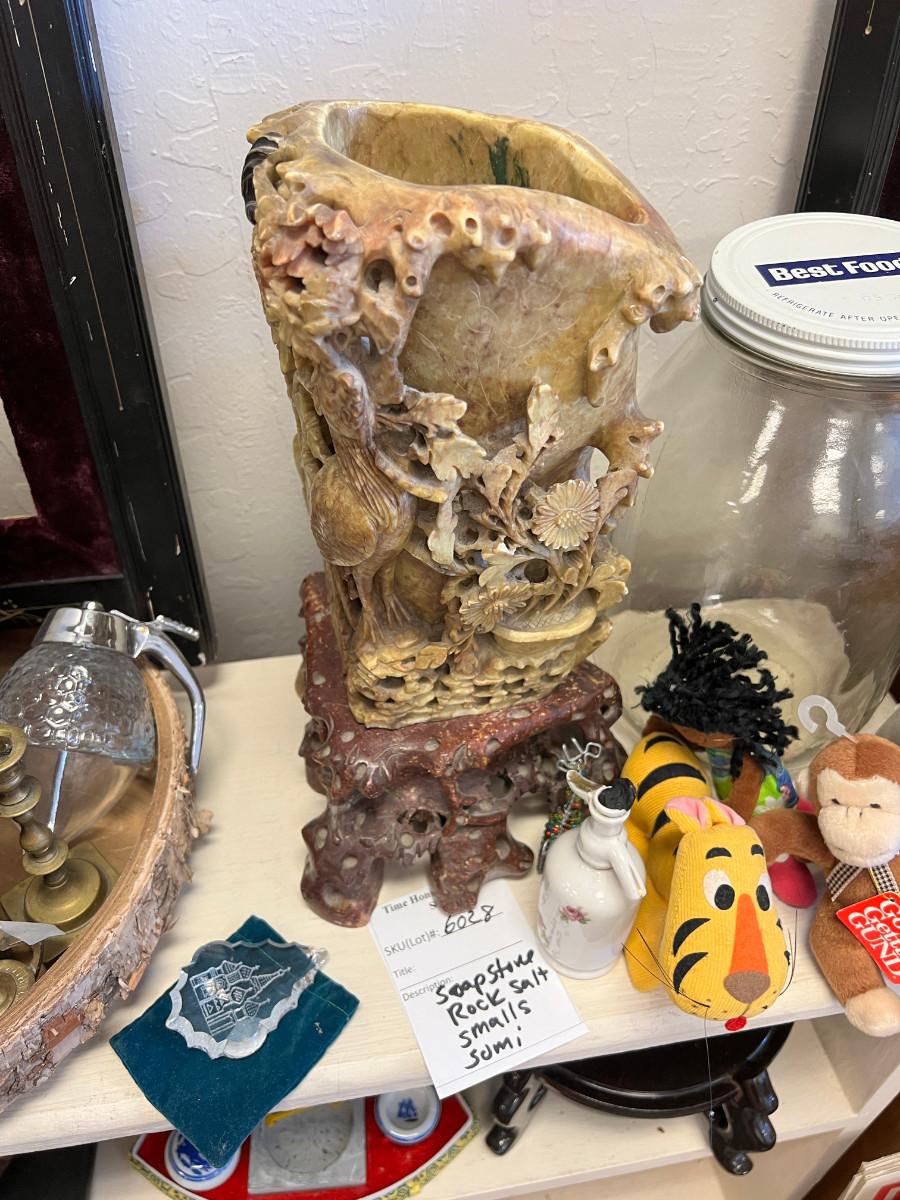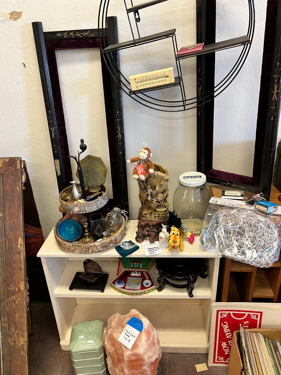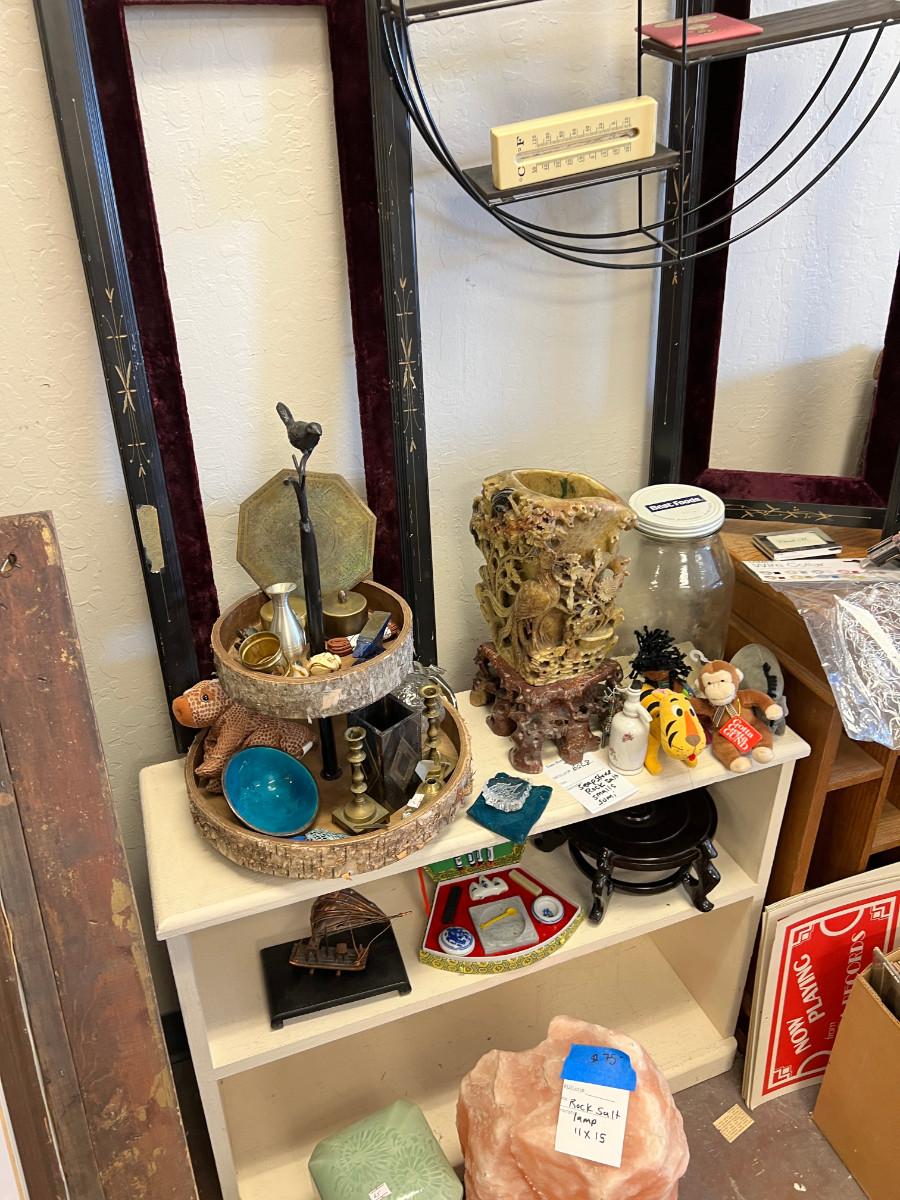 Wall black wire with stands display, traditional round Chinese stand. Amazing Soap Stone carving of an Octopus. Heavy and has 2 pieces. Very large and very heavy Himalayan pink salt lamp, missing bulb, breaks into 2 pieces Sumi painting set, multi chamber Celedon trinket box. 2 Antique scroll holders with red velvet. Eeyore and Tigger early Dakin dream pets. A two tier bird display with natural wood shelves. Miniature items are on the shelves. there is a metal sailboat junk on a stand. White shelf not included. No Shipping