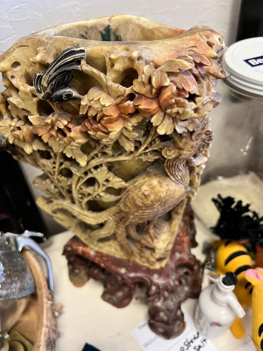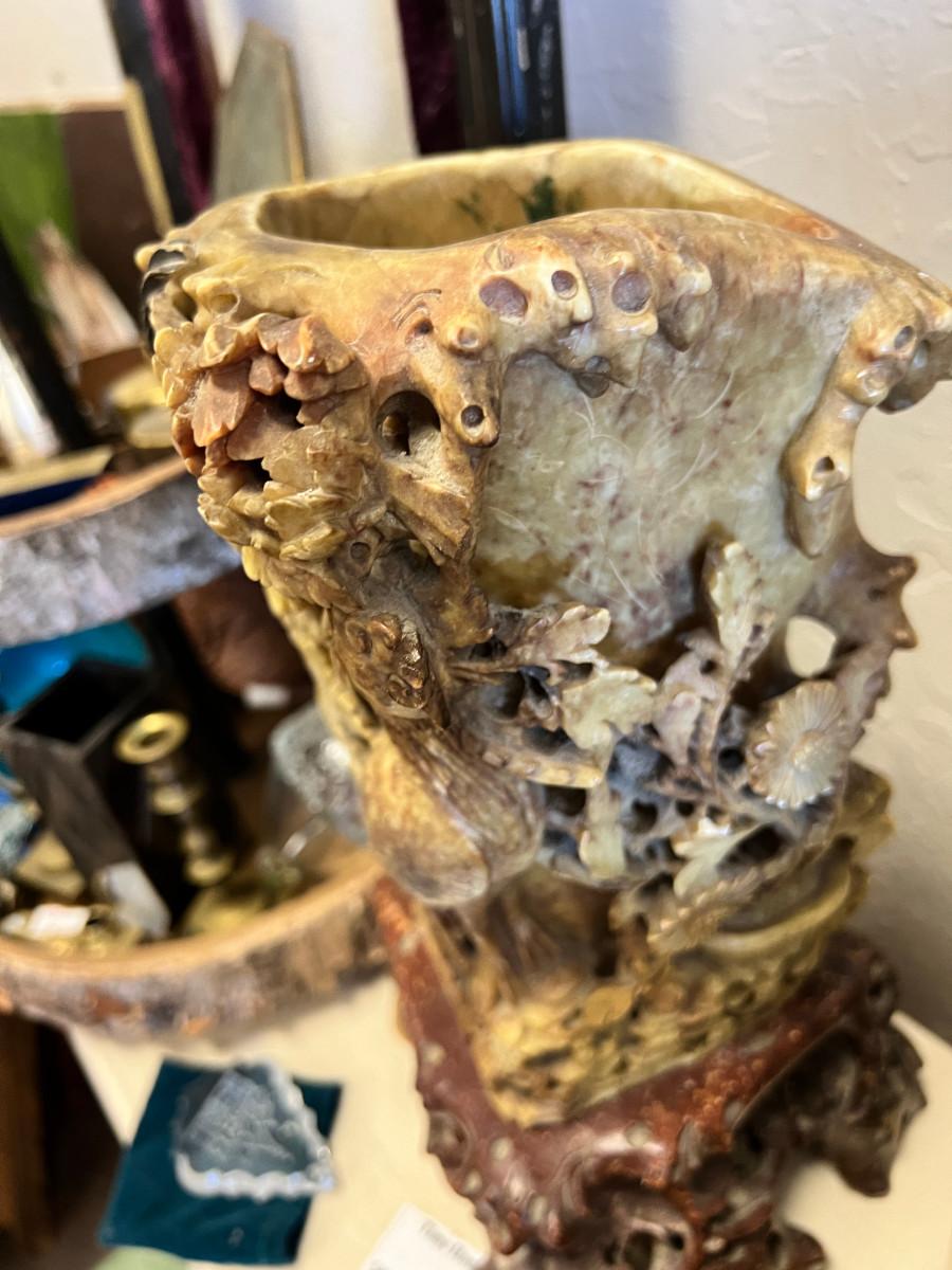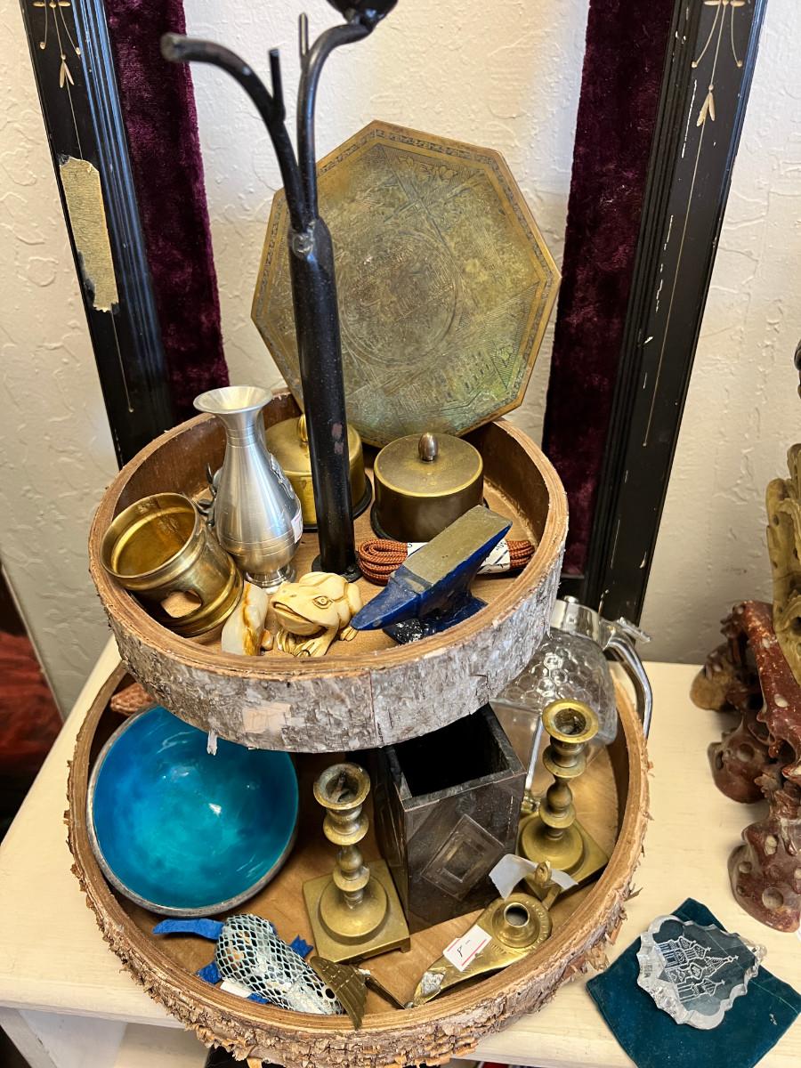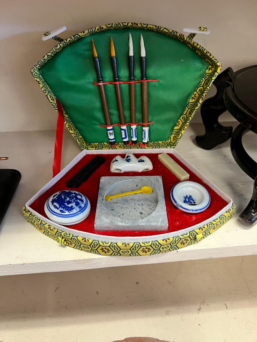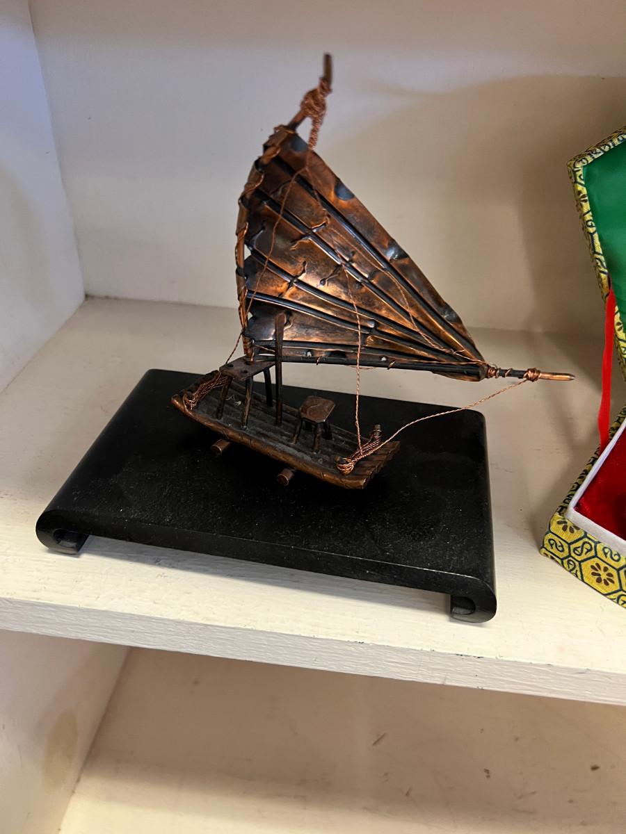Wall black wire with stands display, traditional round Chinese stand. Amazing Soap Stone carving of an Octopus. Heavy and has 2 pieces. Very large and very heavy Himalayan pink salt lamp, missing bulb, breaks into 2 pieces Sumi painting set, multi chamber Celedon trinket box. 2 Antique scroll holders with red velvet. Eeyore and Tigger early Dakin dream pets. A two tier bird display with natural wood shelves. Miniature items are on the shelves. there is a metal sailboat junk on a stand. White shelf not included. No Shipping