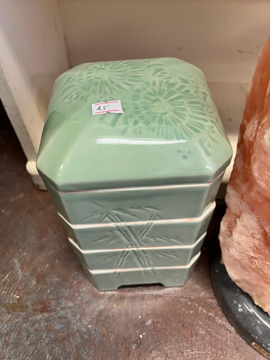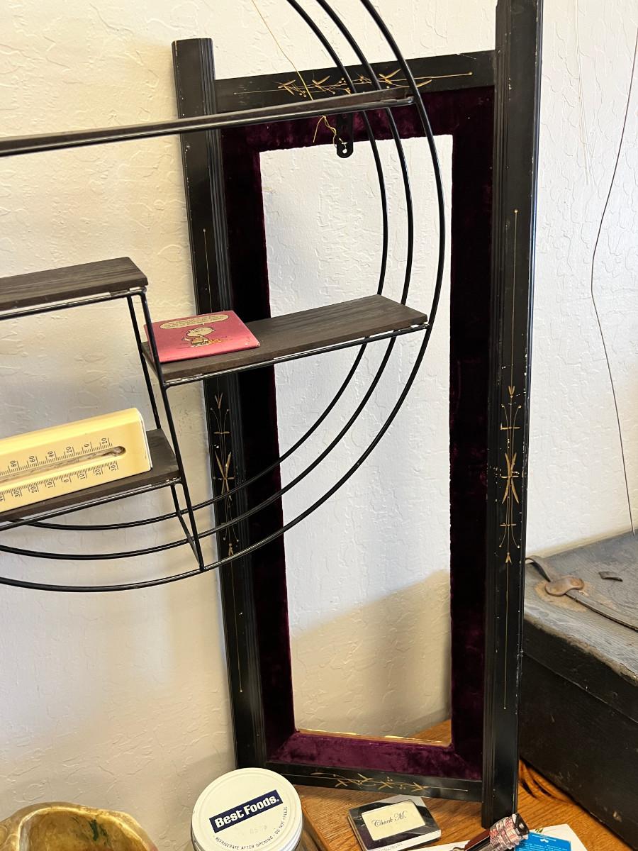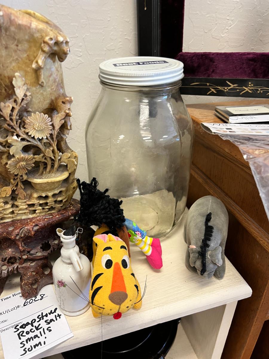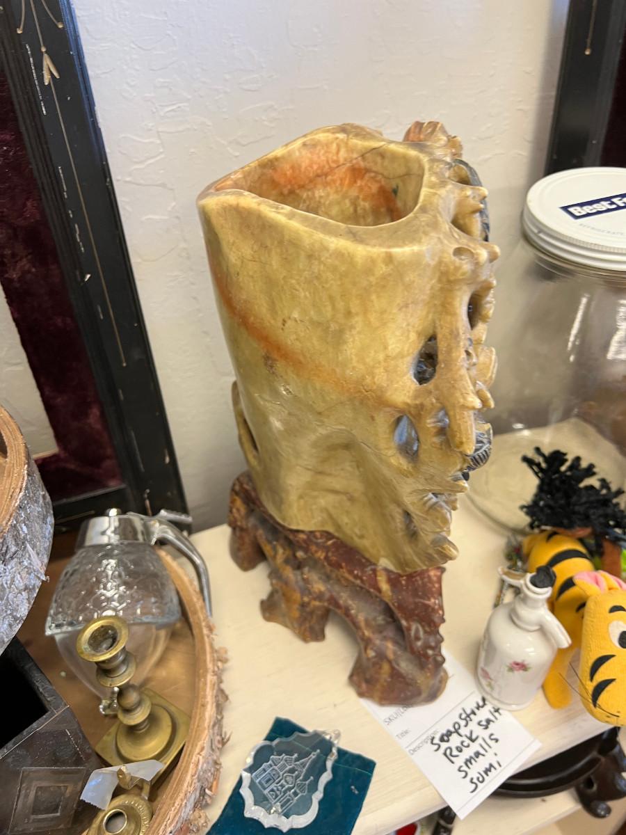 Wall black wire with stands display, traditional round Chinese stand. Amazing Soap Stone carving of an Octopus. Heavy and has 2 pieces. Very large and very heavy Himalayan pink salt lamp, missing bulb, breaks into 2 pieces Sumi painting set, multi chamber Celedon trinket box. 2 Antique scroll holders with red velvet. Eeyore and Tigger early Dakin dream pets. A two tier bird display with natural wood shelves. Miniature items are on the shelves. there is a metal sailboat junk on a stand. White shelf not included. No Shipping