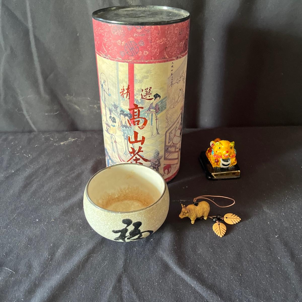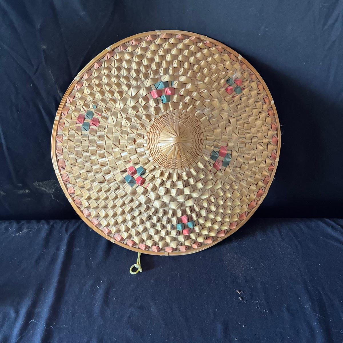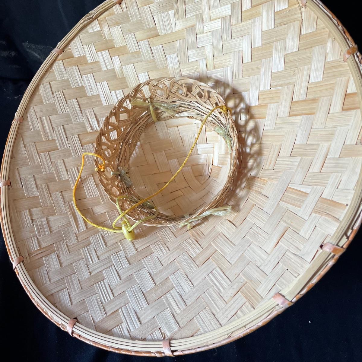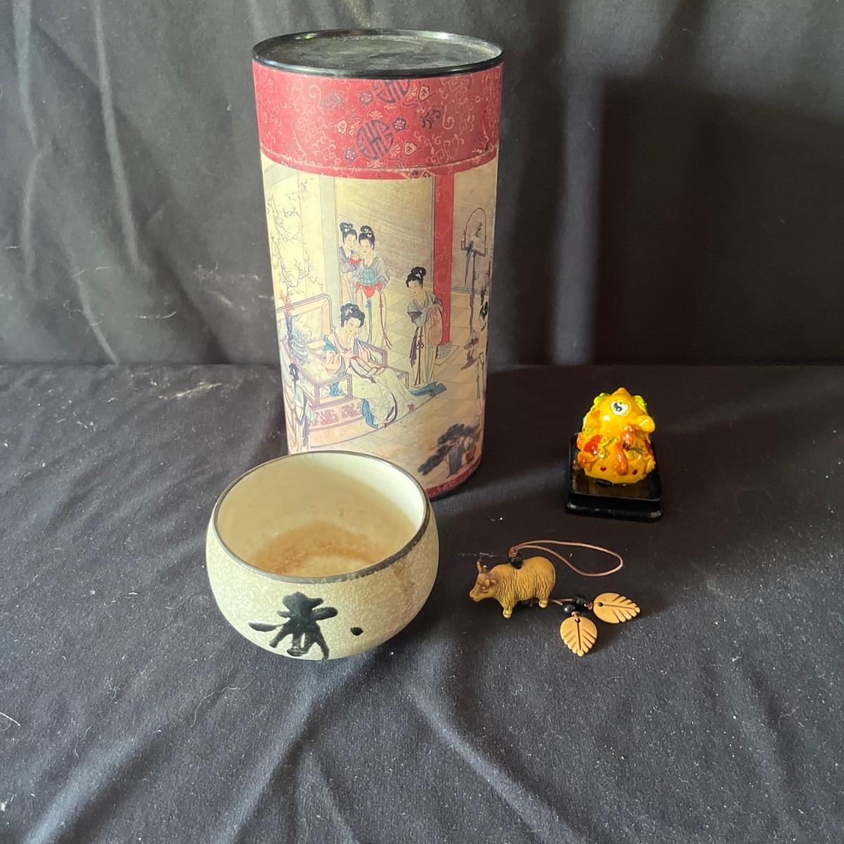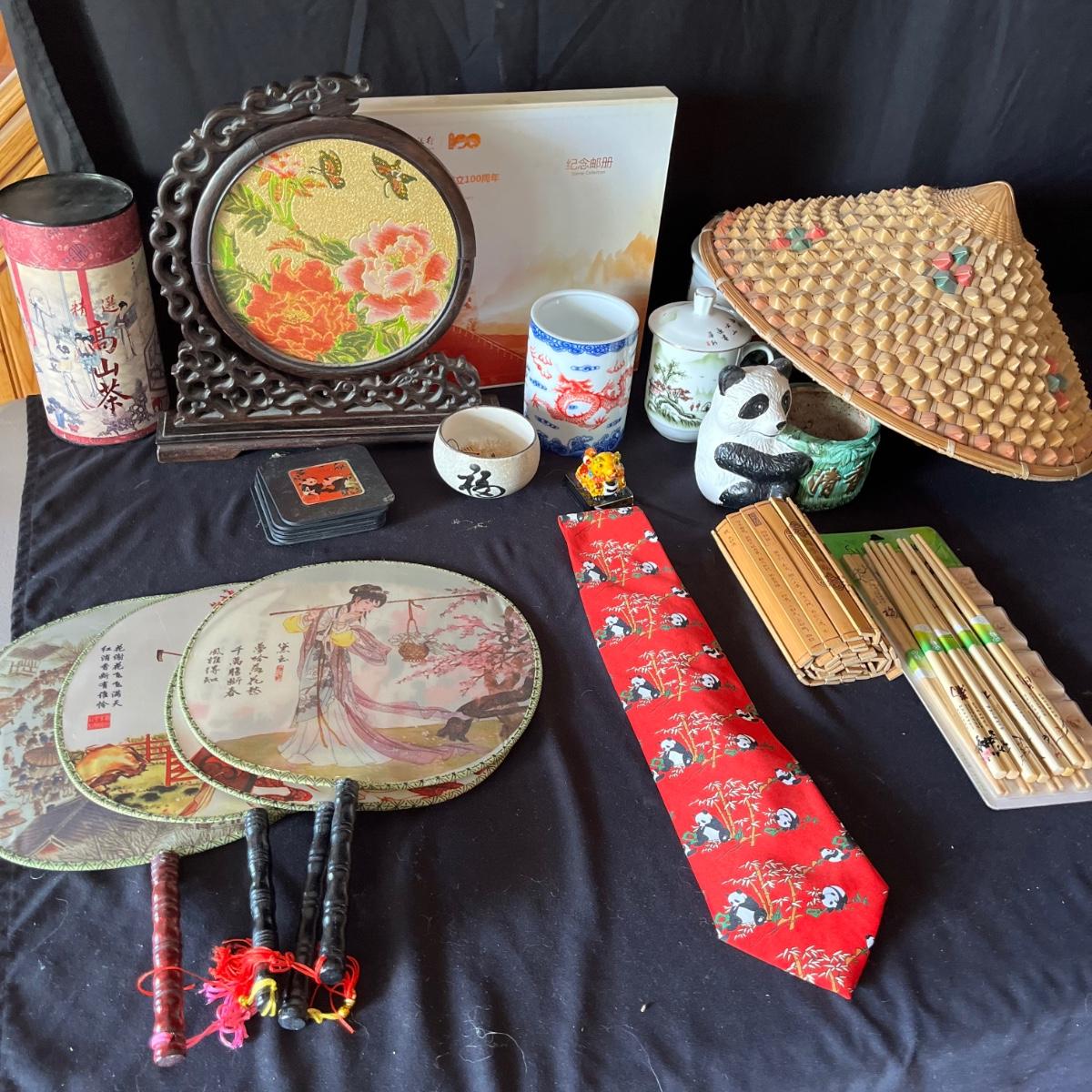 Lot includes ceramic cup, jar, plant pot, straw hat, Art Of War bamboo scroll, panda ceramic plant pot, decorative wooden display stand with fabric under glass, wooden chopsticks, tie and more. Hat measures 16”D x 7”.