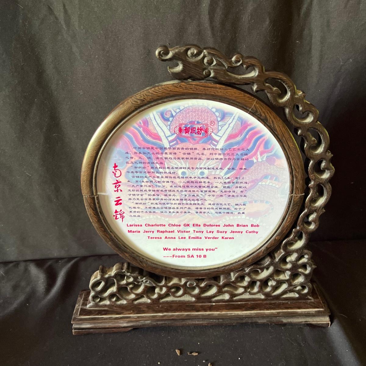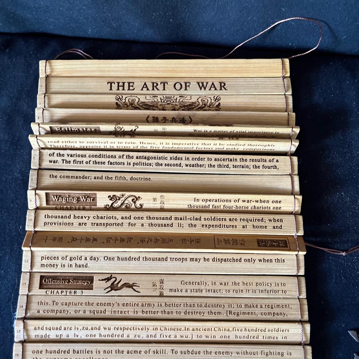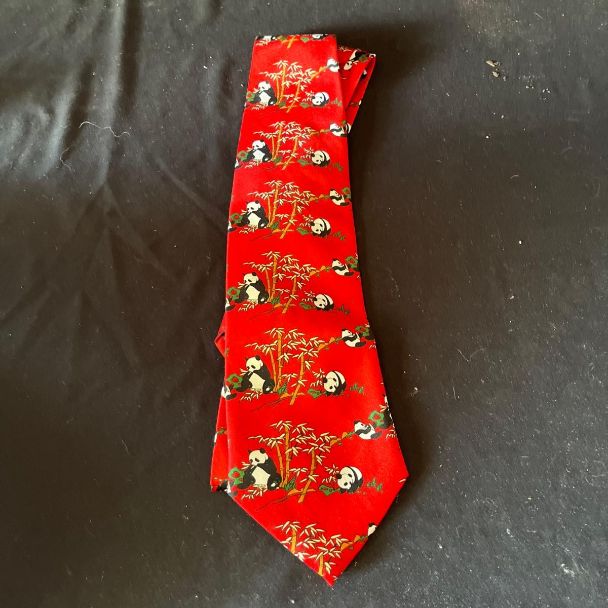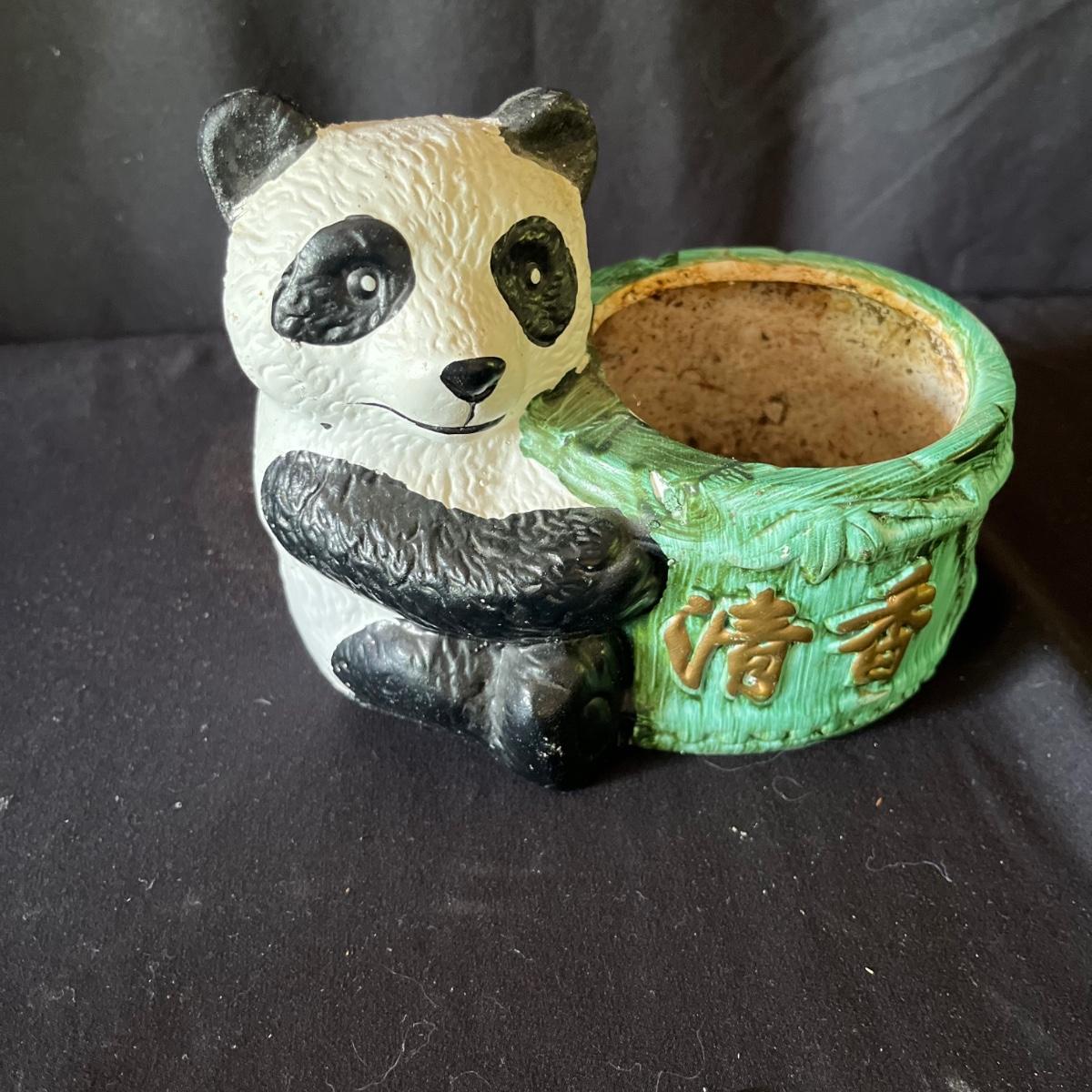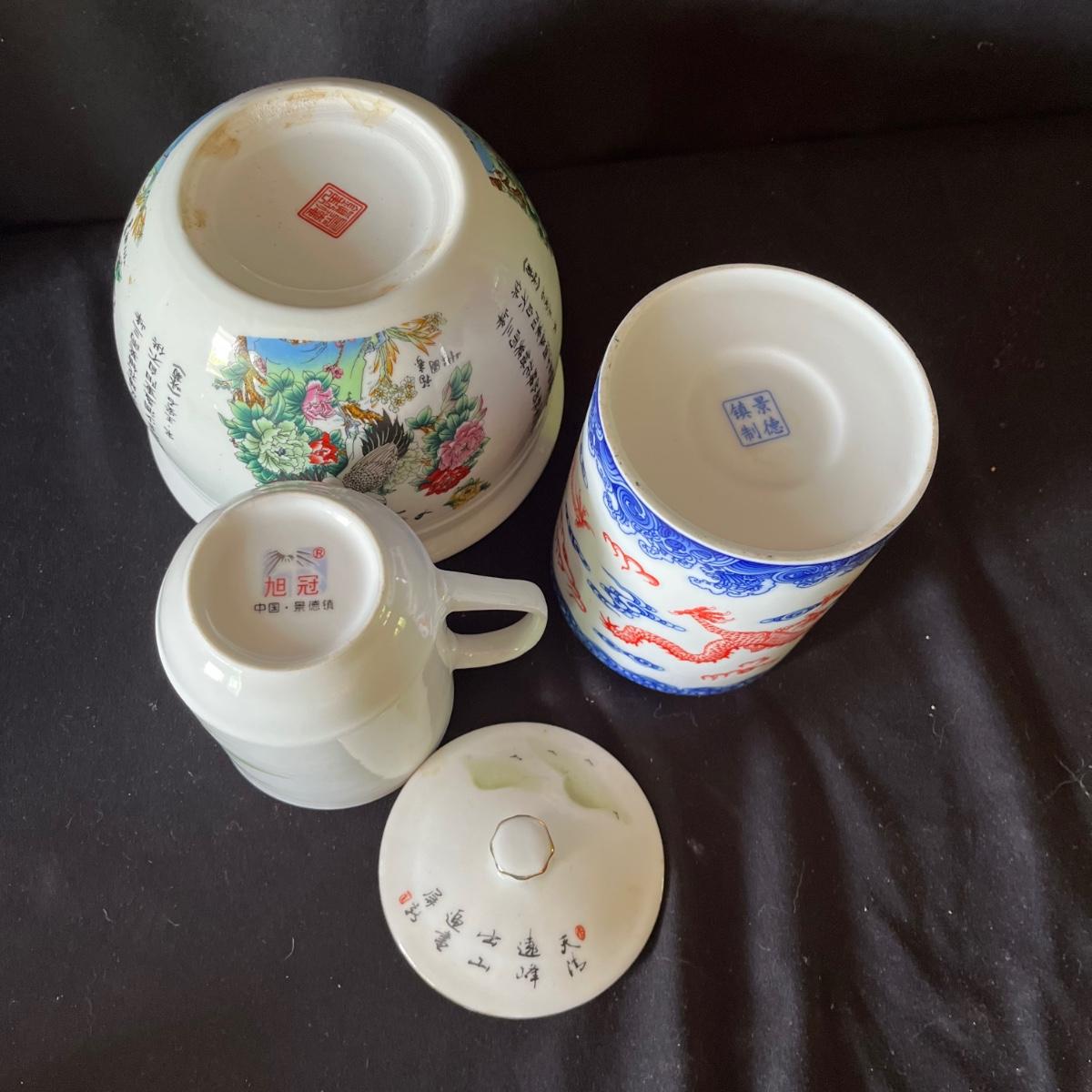 Lot includes ceramic cup, jar, plant pot, straw hat, Art Of War bamboo scroll, panda ceramic plant pot, decorative wooden display stand with fabric under glass, wooden chopsticks, tie and more. Hat measures 16”D x 7”.