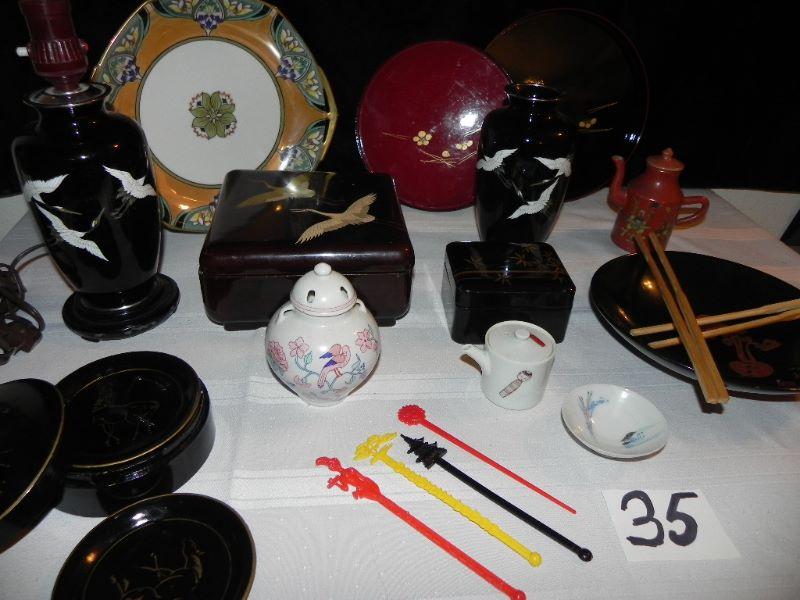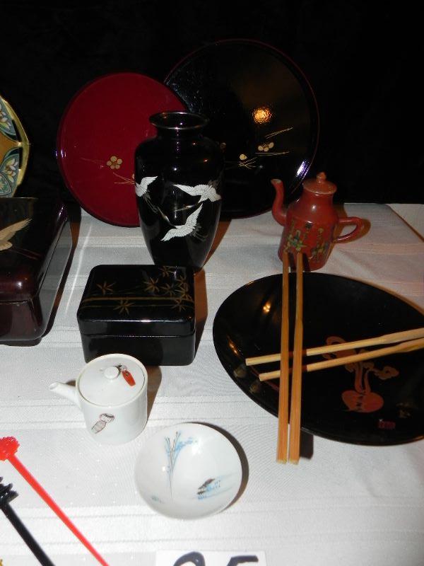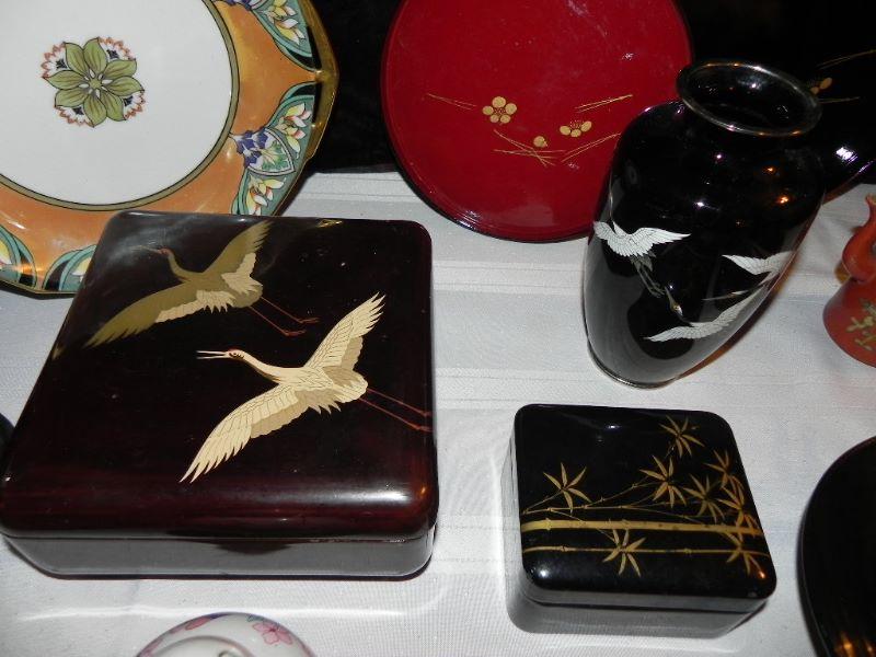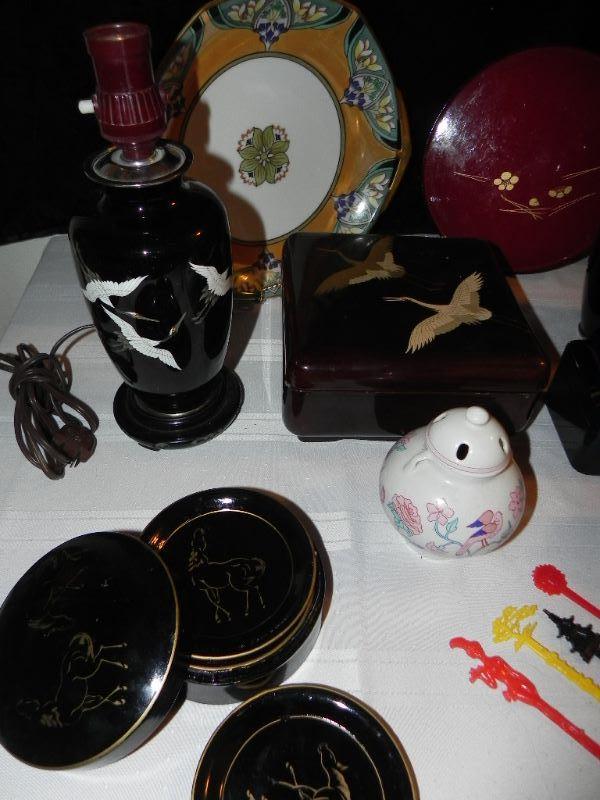 Boxes, trays, vase, lamp, teapots, coasters, and other