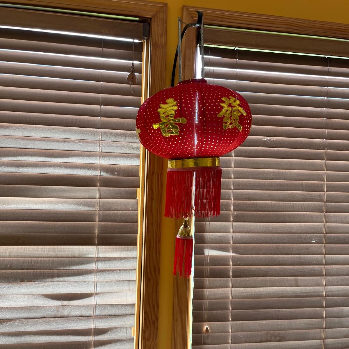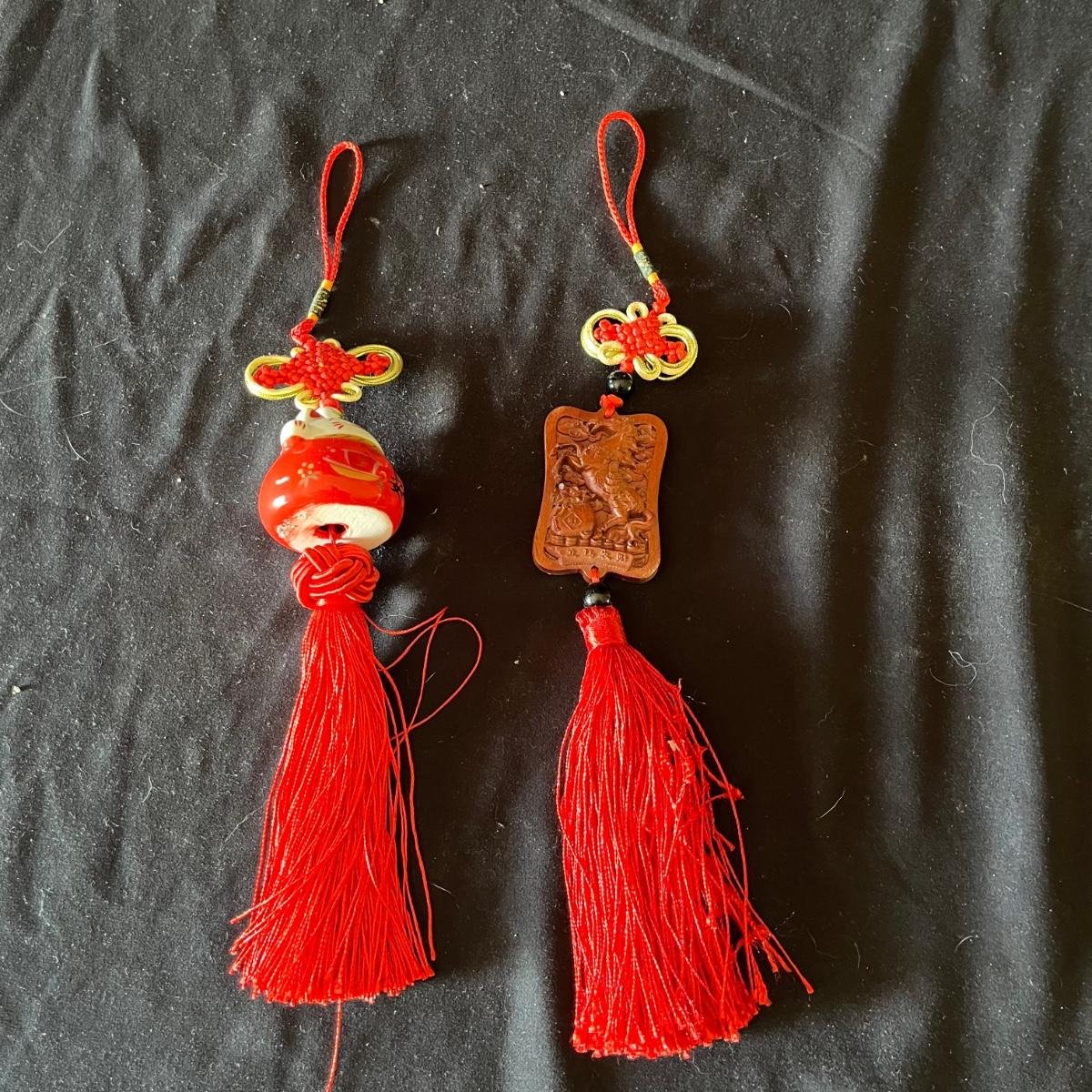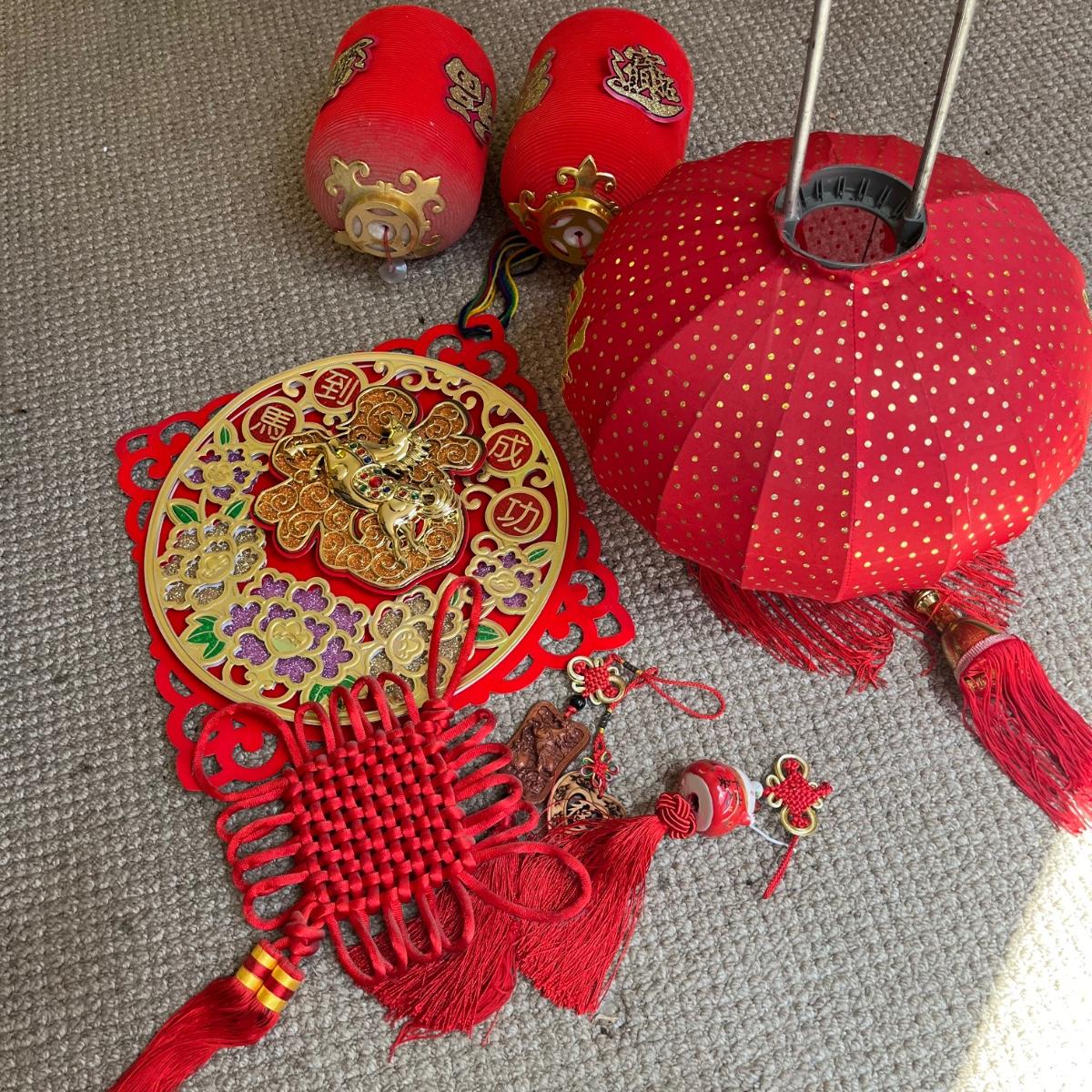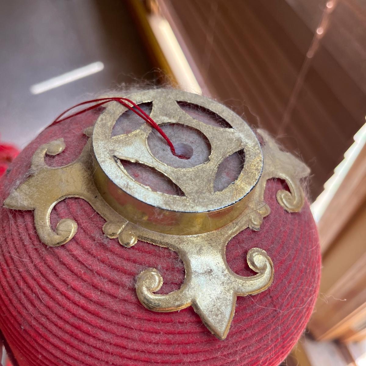 Lot includes a fabric covered shade, two matching hanging plastic decorations, two small carved wooden ornaments, pillow and more.