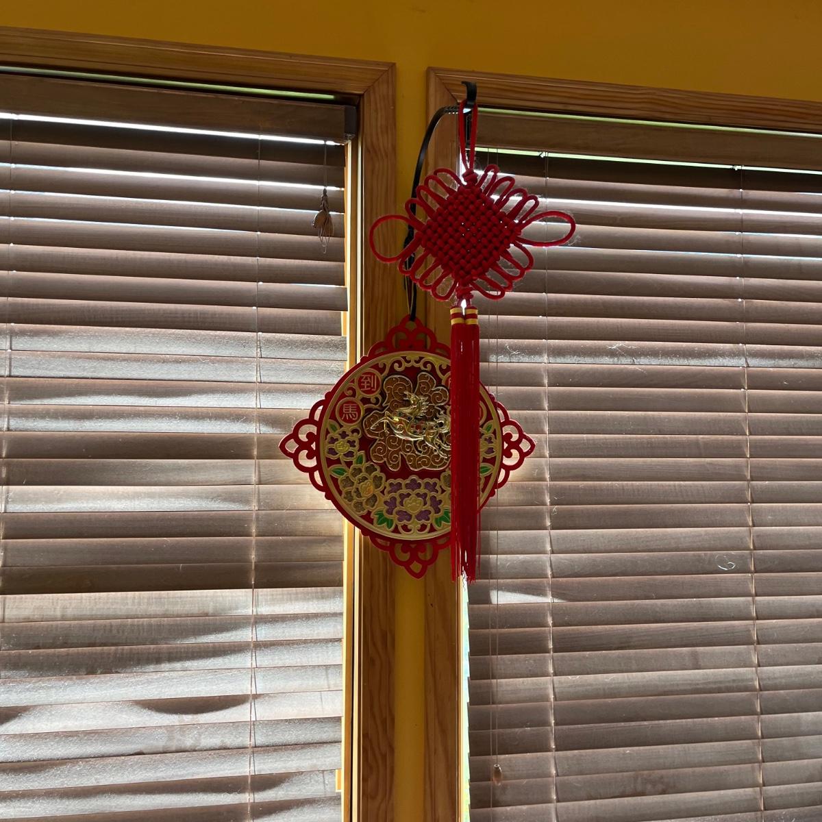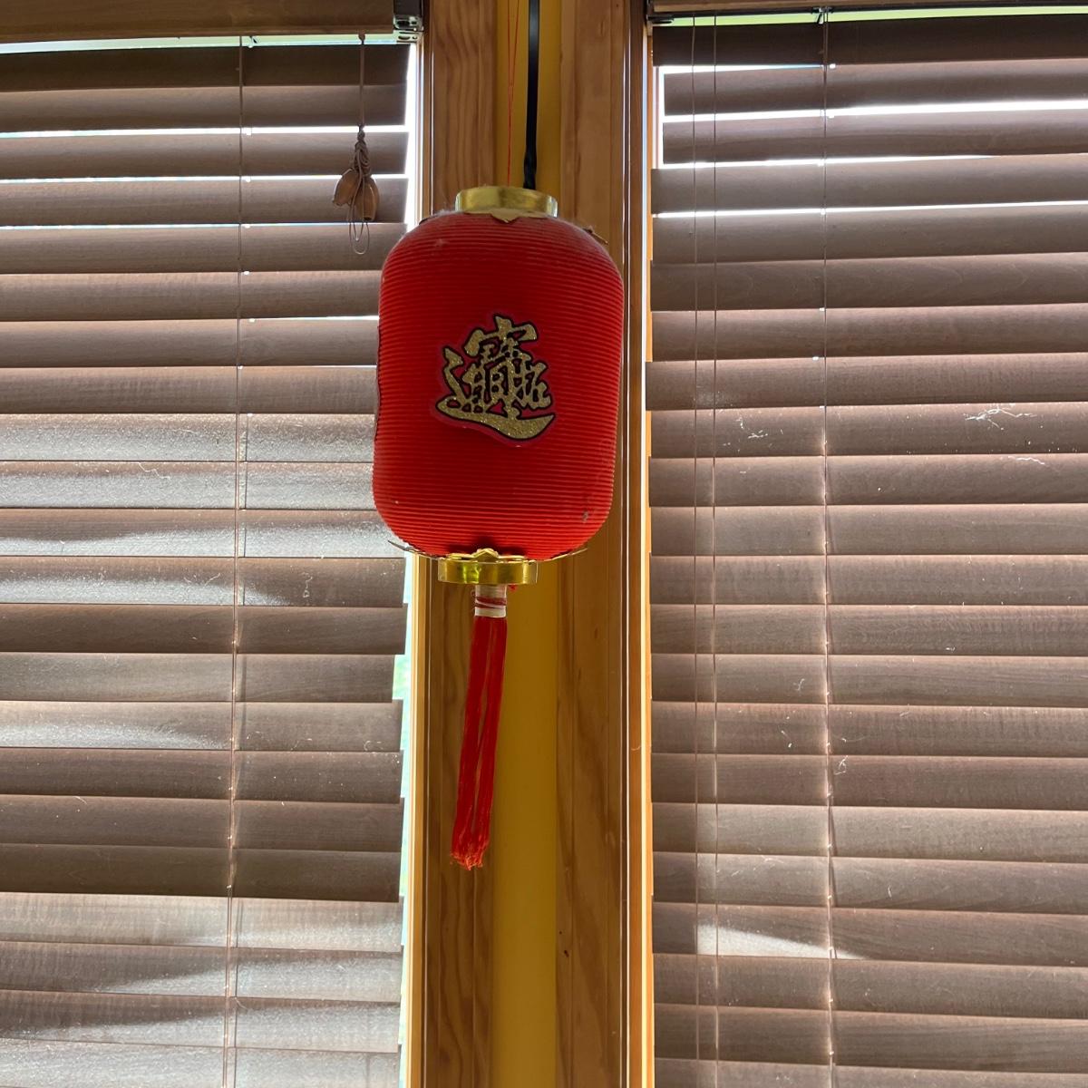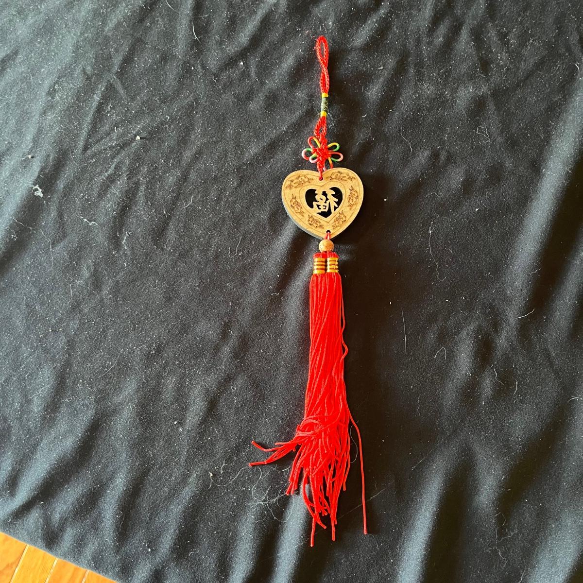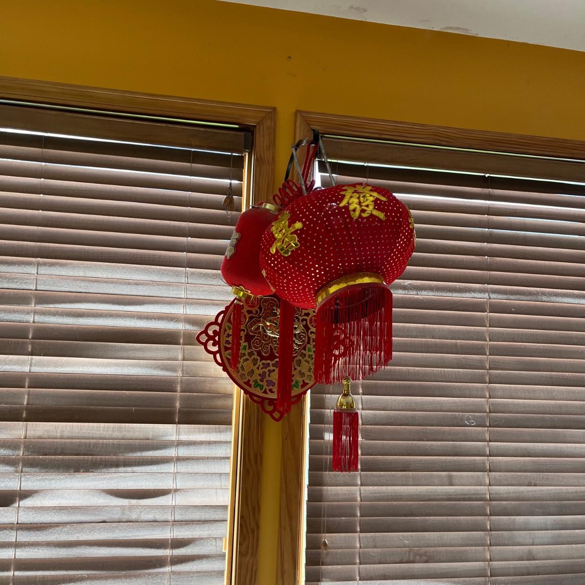 Lot includes a fabric covered shade, two matching hanging plastic decorations, two small carved wooden ornaments, pillow and more.