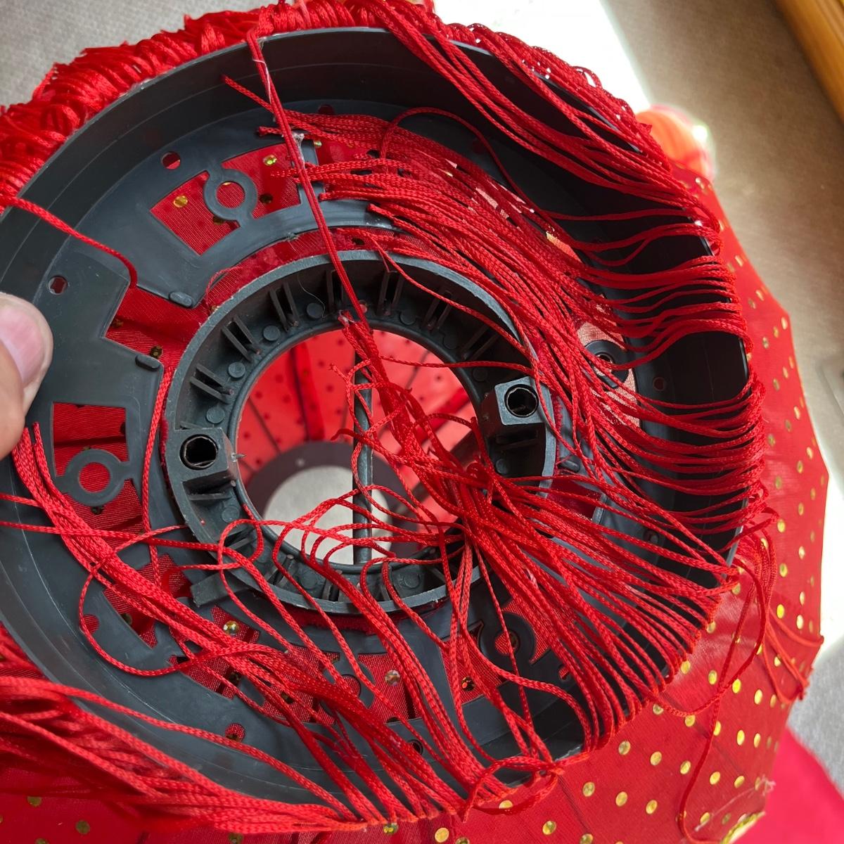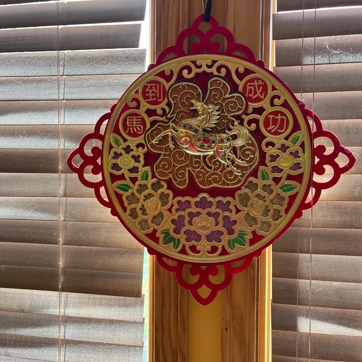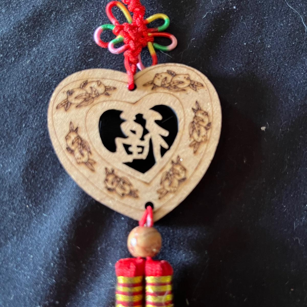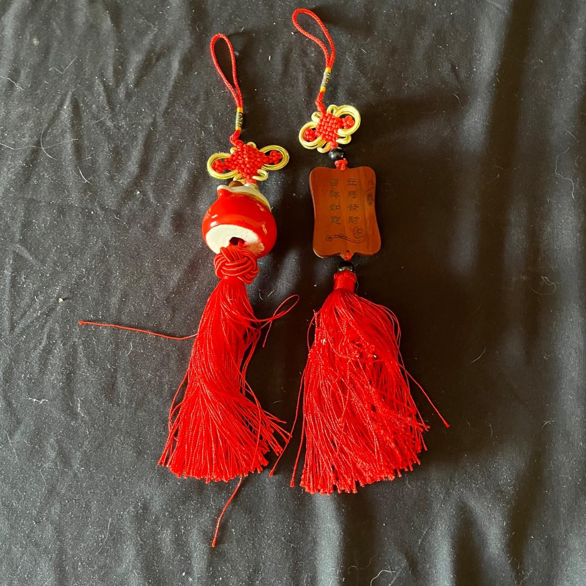 Lot includes a fabric covered shade, two matching hanging plastic decorations, two small carved wooden ornaments, pillow and more.