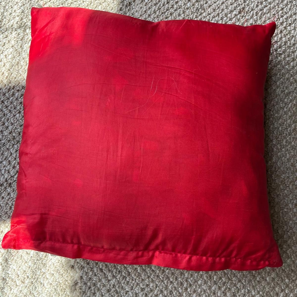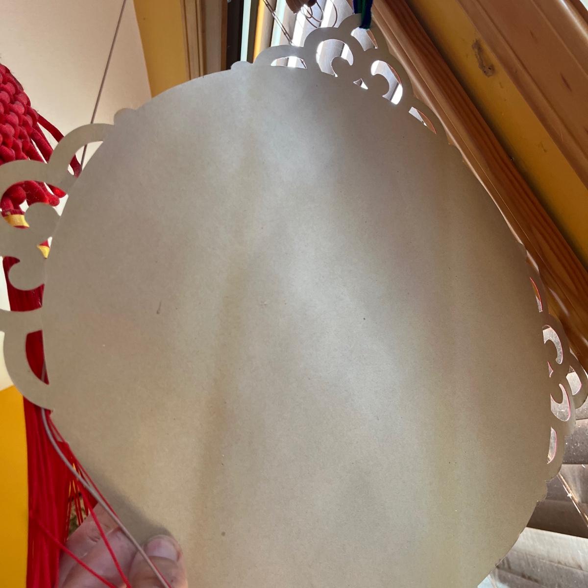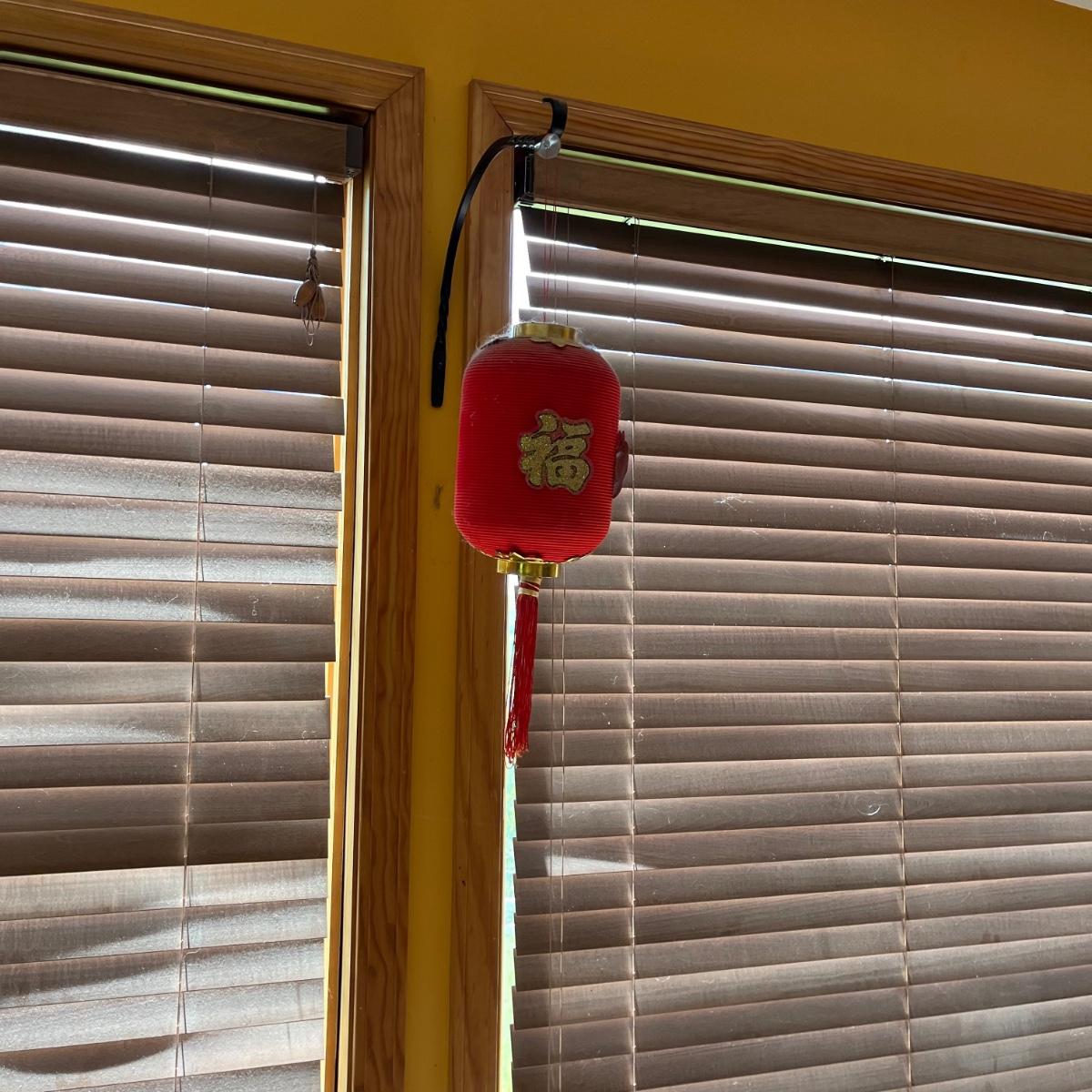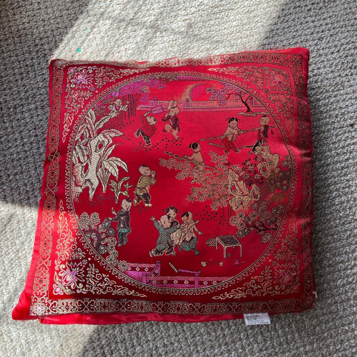 Lot includes a fabric covered shade, two matching hanging plastic decorations, two small carved wooden ornaments, pillow and more.