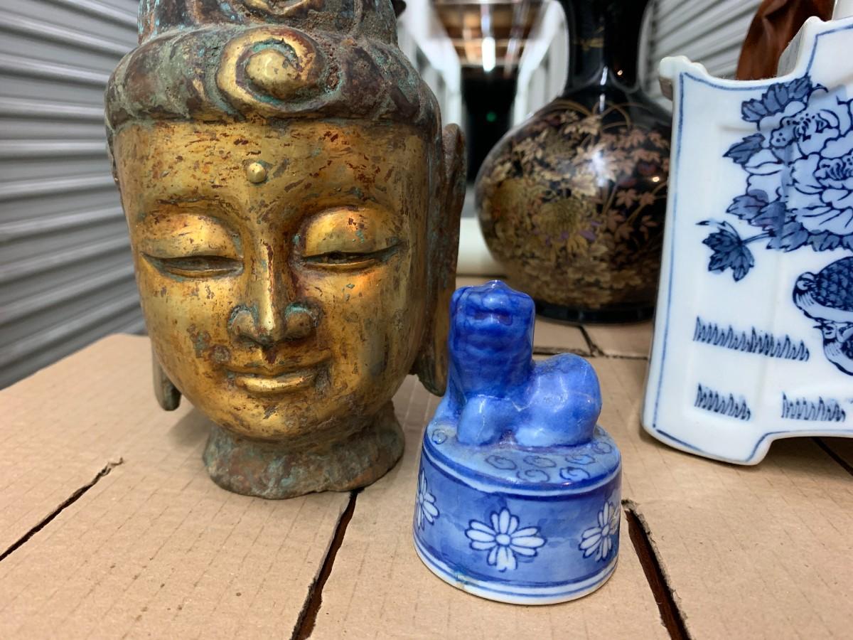 2 vases, black. Bronze Buddha head, 8"h, contemporary. Carved figure, Chinese scroll, painted white vase, seated buddha figure.