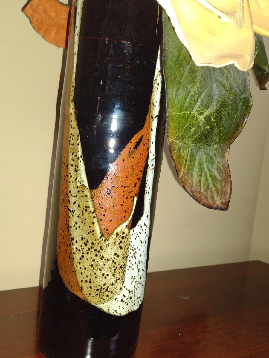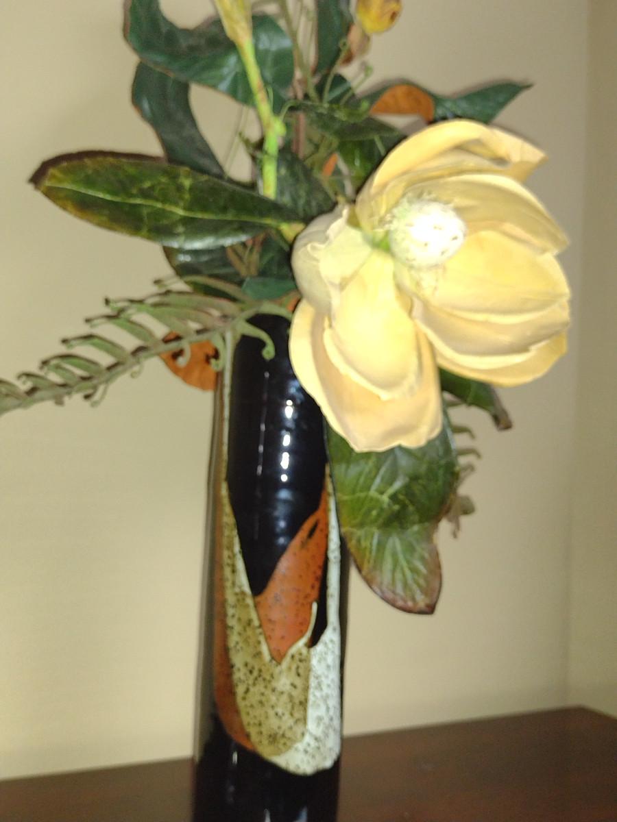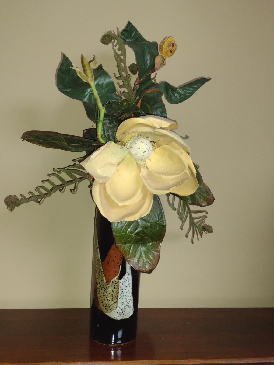 Asian Design Pottery Vase with Artificial Flower Arrangement. Vase is approx 13" tall.