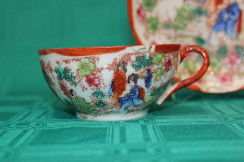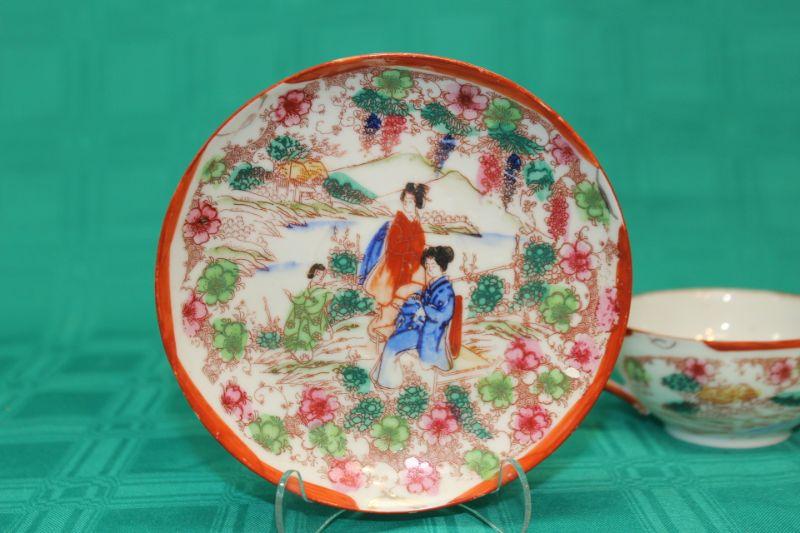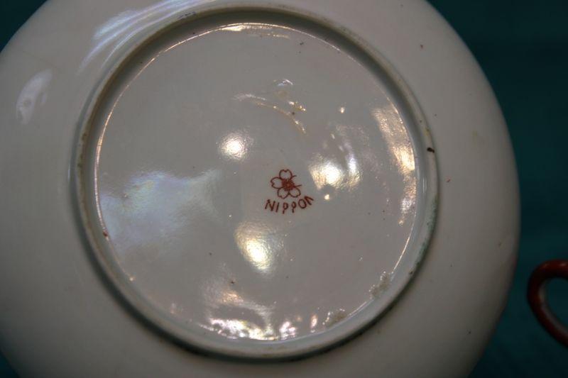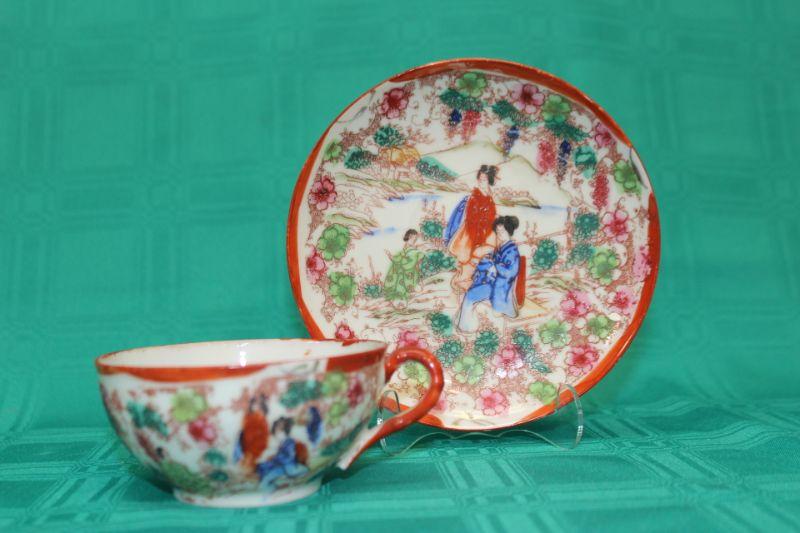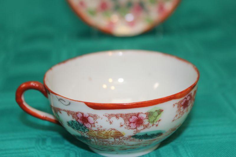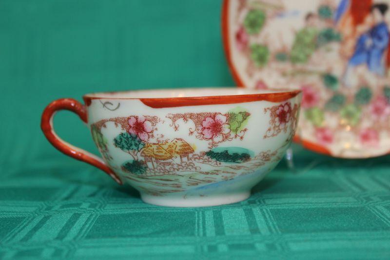 Beautiful hand painted Asian style tea cup & saucer. Orange edge with floral scenery design. Stamped "Nippon" on back of plate. No chips.