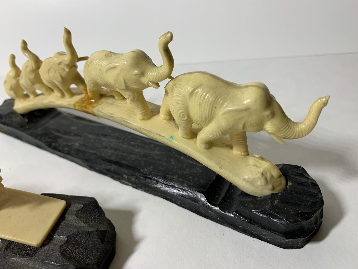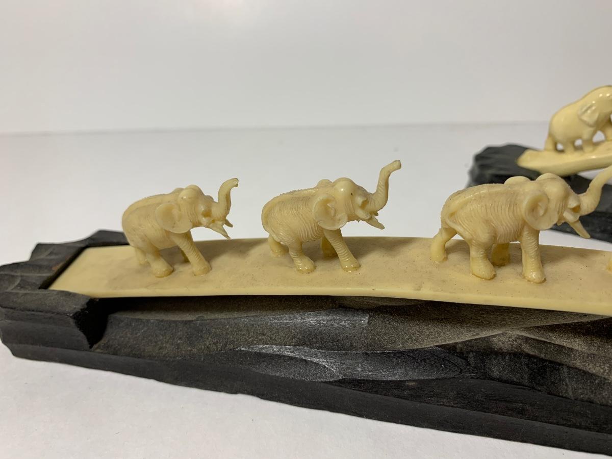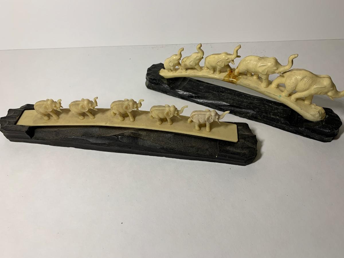 Two groups of carved elephants waking in line on carved wooden bases