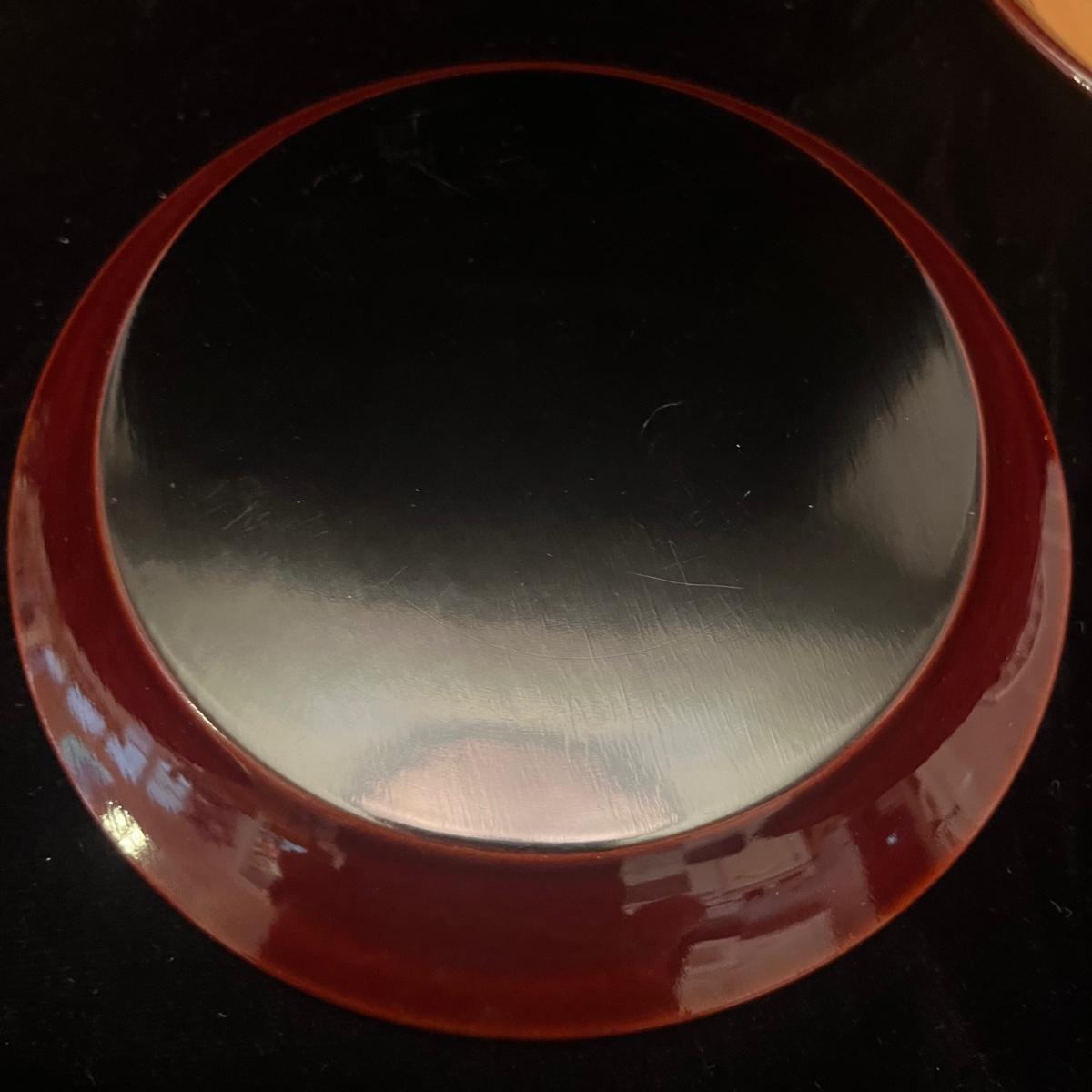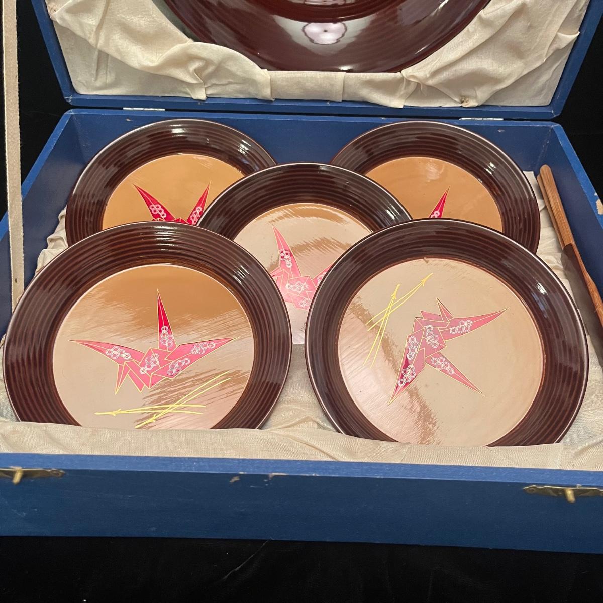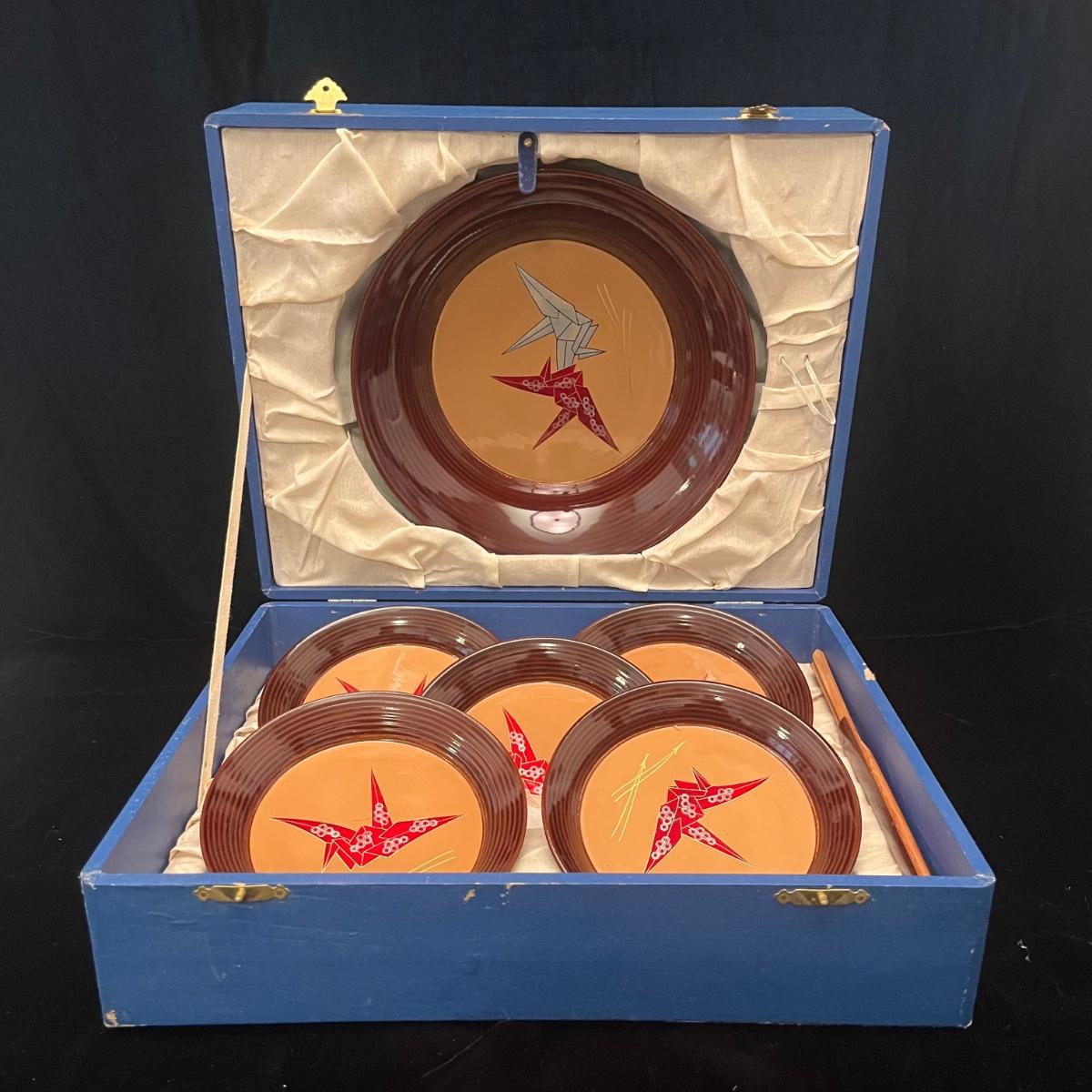 Lot includes five small plates and a larger bowl with wooden carrying case. All pieces appear to be enameled wood. Also includes a pair of wooden chopsticks. Bowl measures 9”D x 2”H.